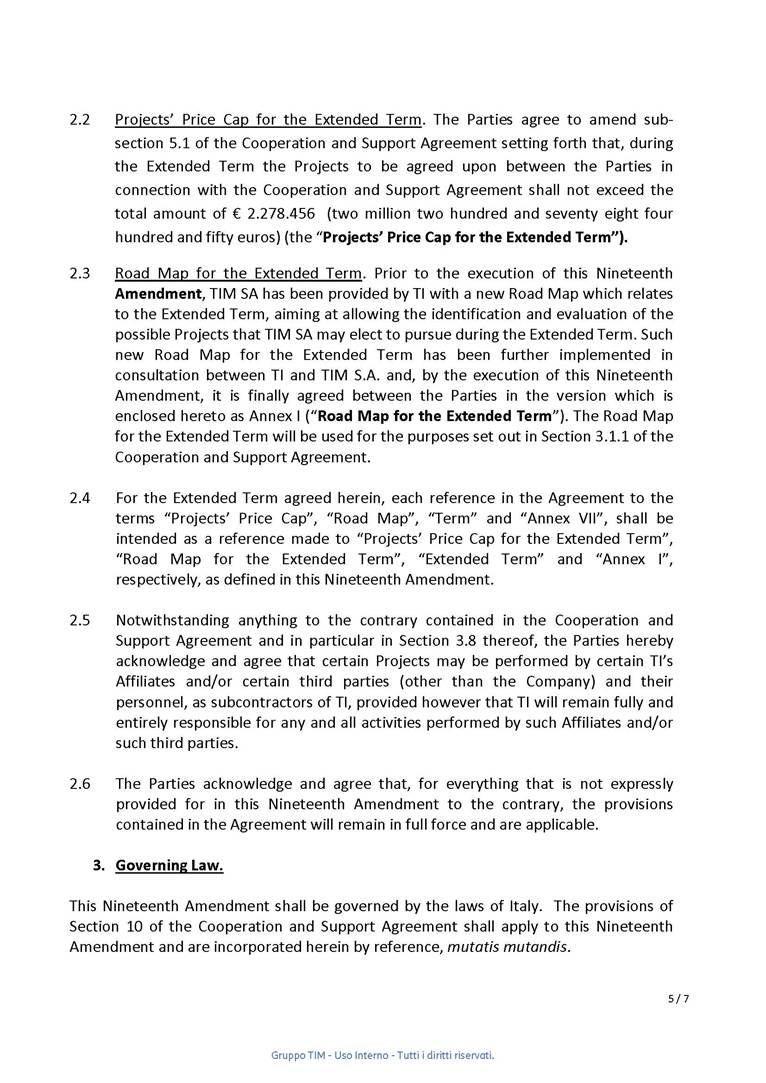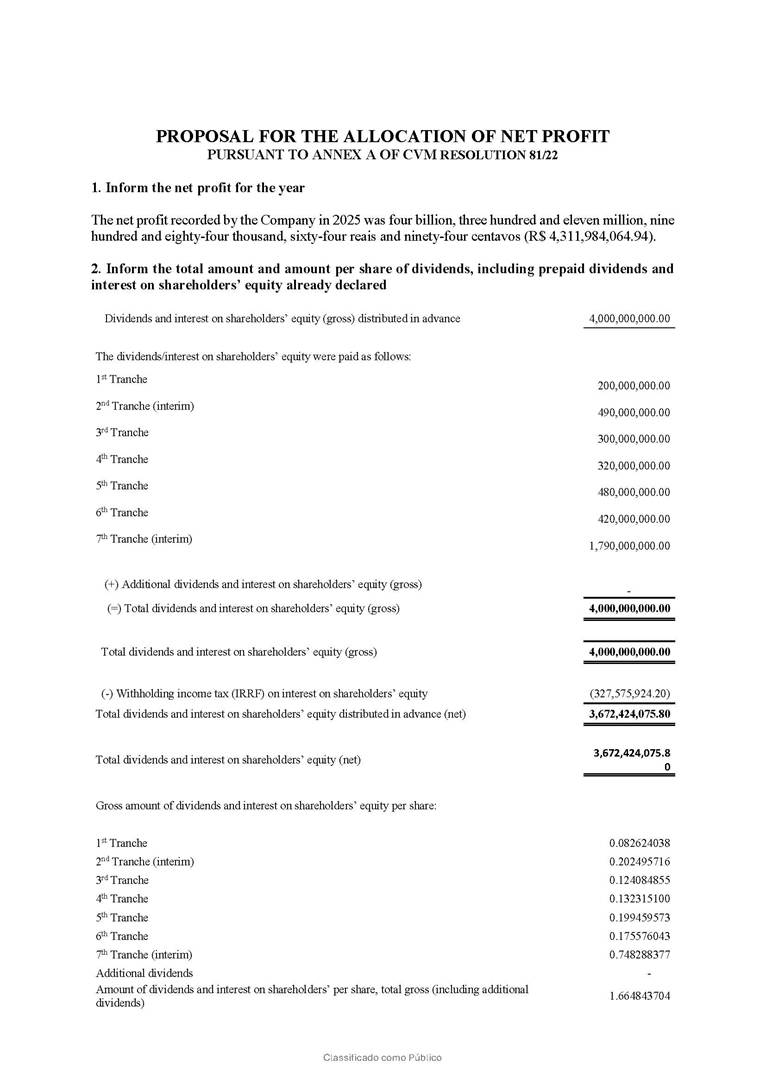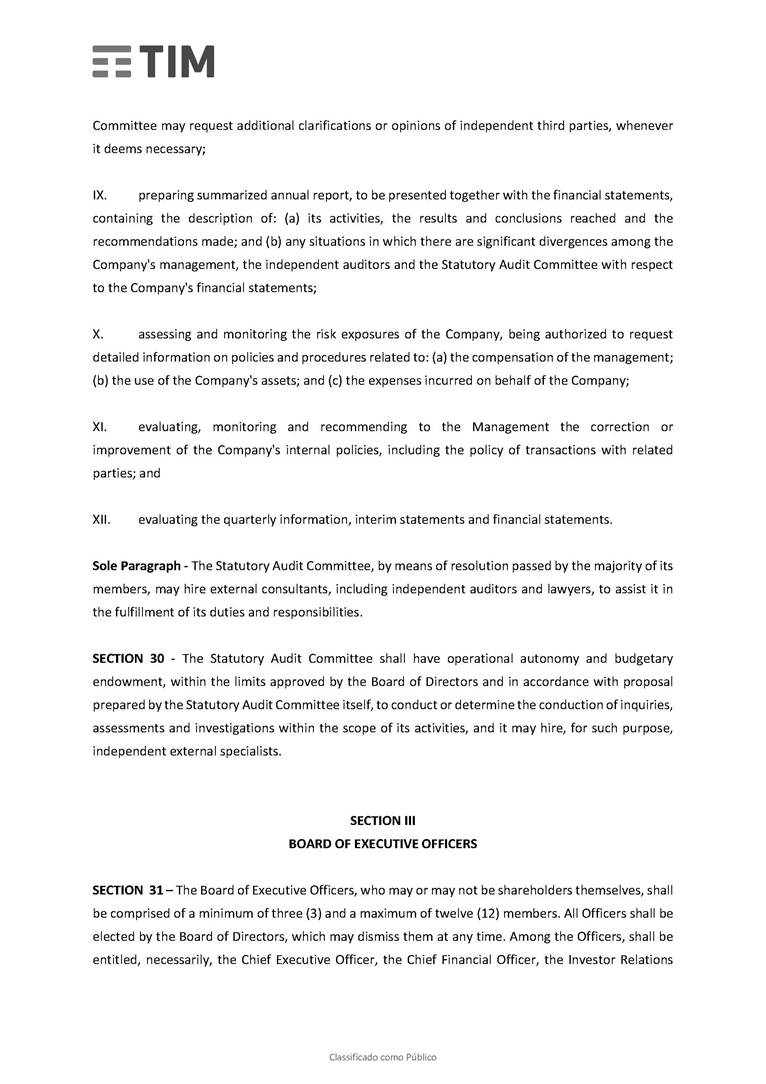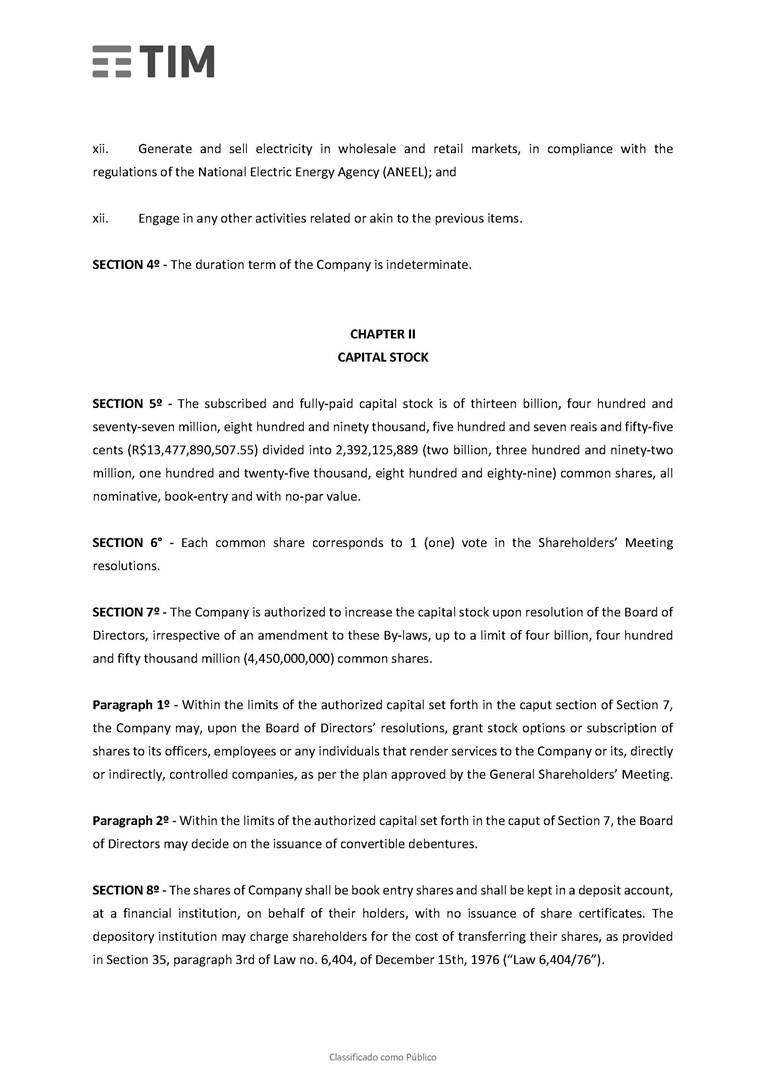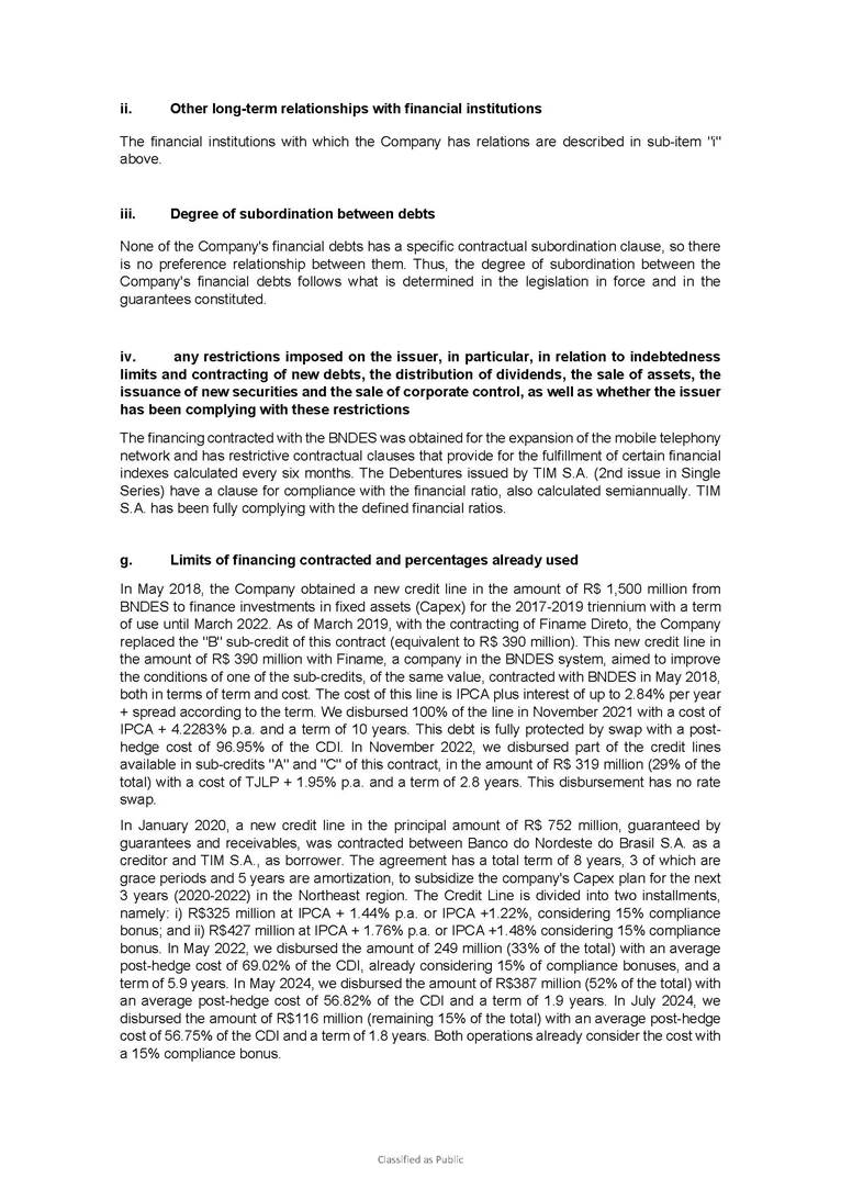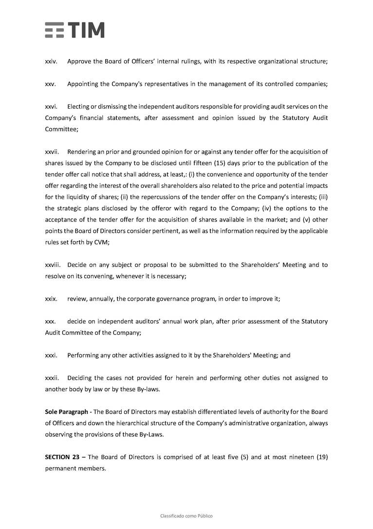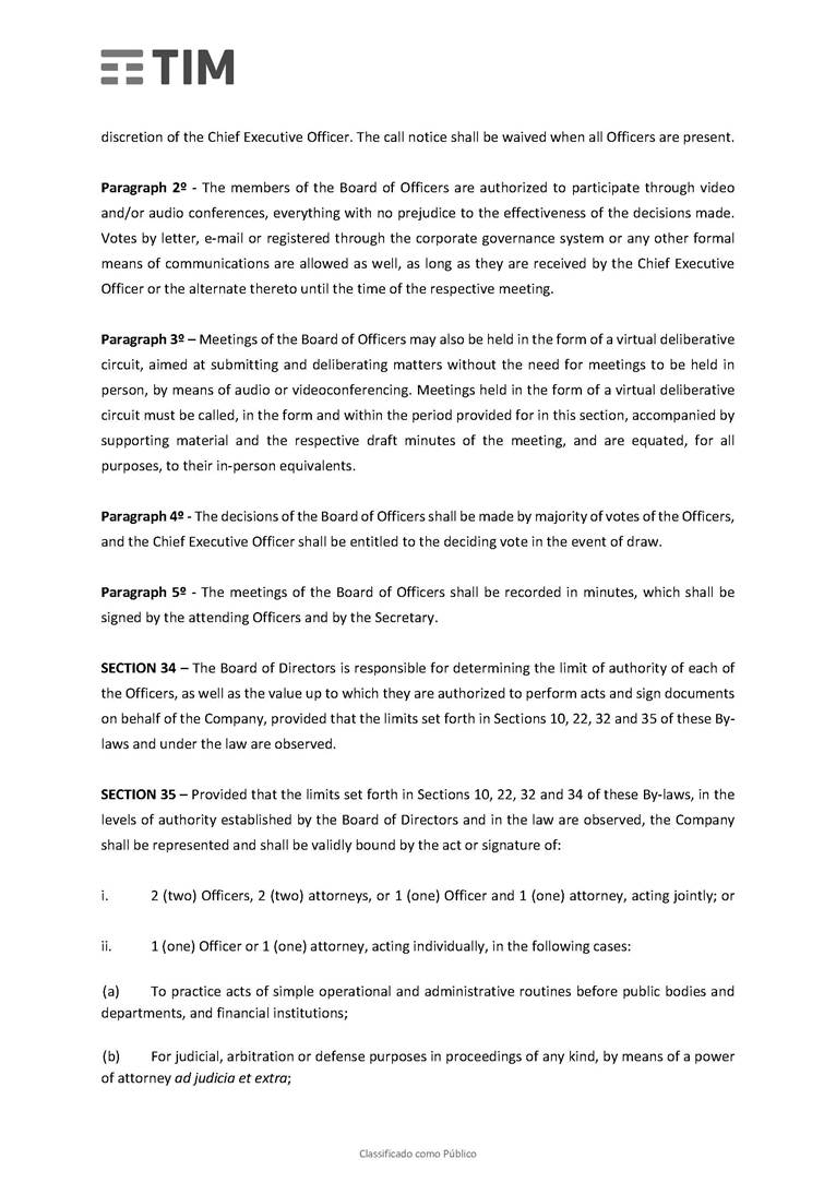 Management Proposal AGM/ EGM 2026 Annual and Extraordinary Shareholders’ Meeting March 31st, 2026 Time: 02h30 p.m. Location: Avenida João Cabral de Mello Neto, nº 850, South Tower, 13th floor, Barra da Tijuca, in the City and State of Rio de Janeiro Summary Item Subject Page 1. Call Notice 04 2. Management’s report and Consolidated Financial Statements of the Company, dated as of December 31st, 2025 09 3. Item 2 from the Reference Form 11 4. Proposal for the allocation of the results related to the fiscal year 2025 by the Company 26 5. To ratify the appointments of the Company’s Board of Directors’ Members, previously appointed at the Board of Directors’ Meetings held on November 3rd, 2025 and February 25th, 2026 6. Appointed to the positions of effective members and respective alternates of the Company's Fiscal Council 39 7. Compensation Proposal for the Company’s Administrators and Fiscal Council members for the year of 2026 49 8. Item 8 from the Reference Form 52 9. Proposal of extension of the Cooperation and Support Agreement 79 10. Fairness Evaluation of the Cooperation and Support Agreement 81 11. 19th Amendment to the Cooperation and Support Agreement 101 12. Proposal to amendment and restatement of the Company’s By-laws 109 36 01 – Call Notice 1 TIM S.A. Publicly-Held Company CNPJ/MF 02.421.421/0001-11 NIRE 333.0032463-1 CALL NOTICE ANNUAL AND EXTRAORDINARY GENERAL SHAREHOLDERS’ MEETING The Shareholders of TIM S.A. (“Company”) are called upon, as set forth in Section 124 of Law No. 6,404/1976, to attend the Company’s Annual and Extraordinary Shareholders’ Meeting to be held on March 31st, 2026, at 2:30 pm, at Avenida João Cabral de Mello Neto, nº 850, South Tower, 13th floor, Barra da Tijuca, in the City and State of Rio de Janeiro, in order to resolve on the following Agenda: On Annual Shareholders’ Meeting: (1) To resolve on the management’s report and the financial statements of the Company for the fiscal year ended on December 31st, 2025; (2) To resolve on the management’s proposal for the allocation of the results of the 2025 fiscal year and the distribution of dividends by the Company; (3) To resolve on the classification of the candidate for the position of independent member of the Board of Directors according to the independence criteria of the Novo Mercado Regulations of B3 S.A. - Brasil Bolsa, Balcão ("Novo Mercado Regulations"); (4) To ratify the appointments of the Company’s Board of Directors’ Members, previously appointed at the Board of Directors’ Meetings held on November 3rd, 2025 and February 25th, 2026; (5) To resolve on the composition of the Fiscal Council of the Company; (6) To elect the effective and alternate members of the Fiscal Council; and (7) To resolve on the compensation proposal for the Company’s management, members of Committees and members of the Fiscal Council of the Company for the 2026 fiscal year. 2 On Extraordinary Shareholders’ Meeting: (1) To resolve on the proposal for the extension of the Cooperation and Support Agreement, through the execution of its 19th amendment, to be entered into between Telecom Italia S.p.A., on the one hand, and the Company, on the other hand; and (2) To resolve on the reform and consolidation of the Company’s By-laws. General Instructions: 1. All documents and information regarding the subjects to be analyzed and resolved on at the Shareholders’ Meeting are at the Shareholders disposal at the Company’s head office, as well as on the websites www.tim.com.br/ri, www.cvm.gov.br, www.b3.com.br/pt_br/ and www.sec.gov. 2. The Ordinary and Extraordinary General Meeting will be held exclusively in person, according with the practice adopted by the Company in its meetings, with a view to ensuring full engagement, transparency and effectiveness in the resolutions. In this context, shareholders may participate in person or represented by a duly constituted proxy, according to the provisions of Section 126 of Law No. 6,404/1976 and of §§ 1 and 2 of Section 12 of the Company's By-laws, as well as by distance voting ballot, according the detailed guidelines below: a. In-person: The shareholder who chooses to participate the General Meeting in person must express your intention by sending a copy of the identity document proving your identity (ID card and CPF) by e-mail to ri@timbrasil.com.br within up to two (2) business days prior to the Shareholders' Meeting; b. By proxy: The Shareholder to be represented at the Shareholders' Meeting must send the respective supporting documentation by email to ri@timbrasil.com.br within up to two (2) business days prior to the Shareholders' Meeting: Natural person: i. A power of attorney with specific powers, signed in one's own hand, with a notarized signature, or electronically, using ICP-Brasil certification; and ii. Identity card and CPF number of the proxy. 3 Legal Entity: (i) Power of attorney with specific powers, signed by the individual, with a notarized signature, or electronically, using ICP-Brasil certification; (ii) Last bylaws or consolidated articles of association and corporate documents proving the legal representation of the legal entity shareholder or, if an investment fund, the bylaws or consolidated articles of association of its administrator or manager, as the case may be, the corporate documents proving the administrator's or manager's powers of representation and the investment fund's current regulations; and (iii) Identity card and CPF number of the proxy. Representative of Corporate Shareholder/Investment Fund: (i) Last bylaws or consolidated articles of association and corporate documents proving the legal representation of the legal entity shareholder or, if an investment fund, the bylaws or consolidated articles of association of its administrator or manager, as the case may be, the corporate documents proving the administrator's or manager's powers of representation and the current regulations of the inv