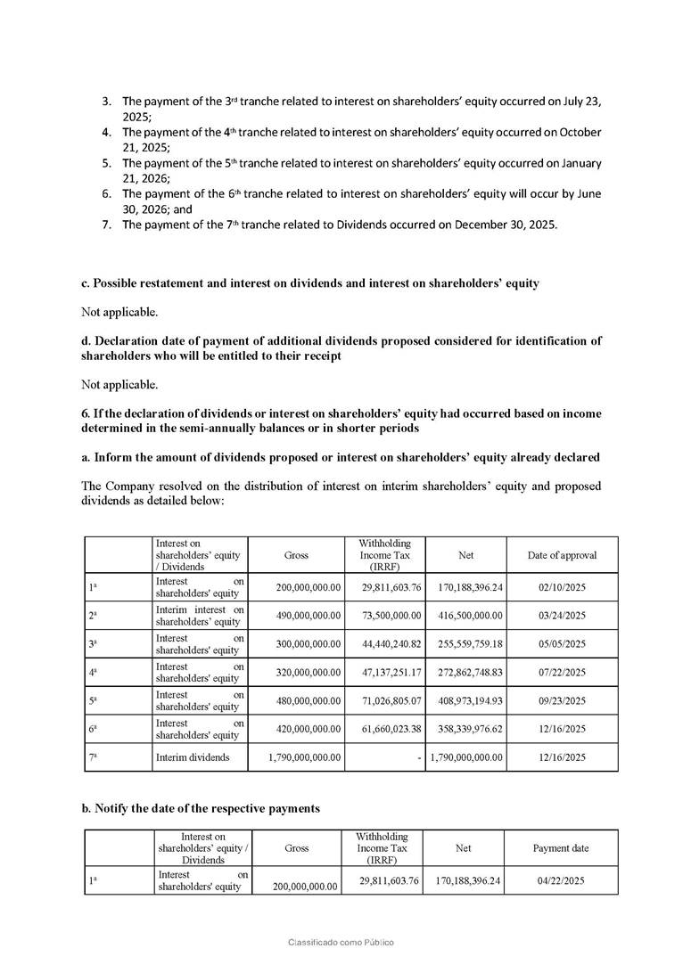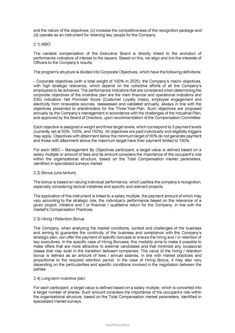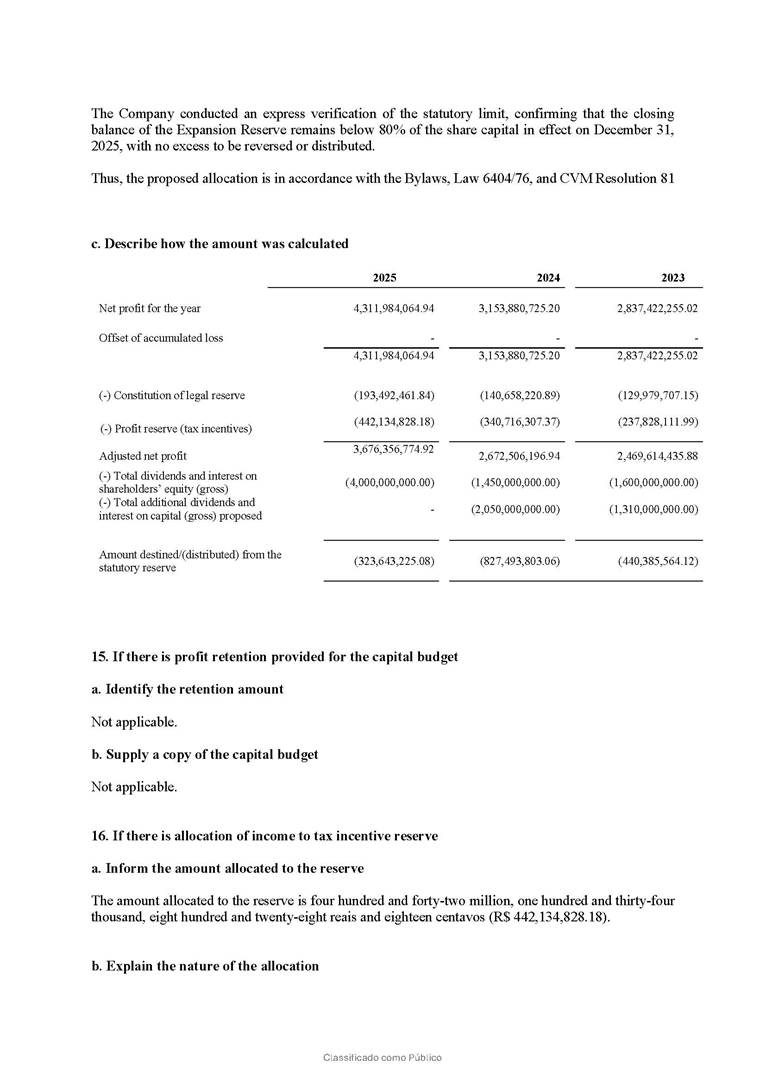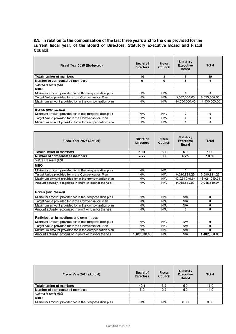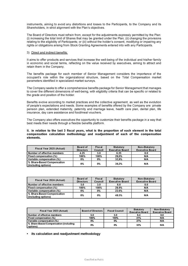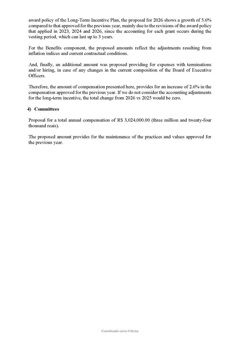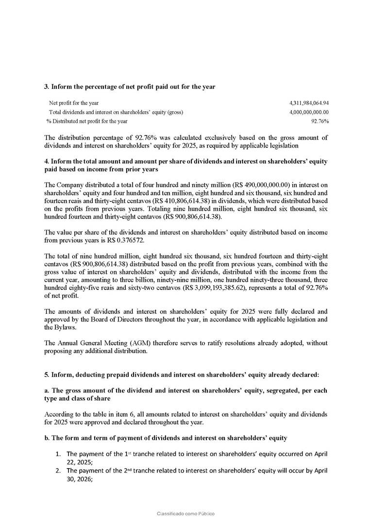 Management Proposal AGM/ EGM 2026 Annual and Extraordinary Shareholders’ Meeting March 31st, 2026 Time: 02h30 p.m. Location: Avenida João Cabral de Mello Neto, nº 850, South Tower, 13th floor, Barra da Tijuca, in the City and State of Rio de Janeiro Summary Item Subject Page 1. Call Notice 04 2. Management’s report and Consolidated Financial Statements of the Company, dated as of December 31st, 2025 09 3. Item 2 from the Reference Form 11 4. Proposal for the allocation of the results related to the fiscal year 2025 by the Company 26 5. To ratify the appointments of the Company’s Board of Directors’ Members, previously appointed at the Board of Directors’ Meetings held on November 3rd, 2025 and February 25th, 2026 6. Appointed to the positions of effective members and respective alternates of the Company's Fiscal Council 39 7. Compensation Proposal for the Company’s Administrators and Fiscal Council members for the year of 2026 49 8. Item 8 from the Reference Form 52 9. Proposal of extension of the Cooperation and Support Agreement 79 10. Fairness Evaluation of the Cooperation and Support Agreement 81 11. 19th Amendment to the Cooperation and Support Agreement 101 12. Proposal to amendment and restatement of the Company’s By-laws 109 36 01 – Call Notice 1 TIM S.A. Publicly-Held Company CNPJ/MF 02.421.421/0001-11 NIRE 333.0032463-1 CALL NOTICE ANNUAL AND EXTRAORDINARY GENERAL SHAREHOLDERS’ MEETING The Shareholders of TIM S.A. (“Company”) are called upon, as set forth in Section 124 of Law No. 6,404/1976, to attend the Company’s Annual and Extraordinary Shareholders’ Meeting to be held on March 31st, 2026, at 2:30 pm, at Avenida João Cabral de Mello Neto, nº 850, South Tower, 13th floor, Barra da Tijuca, in the City and State of Rio de Janeiro, in order to resolve on the following Agenda: On Annual Shareholders’ Meeting: (1) To resolve on the management’s report and the financial statements of the Company for the fiscal year ended on December 31st, 2025; (2) To resolve on the management’s proposal for the allocation of the results of the 2025 fiscal year and the distribution of dividends by the Company; (3) To resolve on the classification of the candidate for the position of independent member of the Board of Directors according to the independence criteria of the Novo Mercado Regulations of B3 S.A. - Brasil Bolsa, Balcão ("Novo Mercado Regulations"); (4) To ratify the appointments of the Company’s Board of Directors’ Members, previously appointed at the Board of Directors’ Meetings held on November 3rd, 2025 and February 25th, 2026; (5) To resolve on the composition of the Fiscal Council of the Company; (6) To elect the effective and alternate members of the Fiscal Council; and (7) To resolve on the compensation proposal for the Company’s management, members of Committees and members of the Fiscal Council of the Company for the 2026 fiscal year. 2 On Extraordinary Shareholders’ Meeting: (1) To resolve on the proposal for the extension of the Cooperation and Support Agreement, through the execution of its 19th amendment, to be entered into between Telecom Italia S.p.A., on the one hand, and the Company, on the other hand; and (2) To resolve on the reform and consolidation of the Company’s By-laws. General Instructions: 1. All documents and information regarding the subjects to be analyzed and resolved on at the Shareholders’ Meeting are at the Shareholders disposal at the Company’s head office, as well as on the websites www.tim.com.br/ri, www.cvm.gov.br, www.b3.com.br/pt_br/ and www.sec.gov. 2. The Ordinary and Extraordinary General Meeting will be held exclusively in person, according with the practice adopted by the Company in its meetings, with a view to ensuring full engagement, transparency and effectiveness in the resolutions. In this context, shareholders may participate in person or represented by a duly constituted proxy, according to the provisions of Section 126 of Law No. 6,404/1976 and of §§ 1 and 2 of Section 12 of the Company's By-laws, as well as by distance voting ballot, according the detailed guidelines below: a. In-person: The shareholder who chooses to participate the General Meeting in person must express your intention by sending a copy of the identity document proving your identity (ID card and CPF) by e-mail to ri@timbrasil.com.br within up to two (2) business days prior to the Shareholders' Meeting; b. By proxy: The Shareholder to be represented at the Shareholders' Meeting must send the respective supporting documentation by email to ri@timbrasil.com.br within up to two (2) business days prior to the Shareholders' Meeting: Natural person: i. A power of attorney with specific powers, signed in one's own hand, with a notarized signature, or electronically, using ICP-Brasil certification; and ii. Identity card and CPF number of the proxy. 3 Legal Entity: (i) Power of attorney with specific powers, signed by the individual, with a notarized signature, or electronically, using ICP-Brasil certification; (ii) Last bylaws or consolidated articles of association and corporate documents proving the legal representation of the legal entity shareholder or, if an investment fund, the bylaws or consolidated articles of association of its administrator or manager, as the case may be, the corporate documents proving the administrator's or manager's powers of representation and the investment fund's current regulations; and (iii) Identity card and CPF number of the proxy. Representative of Corporate Shareholder/Investment Fund: (i) Last bylaws or consolidated articles of association and corporate documents proving the legal representation of the legal entity shareholder or, if an investment fund, the bylaws or consolidated articles of association of its administrator or manager, as the case may be, the corporate documents proving the administrator's or manager's powers of representation and the current regulations of the inv