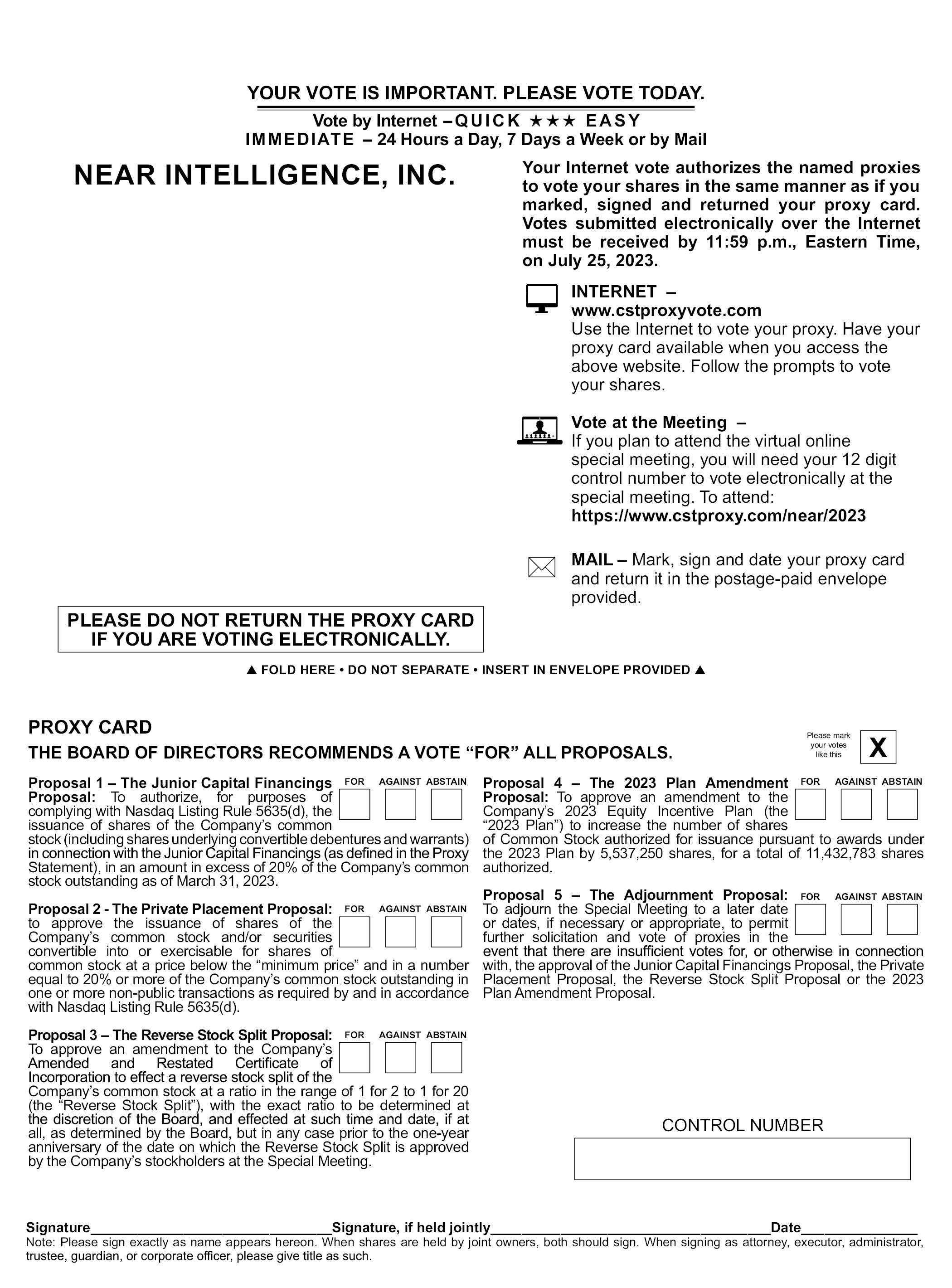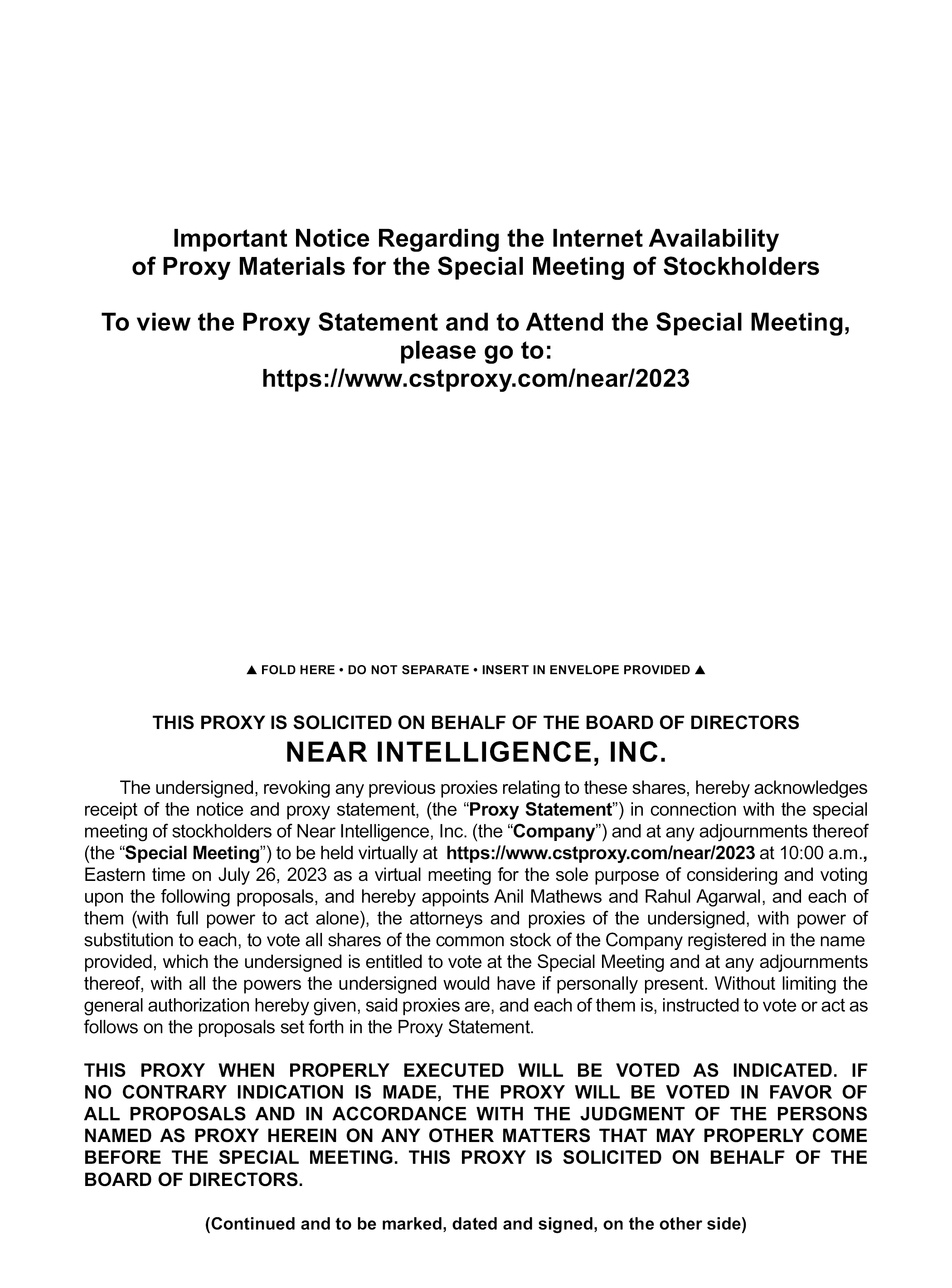 Important Notice Regarding the Internet Availability of Proxy Materials for the Special Meeting of Stockholders To view the Proxy Statement and to Attend the Special Meeting,please go to: https://www.cstproxy.com/near/2023 FOLD HERE • DO NOT SEPARATE • INSERT IN ENVELOPE PROVIDED THIS PROXY IS SOLICITED ON BEHALF OF THE BOARD OF DIRECTORS NEAR INTELLIGENCE, INC. The undersigned, revoking any previous proxies relating to these shares, hereby acknowledges receipt of the notice and proxy statement, (the “Proxy Statement”) in connection with the special meeting of stockholders of Near Intelligence, Inc. (the “Company”) and at any adjournments thereof (the “Special Meeting”) to be held virtually at https://www.cstproxy.com/near/2023 at 10:00 a.m., Eastern time on July 26, 2023 as a virtual meeting for the sole purpose of considering and voting upon the following proposals, and hereby appoints Anil Mathews and Rahul Agarwal, and each of them (with full power to act alone), the attorneys and proxies of the undersigned, with power of substitution to each, to vote all shares of the common stock of the Company registered in the name provided, which the undersigned is entitled to vote at the Special Meeting and at any adjournments thereof, with all the powers the undersigned would have if personally present. Without limiting the general authorization hereby given, said proxies are, and each of them is, instructed to vote or act as follows on the proposals set forth in the Proxy Statement. THIS PROXY WHEN PROPERLY EXECUTED WILL BE VOTED AS INDICATED. IF NO CONTRARY INDICATION IS MADE, THE PROXY WILL BE VOTED IN FAVOR OF ALL PROPOSALS AND IN ACCORDANCE WITH THE JUDGMENT OF THE PERSONS NAMED AS PROXY HEREIN ON ANY OTHER MATTERS THAT MAY PROPERLY COME BEFORE THE SPECIAL MEETING. THIS PROXY IS SOLICITED ON BEHALF OF THE BOARD OF DIRECTORS. (Continued and to be marked, dated and signed, on the other side)