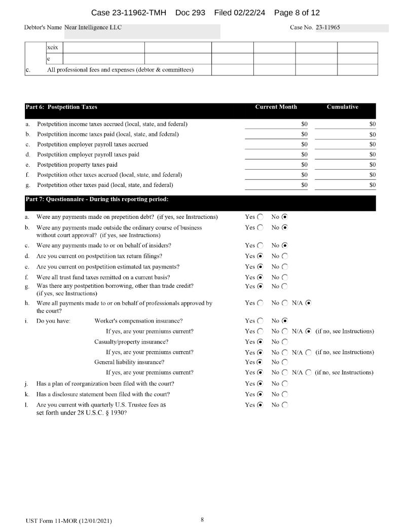 Debtor's Name Near Intelligence LLC Case No. 23 - 11965 xcix c c. All professional fees and expenses (debtor & committees) Part 6: Postpetition Taxes Current Month Cumulative $0 $0 a. Postpetition income taxes accrued (local, state, and federal) $0 $0 b. Postpetition income taxes paid (local, state, and federal) $0 $0 c. Postpetition employer payroll taxes accrued $0 $0 d. Postpetition employer payroll taxes paid $0 $0 e. Postpetition property taxes paid $0 $0 f. Postpetition other taxes accrued (local, state, and federal) $0 $0 g. Postpetition other taxes paid (local, state, and federal) Part 7: Questionnaire - During this reporting period: Yes Yes No No Yes Yes Yes Yes Yes No No No No No h. a. Were any payments made on prepetition debt? (if yes, see Instructions) b. Were any payments made outside the ordinary course of business without court approval? (if yes, see Instructions) c. Were any payments made to or on behalf of insiders? d. Are you current on postpetition tax return filings? e. Are you current on postpetition estimated tax payments? f. Were all trust fund taxes remitted on a current basis? g. Was there any postpetition borrowing, other than trade credit? (if yes, see Instructions) Were all payments made to or on behalf of professionals approved by the court? Yes No N/A i. Do you have: Worker's compensation insurance? If yes, are your premiums current? Casualty/property insurance? If yes, are your premiums current? General liability insurance? If yes, are your premiums current? Yes Yes Yes Yes Yes Yes Yes Yes Yes No No No No No No No No No N/A (if no, see Instructions) N/A (if no, see Instructions) N/A (if no, see Instructions) j. Has a plan of reorganization been filed with the court? k. Has a disclosure statement been filed with the court? l. Are you current with quarterly U.S. Trustee fees as set forth under 28 U.S.C. † 1930 ? Case 23 - 11962 - TMH Doc 293 Filed 02/22/24 Page 8 of 12 8 UST Form 11 - MOR (12/01/2021)