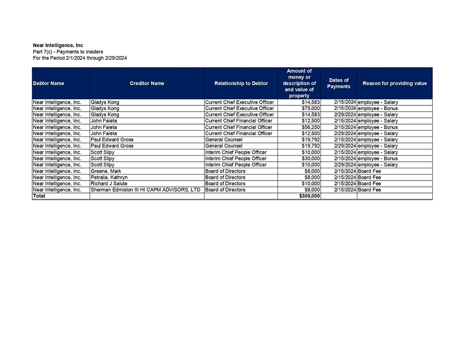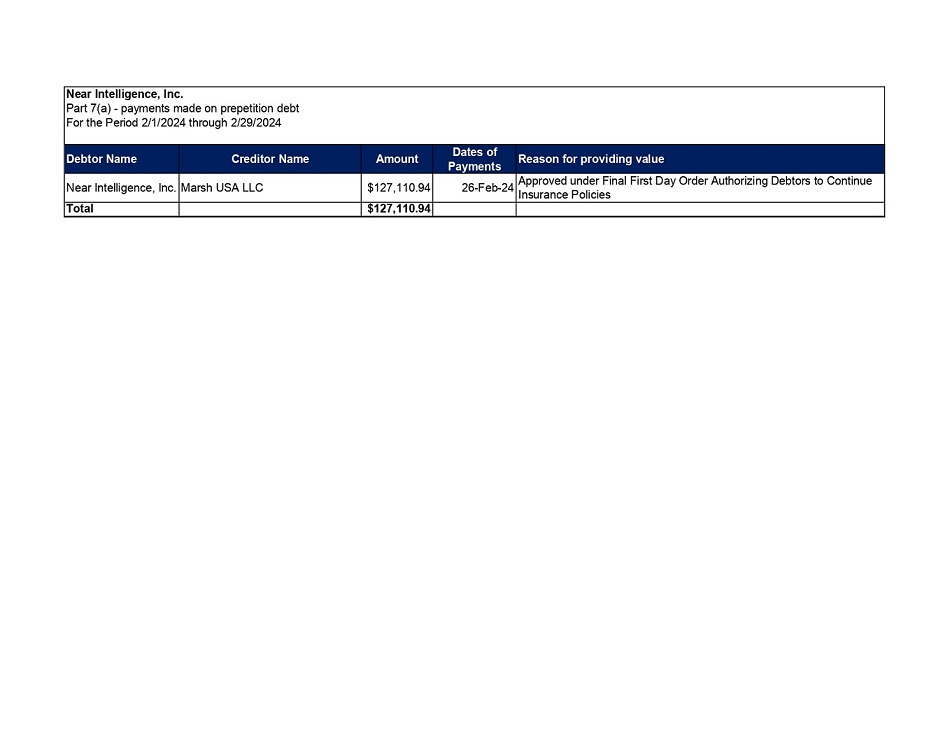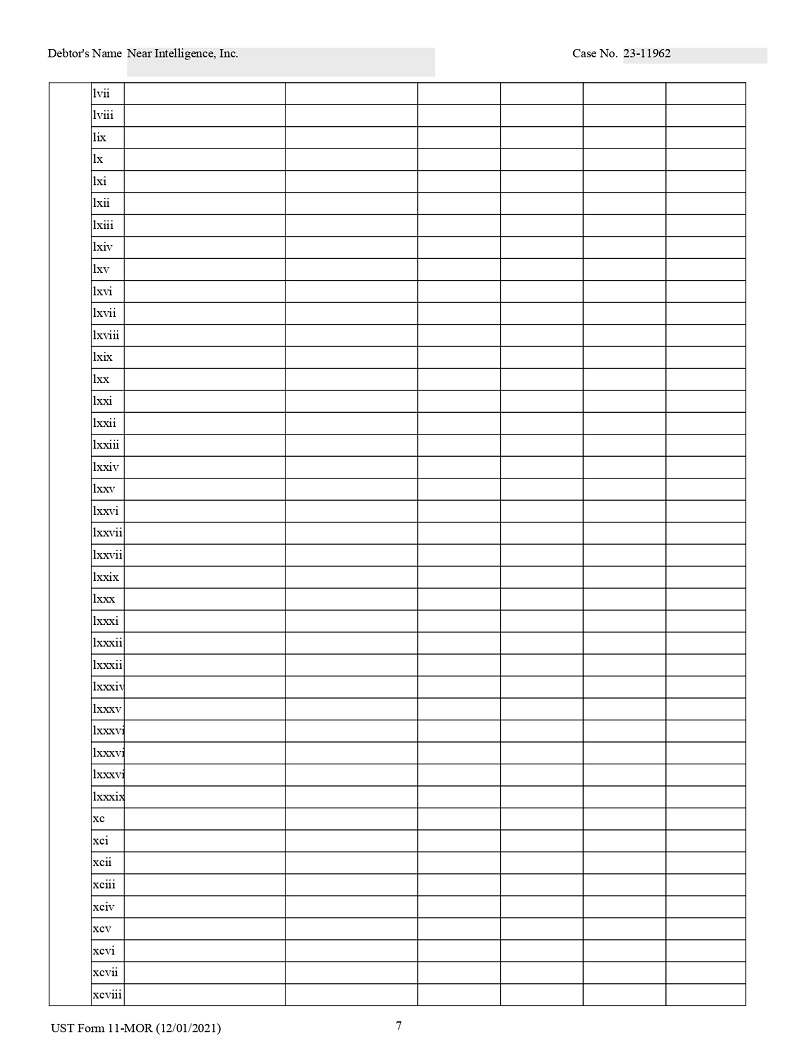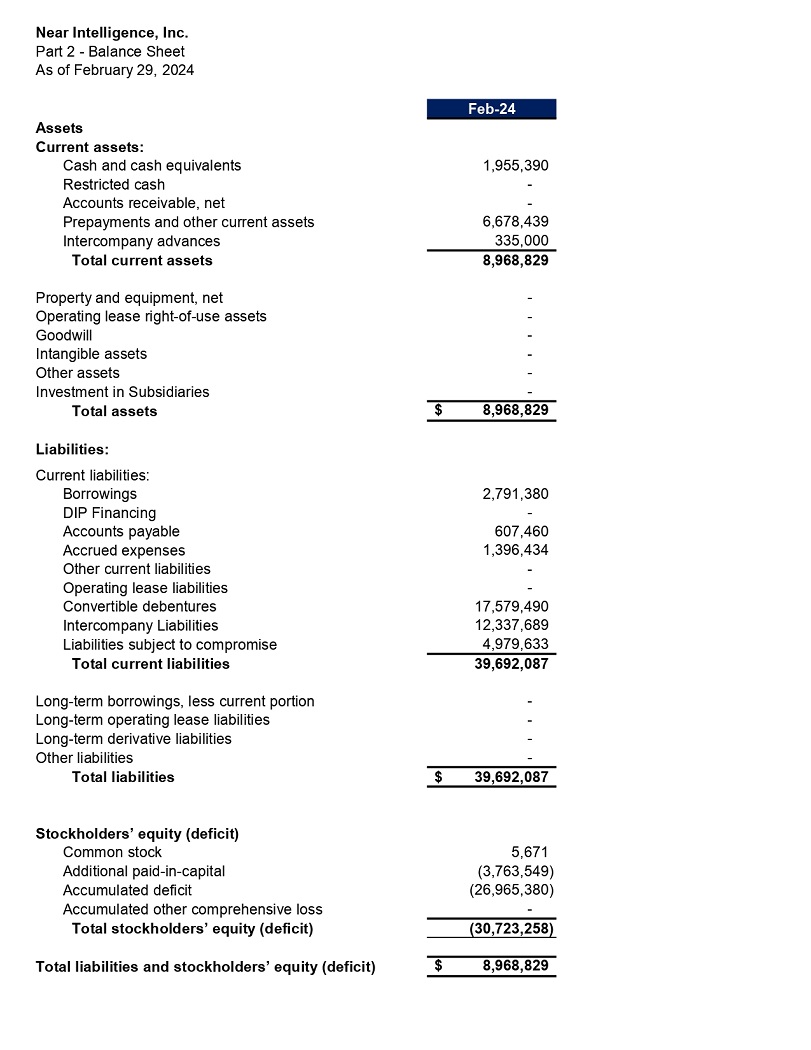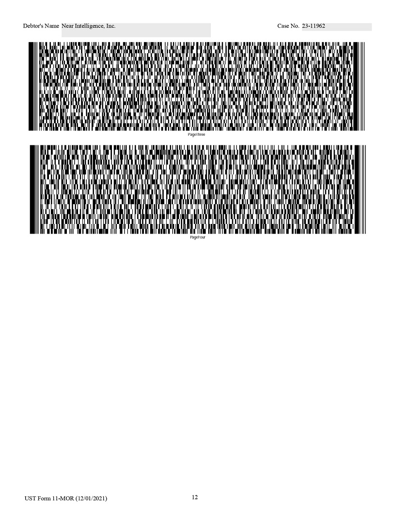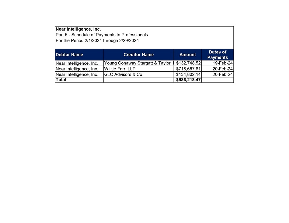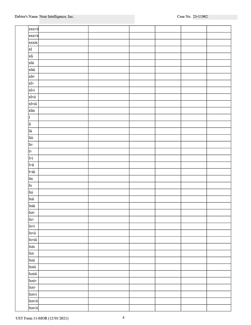 | 1 | The Debtors in these chapter 11 cases, along with the last four digits of their federal tax identification numbers, to the extent applicable, are Near Intelligence, Inc. (7857), Near Intelligence LLC (7857), Near North America, Inc. (9078), and Near Intelligence Pte. Ltd. The Debtors’ headquarters is located at 100 W Walnut St., Suite A-4, Pasadena, CA 91124. |