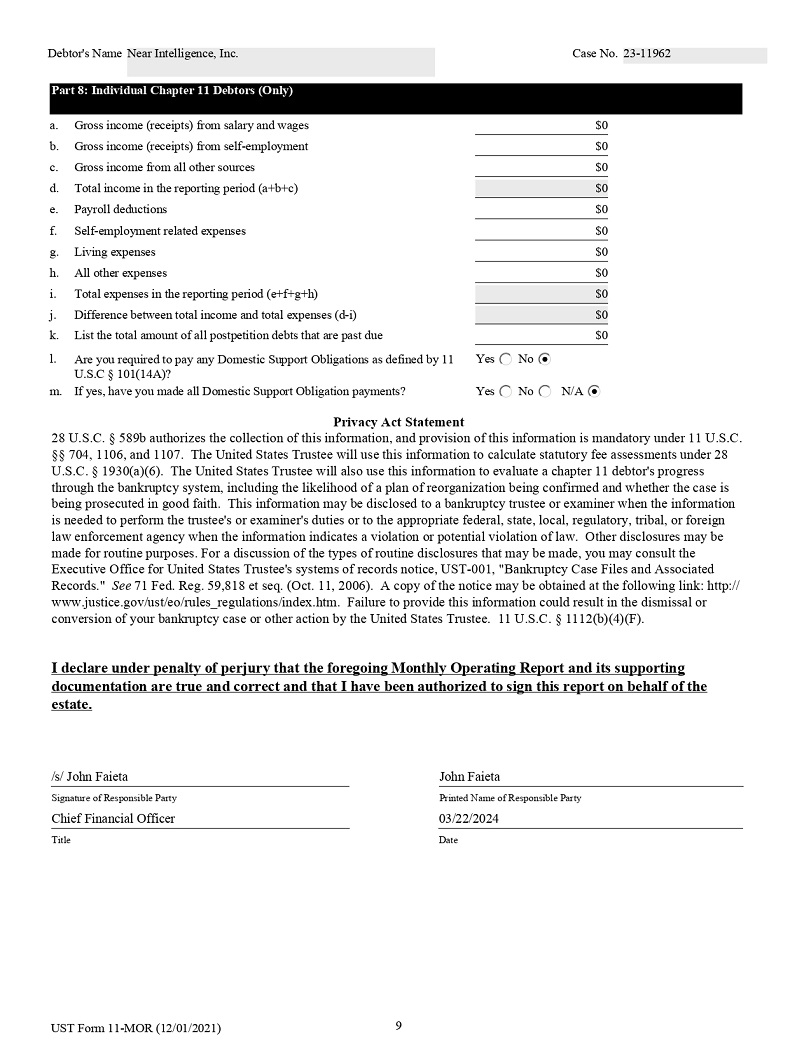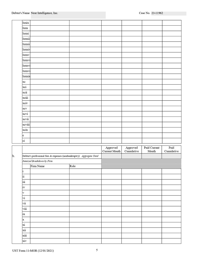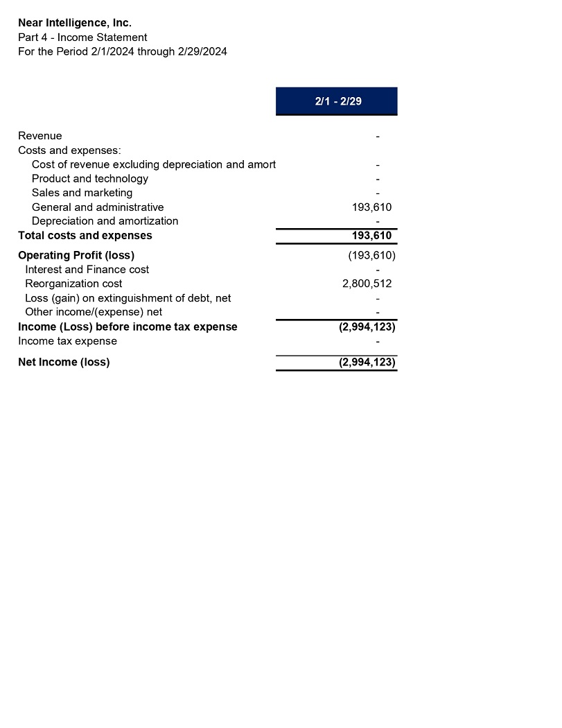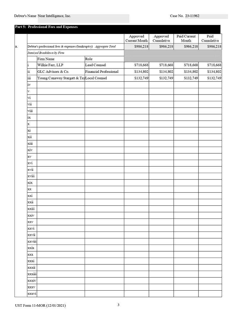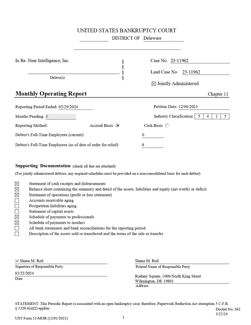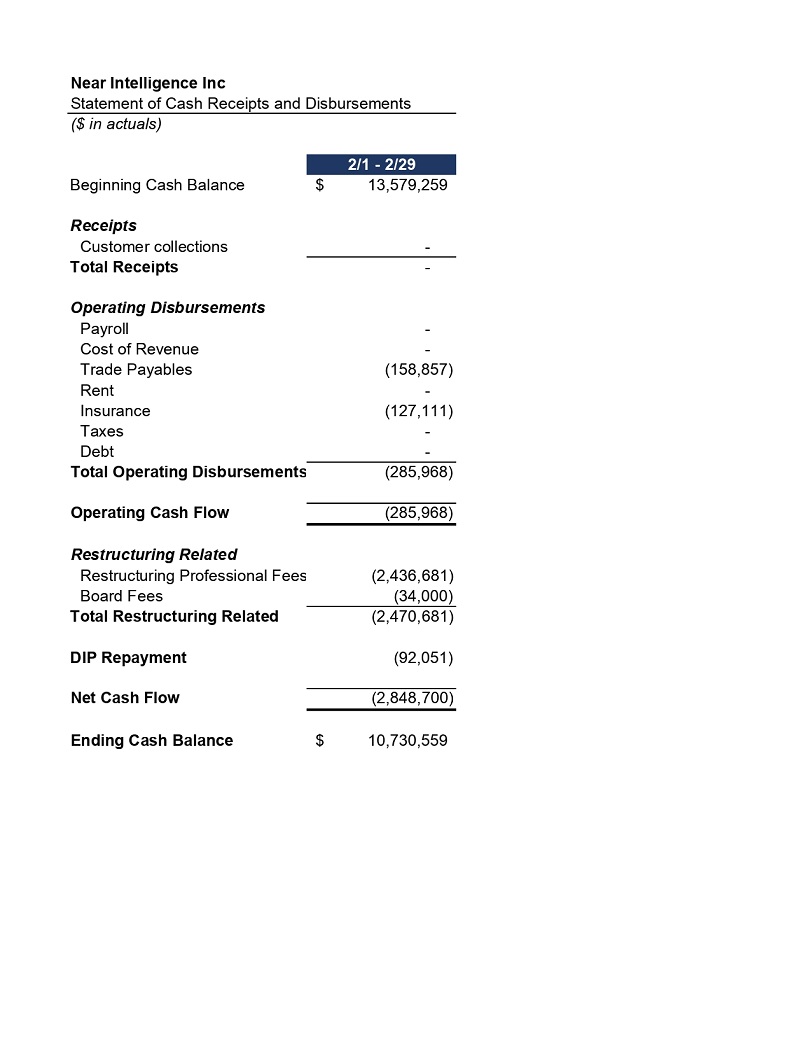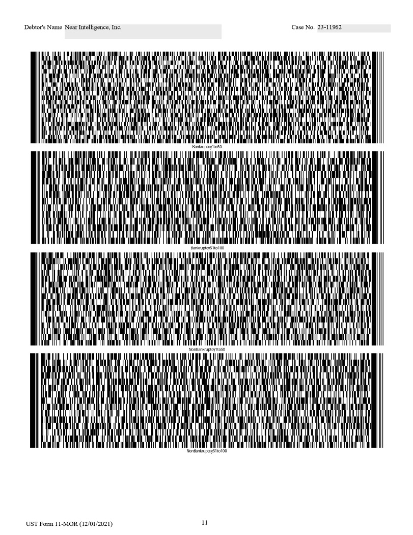 | 1 | The Debtors in these chapter 11 cases, along with the last four digits of their federal tax identification numbers, to the extent applicable, are Near Intelligence, Inc. (7857), Near Intelligence LLC (7857), Near North America, Inc. (9078), and Near Intelligence Pte. Ltd. The Debtors’ headquarters is located at 100 W Walnut St., Suite A-4, Pasadena, CA 91124. |