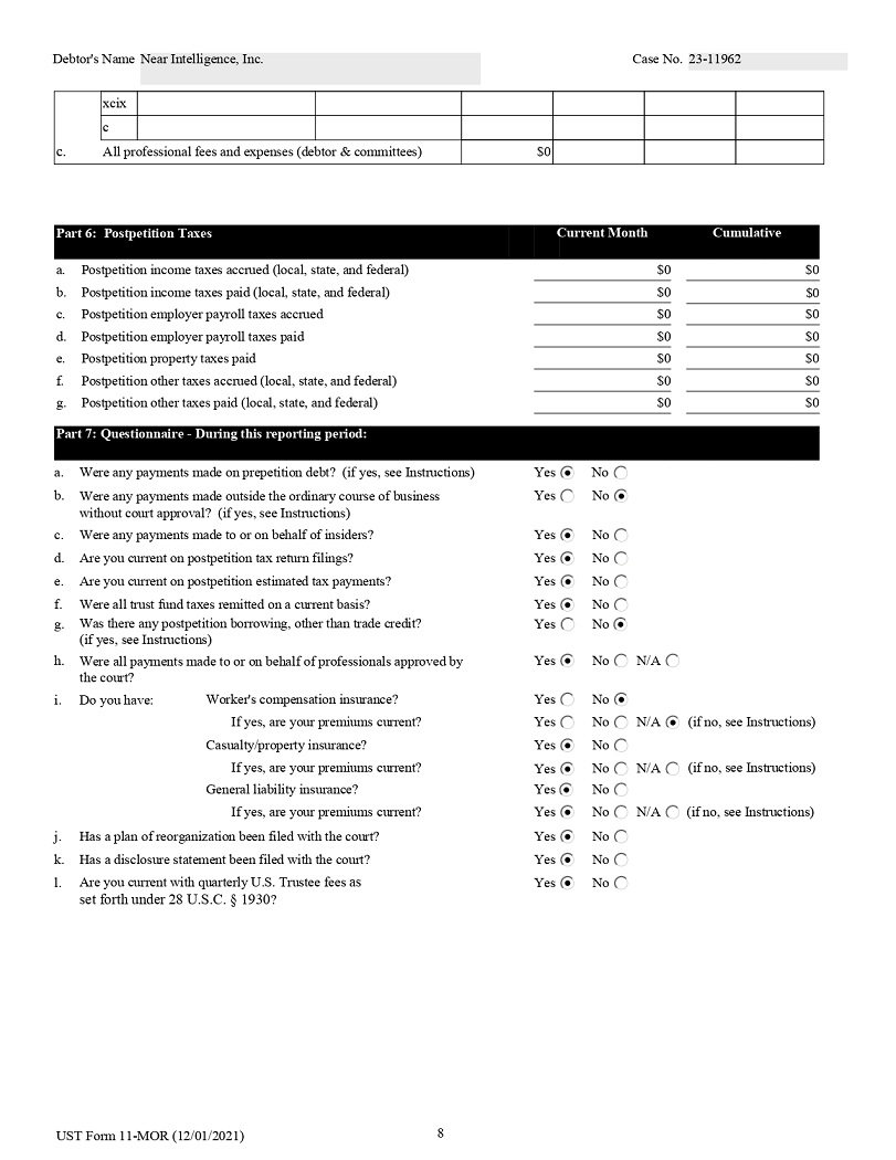 Part 6 Postpetition Employer Taxes Near North America contracted TriNet HR III, Inc. as a Professional Employer Organization (“PEO”) and under this agreement TriNet is the payroll employer of record for Near North America employees. Federal payroll taxes, such as income withholding, Social Security, Medicare and unemployment tax are paid by TriNet and the taxes are reported, in the aggregate, under TriNet’s name and FEIN on Forms 940 and 941. Additionally, all state and local withholding taxes are paid and filed on behalf of the Debtors under TriNet’s name, FEIN and account numbers.