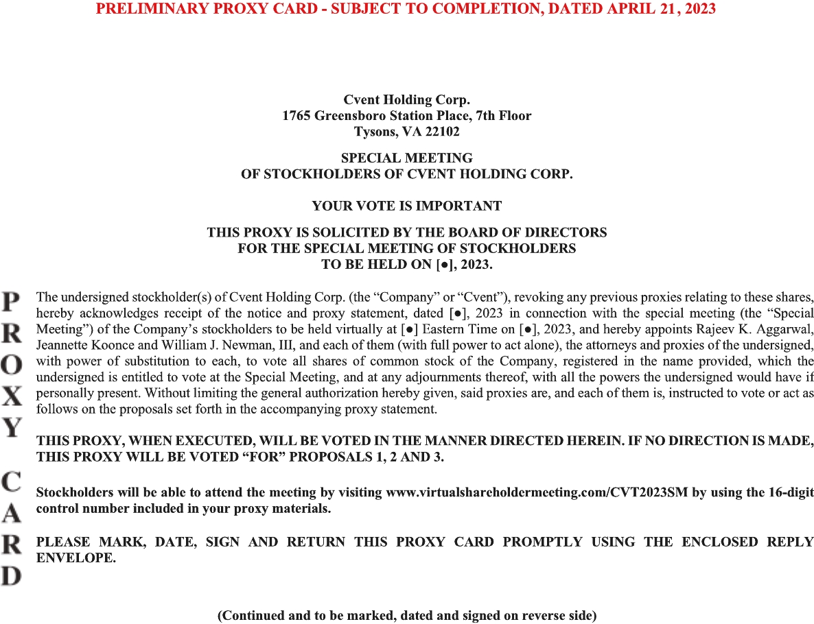 You are cordially invited to attend a special meeting of stockholders of Cvent Holding Corp., a Delaware corporation (“Cvent” or the “Company”), which will be held virtually on [•], 2023 at [•] Eastern time (including any adjournments or postponements thereof, the “Special Meeting”). Stockholders will be able to attend the Special Meeting and examine the list of stockholders entitled to vote at the Special Meeting during the Special Meeting by visiting www.virtualshareholdermeeting.com/CVT2023SM and using the 16-digit control number included in your proxy materials. You will not be able to attend the Special Meeting physically in person. For purposes of attendance at the Special Meeting, all references in the accompanying proxy statement to “present in person” or “in person” shall mean virtually present at the Special Meeting.