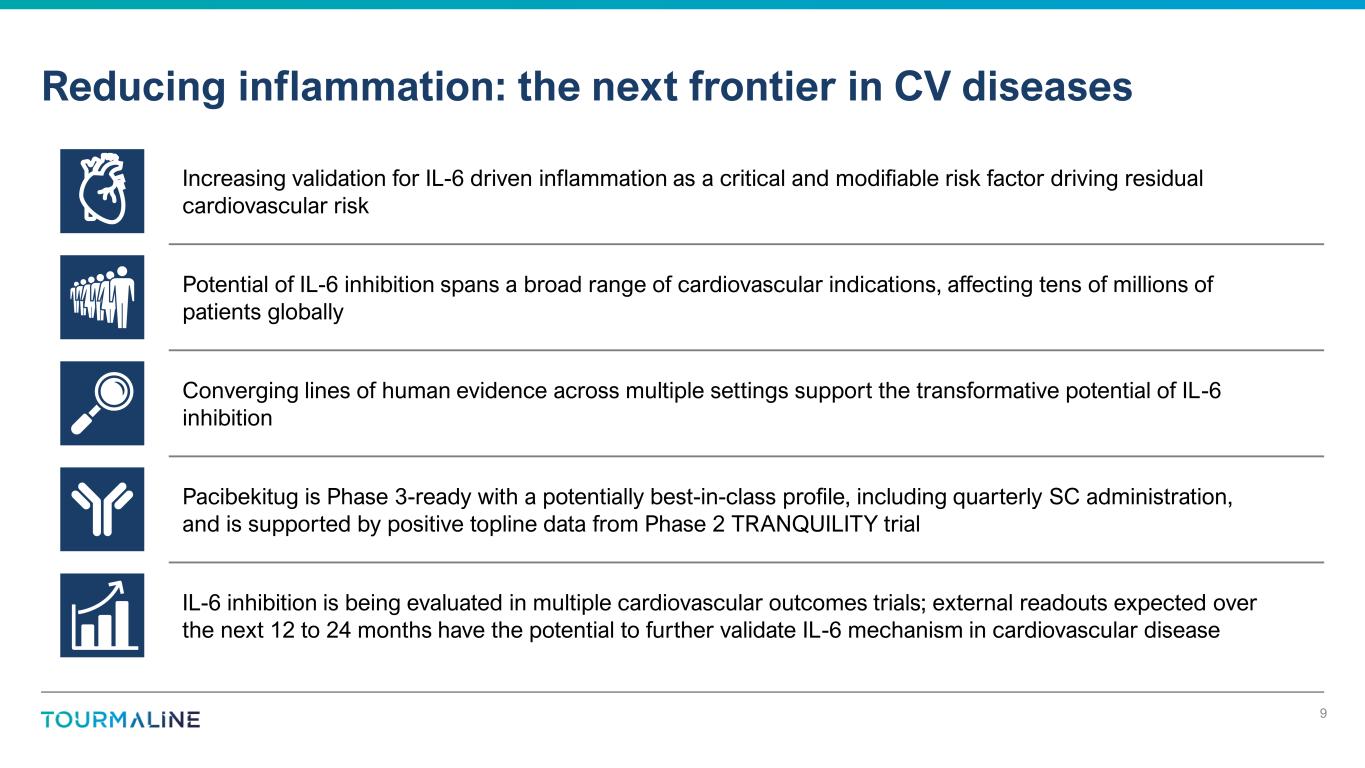Disclaimer 2 The material in this presentation regarding Tourmaline Bio, Inc. (“we,” “us” or the “Company”) is for informational purposes only and is intended for investor audiences. This presentation contains forward-looking statements within the meaning of the Private Securities Litigation Reform Act of 1995 that involve substantial risks and uncertainties. All statements, other than statements of historical facts, contained in this presentation, including statements regarding expectations regarding the development and potential therapeutic benefits of pacibekitug, including the potential best-in-class profile of pacibekitug and the anticipated progression of pacibekitug into future clinical trials; the timing of initiation, progress and results of the Company’s current and future preclinical and clinical trials for its product candidates, including pacibekitug, including the timing of a planned Phase 2 proof-of-concept clinical trial in patients with abdominal aortic aneurysm and of Phase 3 clinical trial readiness in atherosclerotic cardiovascular disease; the therapeutic potential of IL-6 inhibition, including by pacibekitug; the timing and likelihood of seeking regulatory approval for the Company’s product candidates, including pacibekitug; the Company’s ability to achieve planned milestones; the competitive landscape and potential market for the Company’s product candidates; and the unmet need in the Company’s target indications and the potential for pacibekitug to address such unmet need. The words “may,” “will,” “should,” “expects,” “intends,” “plans,” “anticipates,” “believes,” “estimates,” “predicts,” “potential,” “continue,” and similar expressions are intended to identify forward-looking statements, although not all forward-looking statements contain these identifying words. The Company may not actually achieve the plans, intentions, or expectations disclosed in these forward-looking statements, and you should not place undue reliance on these forward-looking statements. Actual results or events could differ materially from the plans, intentions and expectations disclosed in these forward-looking statements. Many factors may cause differences between current expectations and actual results, including, but not limited to, additional safety events occurring after the data extract date of April 23, 2025, as participants complete their study visits and follow-up throughout the course of the trial; a review of the full dataset (including the post-April 23, 2025 dataset), after the trial has completed, which may cause our analysis following completion of the trial to differ from the analysis as of the data extract date presented herein; unexpected safety or efficacy data observed during preclinical or clinical studies; clinical site activation rates or clinical trial enrollment rates that are lower than expected; changes in the regulatory environment; changes in expected or existing competition; unexpected litigation or other disputes, and other risks and uncertainties, including those described in the section titled “Risk Factors” in the Company’s most recent filings with the Securities and Exchange Commission. The forward-looking statements included in this presentation represent the Company’s views as of the date of this presentation. The Company undertakes no obligation to update the information contained in this presentation to reflect new events or circumstances, except as required by law. In addition, certain information contained in this presentation relates to or is based on studies, publications, surveys and other data obtained from third-party sources and the Company’s own internal estimates and research. While the Company believes these third-party sources to be reliable as of the date of this presentation, it has not independently verified, and makes no representation as to the adequacy, fairness, accuracy or completeness of any information obtained from third-party sources. In addition, all of the market data included in this presentation involves a number of assumptions and limitations, and there can be no guarantee as to the accuracy or reliability of such assumptions. Finally, while we believe our own internal research is reliable, such research has not been verified by any independent source. This presentation contains trademarks, services marks, trade names and copyrights of the Company and other companies, which are the property of their respective owners. The use or display of third parties’ trademarks, service marks, trade name or products in this presentation is not intended to, and does not, imply a relationship with the Company, or an endorsement of sponsorship by the Company. Solely for convenience, the trademarks, service marks and trade names referred to in this presentation may appear without the ®, TM or SM symbols, but such references are not intended to indicate, in any way, that the Company will not assert, to the fullest extent under applicable law, their rights or the right of the applicable licensor to these trademarks, service marks and trade name.