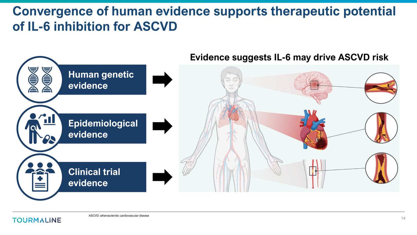 ASCVD: atherosclerotic cardiovascular disease Convergence of human evidence supports therapeutic potential of IL-6 inhibition for ASCVD 14 Evidence suggests IL-6 may drive ASCVD risk Human genetic evidence Epidemiological evidence Clinical trial evidence