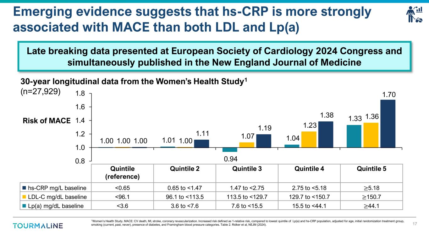 1Sarwar et al., Lancet (2012). 2Analysis based on (i) Georgakis et al., Circ Genom Prec Med (2020), (ii) Levin et al, Circ Res (2021), (iii) Burgess et al, Arterioscler Thromb Vasc Biol (2025), (iv) Omarov et al, medRxiv (2024). 3Garbers et al., BBA (2014). 4Swerdlow et al., Lancet (2012). 5Georgakis et al., Circ Genom Precis Med (2020).6Said et al., Nat Commun (2022). IL-6R gene variant mimicking low-dose IL-6 pharmacological blockade causally associated with lower ASCVD risk1 16 • rs2228145 is a common functional IL- 6R gene variant (p.Asp358Ala) • Prevalence of 30-40% (Europe)1,3-5 • Increased IL-6R ectodomain splicing by ADAM10/173 • Carriers of rs2228145 demonstrated concordant changes in downstream biomarkers compared with tocilizumab (↓CRP, fibrinogen;↑albumin, sIL-6R)1,3-5 • Modest reduction in hs-CRP ~9% per allele6 IL-6R gene variant rs2228145 associated with lower risk of ASCVD2 Benefit Harm→