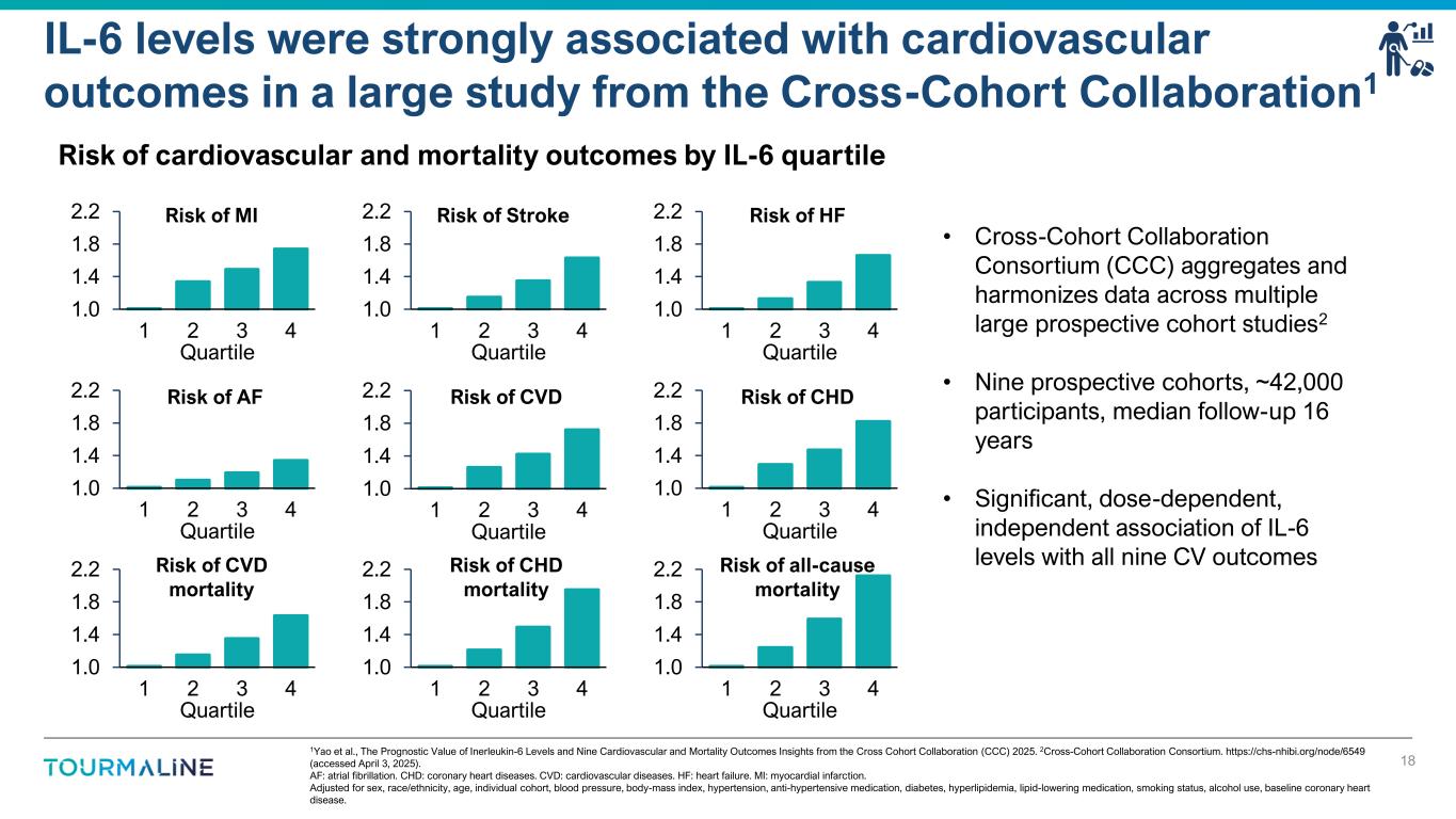 1Women’s Health Study. MACE: CV death, MI, stroke, coronary revascularization. Increased risk defined as 1-relative risk, compared to lowest quintile of Lp(a) and hs-CRP population, adjusted for age, initial randomization treatment group, smoking (current, past, never), presence of diabetes, and Framingham blood pressure categories. Table 2. Ridker et al, NEJM (2024). Emerging evidence suggests that hs-CRP is more strongly associated with MACE than both LDL and Lp(a) 17 1.00 1.01 0.94 1.04 1.33 1.00 1.00 1.07 1.23 1.36 1.00 1.11 1.19 1.38 1.70 0.8 1.0 1.2 1.4 1.6 1.8 Quintile 1 (reference) Quintile 2 Quintile 3 Quintile 4 Quintile 5 Risk of MACE 30-year longitudinal data from the Women’s Health Study1 (n=27,929) Late breaking data presented at European Society of Cardiology 2024 Congress and simultaneously published in the New England Journal of Medicine Quintile (r ) i i Qui Qui ◼ hs-CRP mg/L baseline <0.65 0.65 to <1.47 1.47 to <2.75 2.75 to <5.18 ≥5.18 ◼ LDL-C mg/dL baseline <96.1 96.1 to <113.5 113.5 to <129.7 129.7 to <150.7 ≥150.7 ◼ Lp(a) mg/dL baseline <3.6 3.6 to <7.6 7.6 to <15.5 15.5 to <44.1 ≥44.1