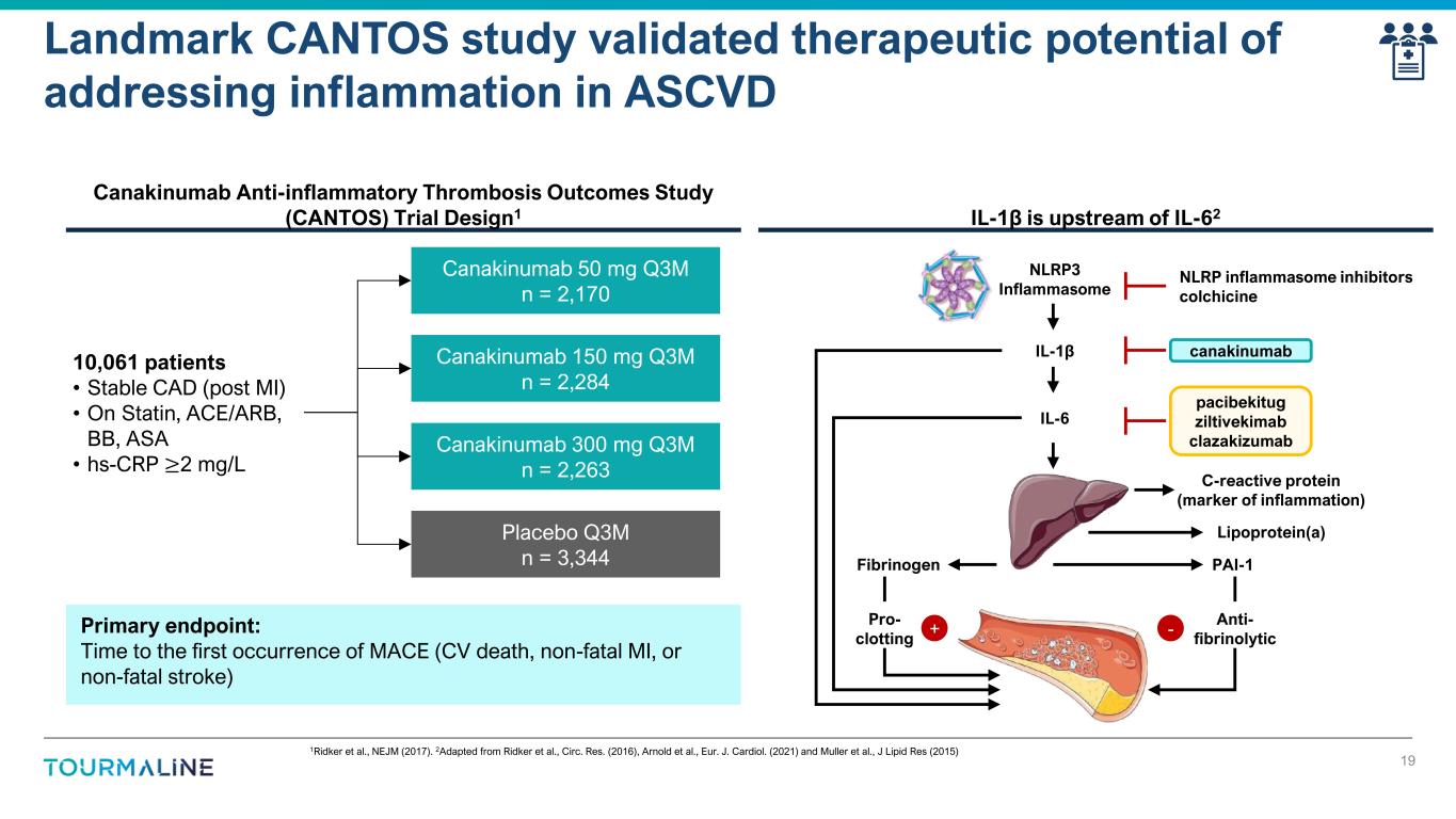 Risk of cardiovascular and mortality outcomes by IL-6 quartile 1Yao et al., The Prognostic Value of Inerleukin-6 Levels and Nine Cardiovascular and Mortality Outcomes Insights from the Cross Cohort Collaboration (CCC) 2025. 2Cross-Cohort Collaboration Consortium. https://chs-nhibi.org/node/6549 (accessed April 3, 2025). AF: atrial fibrillation. CHD: coronary heart diseases. CVD: cardiovascular diseases. HF: heart failure. MI: myocardial infarction. Adjusted for sex, race/ethnicity, age, individual cohort, blood pressure, body-mass index, hypertension, anti-hypertensive medication, diabetes, hyperlipidemia, lipid-lowering medication, smoking status, alcohol use, baseline coronary heart disease. IL-6 levels were strongly associated with cardiovascular outcomes in a large study from the Cross-Cohort Collaboration1 18 1.0 1.4 1.8 2.2 1 2 3 4 Quartile 1.0 1.4 1.8 2.2 1 2 3 4 Quartile 1.0 1.4 1.8 2.2 1 2 3 4 Quartile 1.0 1.4 1.8 2.2 1 2 3 4 Quartile 1.0 1.4 1.8 2.2 1 2 3 4 Quartile 1.0 1.4 1.8 2.2 1 2 3 4 Quartile 1.0 1.4 1.8 2.2 1 2 3 4 Quartile 1.0 1.4 1.8 2.2 1 2 3 4 Quartile 1.0 1.4 1.8 2.2 1 2 3 4 Quartile Risk of StrokeRisk of MI Risk of AF Risk of HF Risk of CVD Risk of CHD Risk of CVD mortality Risk of CHD mortality Risk of all-cause mortality • Cross-Cohort Collaboration Consortium (CCC) aggregates and harmonizes data across multiple large prospective cohort studies2 • Nine prospective cohorts, ~42,000 participants, median follow-up 16 years • Significant, dose-dependent, independent association of IL-6 levels with all nine CV outcomes
