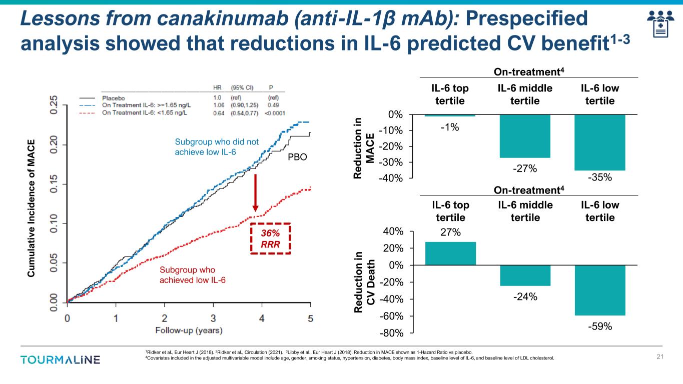 Reduction in MACE shown as 1-Hazard Ratio vs placebo. ITT: intent to treat. MACE: major adverse cardiovascular events including CV death, myocardial infarction (MI), stroke. n.s.: not statistically significant. ITT CANTOS analysis presents data for 150mg dose group; values for CANTOS subanalyses combine all doses (50, 150, 300 mg). Ridker et al., NEJM (2017). Ridker et al., Lancet (2018). Adjusted for age, gender, smoking, hypertension, diabetes, BMI, baseline hs-CRP, baseline LDL-C. Ridker et al., Eur Heart J (2018). Adjusted for age, gender, smoking, hypertension, diabetes, BMI, baseline IL-6, baseline LDL-C. Ridker et al., JACC (2018). Lessons from canakinumab (anti-IL-1β mAb): Robust IL-6 pathway inhibition associated with improved outcomes 20 On-treatment On-treatment -15% -25% -30% -35% -60% -50% -40% -30% -20% -10% 0% R e d u c ti o n i n M A C E IL-6 low tertile hs-CRP <2 mg/L CKD ITT hs-CRP <2 mg/L R e d u c ti o n i n C V D e a th IL-6 low tertile hs-CRP <2 mg/L hs-CRP <2 mg/L -12% -31% -34% -59% -60% -50% -40% -30% -20% -10% 0% ITT CKD n.s. p=0.021 p<0.0001 p=0.0004 p<0.0001 p<0.0001 p=0.0227 p=0.0045