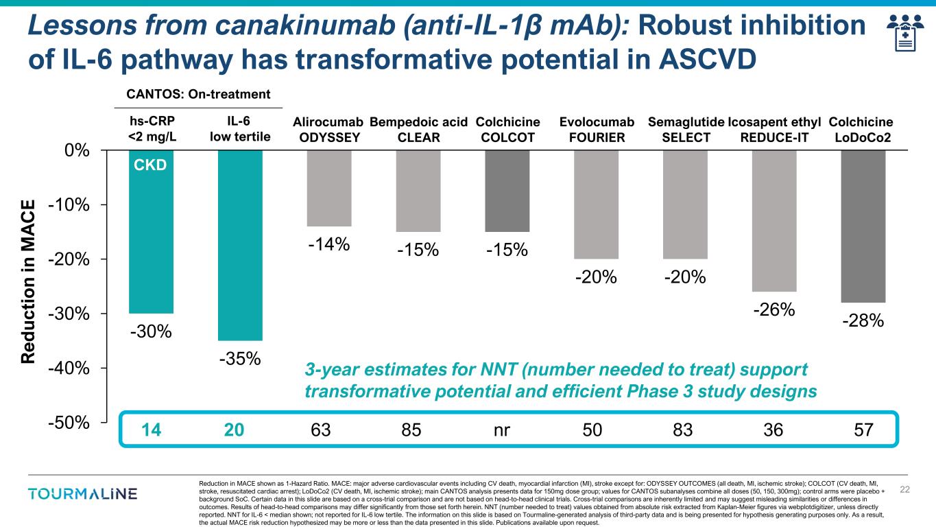 27% -24% -59% -80% -60% -40% -20% 0% 20% 40% IL-6 top tertile IL-6 middle tertile IL-6 low tertile R e d u c ti o n i n C V D e a th 1Ridker et al., Eur Heart J (2018). 2Ridker et al., Circulation (2021). 3Libby et al., Eur Heart J (2018). Reduction in MACE shown as 1-Hazard Ratio vs placebo. 4Covariates included in the adjusted multivariable model include age, gender, smoking status, hypertension, diabetes, body mass index, baseline level of IL-6, and baseline level of LDL cholesterol. Lessons from canakinumab (anti-IL-1β mAb): Prespecified analysis showed that reductions in IL-6 predicted CV benefit1-3 21 -1% -27% -35%-40% -30% -20% -10% 0% IL-6 top tertile IL-6 middle tertile IL-6 low tertile R e d u c ti o n i n M A C E Subgroup who did not achieve low IL-6 Subgroup who achieved low IL-6 36% RRR PBO C u m u la ti v e I n c id e n c e o f M A C E On-treatment4 On-treatment4