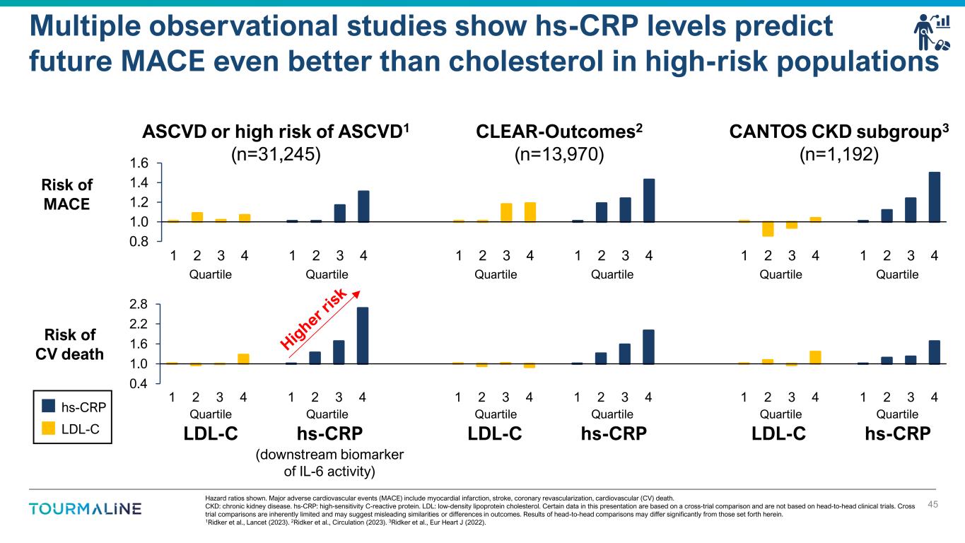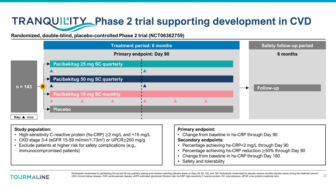 Reduction in MACE shown as 1-Hazard Ratio. MACE: major adverse cardiovascular events including CV death, myocardial infarction (MI), stroke except for: ODYSSEY OUTCOMES (all death, MI, ischemic stroke); COLCOT (CV death, MI, stroke, resuscitated cardiac arrest); LoDoCo2 (CV death, MI, ischemic stroke); main CANTOS analysis presents data for 150mg dose group; values for CANTOS subanalyses combine all doses (50, 150, 300mg); control arms were placebo + background SoC. Certain data in this slide are based on a cross-trial comparison and are not based on head-to-head clinical trials. Cross-trial comparisons are inherently limited and may suggest misleading similarities or differences in outcomes. Results of head-to-head comparisons may differ significantly from those set forth herein. NNT (number needed to treat) values obtained from absolute risk extracted from Kaplan-Meier figures via webplotdigitizer, unless directly reported. NNT for IL-6 < median shown; not reported for IL-6 low tertile. The information on this slide is based on Tourmaline-generated analysis of third-party data and is being presented for hypothesis generating purposes only. As a result, the actual MACE risk reduction hypothesized may be more or less than the data presented in this slide. Publications available upon request. Lessons from canakinumab (anti-IL-1β mAb): Robust inhibition of IL-6 pathway has transformative potential in ASCVD 22 -30% -35% -14% -15% -15% -20% -20% -26% -28% -50% -40% -30% -20% -10% 0% R e d u c ti o n i n M A C E IL-6 low tertile hs-CRP <2 mg/L CKD Alirocumab ODYSSEY Bempedoic acid CLEAR Colchicine COLCOT Evolocumab FOURIER Semaglutide SELECT Icosapent ethyl REDUCE-IT Colchicine LoDoCo2 3-year estimates for NNT (number needed to treat) support transformative potential and efficient Phase 3 study designs 14 20 63 CANTOS: On-treatment 57368350nr85