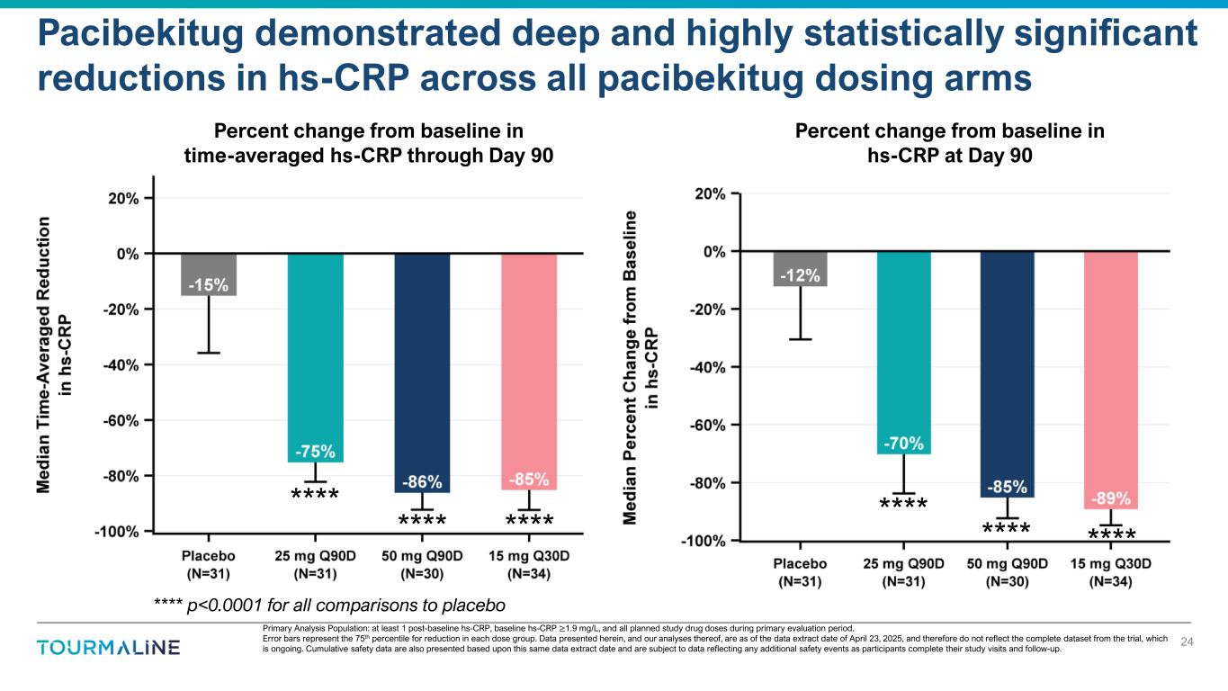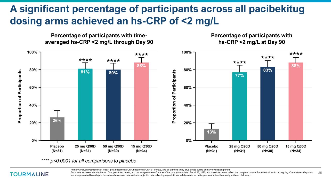 Primary Analysis Population: at least 1 post-baseline hs-CRP, baseline hs-CRP ≥1.9 mg/L, and all planned study drug doses during primary evaluation period. Error bars represent the 75th percentile for reduction in each dose group. Data presented herein, and our analyses thereof, are as of the data extract date of April 23, 2025, and therefore do not reflect the complete dataset from the trial, which is ongoing. Cumulative safety data are also presented based upon this same data extract date and are subject to data reflecting any additional safety events as participants complete their study visits and follow-up. Pacibekitug demonstrated deep and highly statistically significant reductions in hs-CRP across all pacibekitug dosing arms 24 Percent change from baseline in time-averaged hs-CRP through Day 90 Percent change from baseline in hs-CRP at Day 90 **** **** **** **** **** **** **** p<0.0001 for all comparisons to placebo