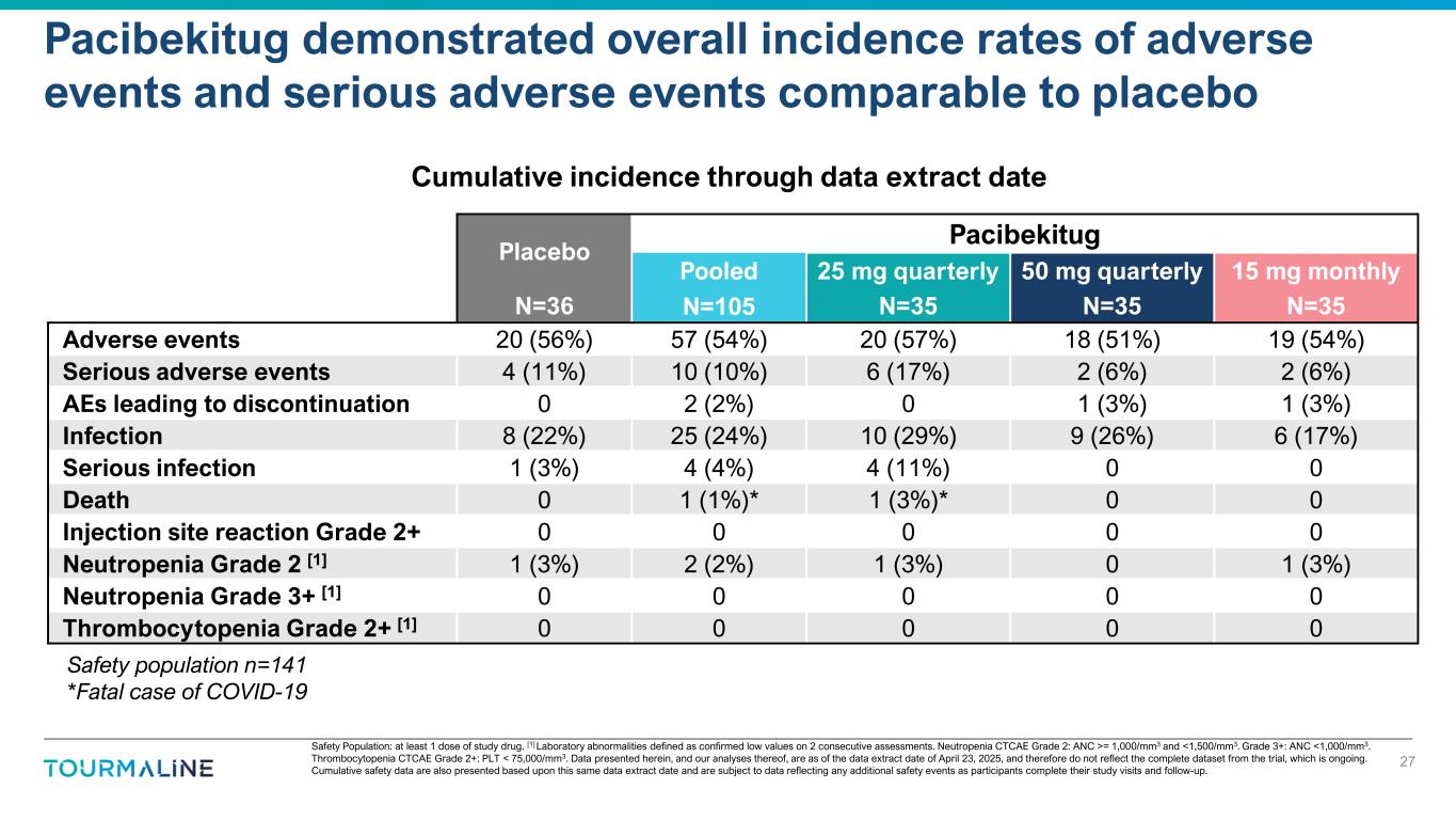Safety Population: at least 1 dose of study drug. [1] Laboratory abnormalities defined as confirmed low values on 2 consecutive assessments. Neutropenia CTCAE Grade 2: ANC >= 1,000/mm3 and <1,500/mm3. Grade 3+: ANC <1,000/mm3. Thrombocytopenia CTCAE Grade 2+: PLT < 75,000/mm3. Data presented herein, and our analyses thereof, are as of the data extract date of April 23, 2025, and therefore do not reflect the complete dataset from the trial, which is ongoing. Cumulative safety data are also presented based upon this same data extract date and are subject to data reflecting any additional safety events as participants complete their study visits and follow-up. Pacibekitug demonstrated overall incidence rates of adverse events and serious adverse events comparable to placebo 27 Placebo Pacibekitug Pooled 25 mg quarterly 50 mg quarterly 15 mg monthly N=36 N=105 N=35 N=35 N=35 Adverse events 20 (56%) 57 (54%) 20 (57%) 18 (51%) 19 (54%) Serious adverse events 4 (11%) 10 (10%) 6 (17%) 2 (6%) 2 (6%) AEs leading to discontinuation 0 2 (2%) 0 1 (3%) 1 (3%) Infection 8 (22%) 25 (24%) 10 (29%) 9 (26%) 6 (17%) Serious infection 1 (3%) 4 (4%) 4 (11%) 0 0 Death 0 1 (1%)* 1 (3%)* 0 0 Injection site reaction Grade 2+ 0 0 0 0 0 Neutropenia Grade 2 [1] 1 (3%) 2 (2%) 1 (3%) 0 1 (3%) Neutropenia Grade 3+ [1] 0 0 0 0 0 Thrombocytopenia Grade 2+ [1] 0 0 0 0 0 Cumulative incidence through data extract date Safety population n=141 *Fatal case of COVID-19