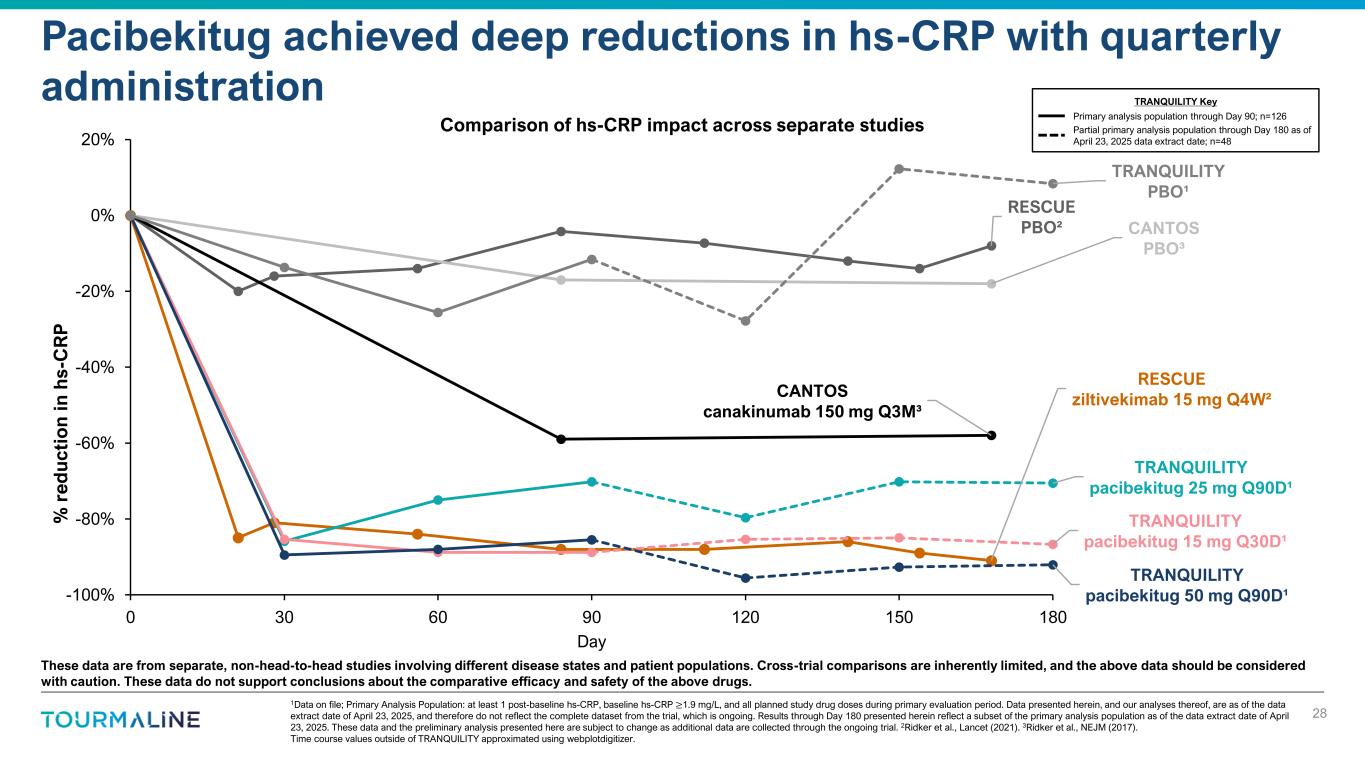 RESCUE ziltivekimab 15 mg Q4W² RESCUE PBO² CANTOS canakinumab 150 mg Q3M³ CANTOS PBO³ TRANQUILITY pacibekitug 25 mg Q90D¹ TRANQUILITY pacibekitug 15 mg Q30D¹ TRANQUILITY pacibekitug 50 mg Q90D¹ TRANQUILITY PBO¹ -100% -80% -60% -40% -20% 0% 20% 0 30 60 90 120 150 180 Day 1Data on file; Primary Analysis Population: at least 1 post-baseline hs-CRP, baseline hs-CRP ≥1.9 mg/L, and all planned study drug doses during primary evaluation period. Data presented herein, and our analyses thereof, are as of the data extract date of April 23, 2025, and therefore do not reflect the complete dataset from the trial, which is ongoing. Results through Day 180 presented herein reflect a subset of the primary analysis population as of the data extract date of April 23, 2025. These data and the preliminary analysis presented here are subject to change as additional data are collected through the ongoing trial. 2Ridker et al., Lancet (2021). 3Ridker et al., NEJM (2017). Time course values outside of TRANQUILITY approximated using webplotdigitizer. Pacibekitug achieved deep reductions in hs-CRP with quarterly administration 28 These data are from separate, non-head-to-head studies involving different disease states and patient populations. Cross-trial comparisons are inherently limited, and the above data should be considered with caution. These data do not support conclusions about the comparative efficacy and safety of the above drugs. Comparison of hs-CRP impact across separate studies TRANQUILITY Key Primary analysis population through Day 90; n=126 Partial primary analysis population through Day 180 as of April 23, 2025 data extract date; n=48 % r e d u c ti o n i n h s -C R P
