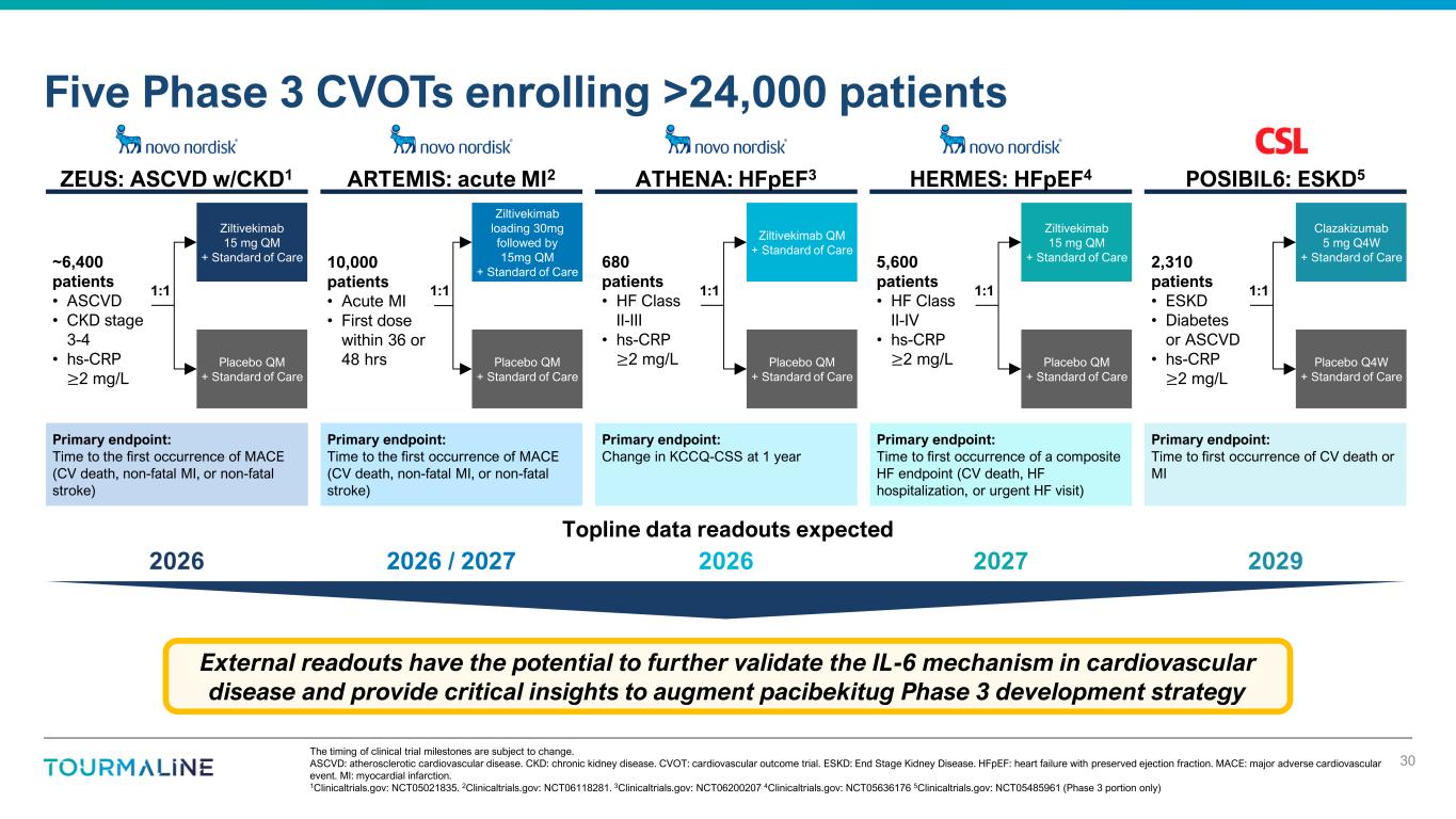 The timing of clinical trial milestones are subject to change. ASCVD: atherosclerotic cardiovascular disease. CKD: chronic kidney disease. CVOT: cardiovascular outcome trial. ESKD: End Stage Kidney Disease. HFpEF: heart failure with preserved ejection fraction. MACE: major adverse cardiovascular event. MI: myocardial infarction. 1Clinicaltrials.gov: NCT05021835. 2Clinicaltrials.gov: NCT06118281. 3Clinicaltrials.gov: NCT06200207 4Clinicaltrials.gov: NCT05636176 5Clinicaltrials.gov: NCT05485961 (Phase 3 portion only) Five Phase 3 CVOTs enrolling >24,000 patients 30 Ziltivekimab 15 mg QM + Standard of Care Placebo QM + Standard of Care ~6,400 patients • ASCVD • CKD stage 3-4 • hs-CRP ≥2 mg/L 1:1 ZEUS: ASCVD w/CKD1 Primary endpoint: Time to the first occurrence of MACE (CV death, non-fatal MI, or non-fatal stroke) ATHENA: HFpEF3 Primary endpoint: Change in KCCQ-CSS at 1 year ARTEMIS: acute MI2 Ziltivekimab loading 30mg followed by 15mg QM + Standard of Care Placebo QM + Standard of Care 10,000 patients • Acute MI • First dose within 36 or 48 hrs 1:1 Primary endpoint: Time to the first occurrence of MACE (CV death, non-fatal MI, or non-fatal stroke) Ziltivekimab QM + Standard of Care Placebo QM + Standard of Care 680 patients • HF Class II-III • hs-CRP ≥2 mg/L 1:1 Topline data readouts expected 2026 2026 / 2027 2026 HERMES: HFpEF4 Primary endpoint: Time to first occurrence of a composite HF endpoint (CV death, HF hospitalization, or urgent HF visit) Ziltivekimab 15 mg QM + Standard of Care Placebo QM + Standard of Care 5,600 patients • HF Class II-IV • hs-CRP ≥2 mg/L 1:1 2027 POSIBIL6: ESKD5 Primary endpoint: Time to first occurrence of CV death or MI Clazakizumab 5 mg Q4W + Standard of Care Placebo Q4W + Standard of Care 2,310 patients • ESKD • Diabetes or ASCVD • hs-CRP ≥2 mg/L 1:1 2029 External readouts have the potential to further validate the IL-6 mechanism in cardiovascular disease and provide critical insights to augment pacibekitug Phase 3 development strategy