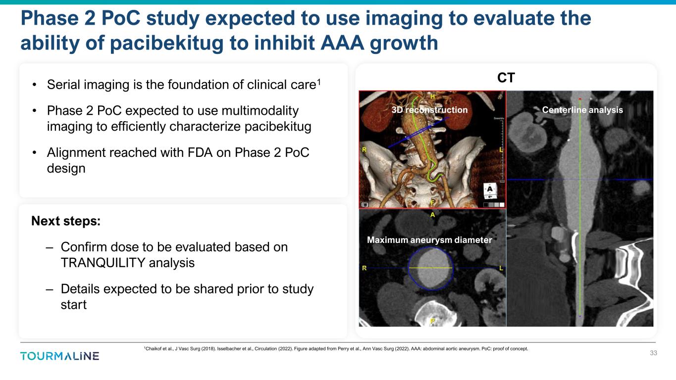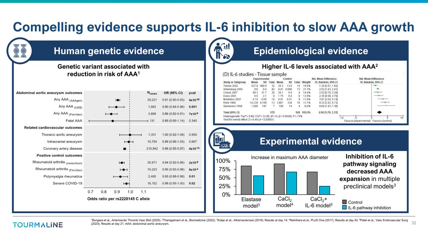 Human genetic evidence 1Burgess et al., Arterioscler Thromb Vasc Biol (2025). 2Thanigaimani et al., Biomedicine (2022). 3Kokje et al., Atherosclerosis (2016). Results at day 14. 4Nishihara et al., PLoS One (2017). Results at day 42. 5Patel et al., Vasc Endovascular Surg (2023). Results at day 21. AAA: abdominal aortic aneurysm. Compelling evidence supports IL-6 inhibition to slow AAA growth 32 Genetic variant associated with reduction in risk of AAA1 Epidemiological evidence Higher IL-6 levels associated with AAA2 Experimental evidence 0% 25% 50% 75% 100% Inhibition of IL-6 pathway signaling decreased AAA expansion in multiple preclinical models3 Increase in maximum AAA diameter Elastase model3 CaCl2 model4 CaCl2+ IL-6 model5 Control IL-6 pathway inhibition