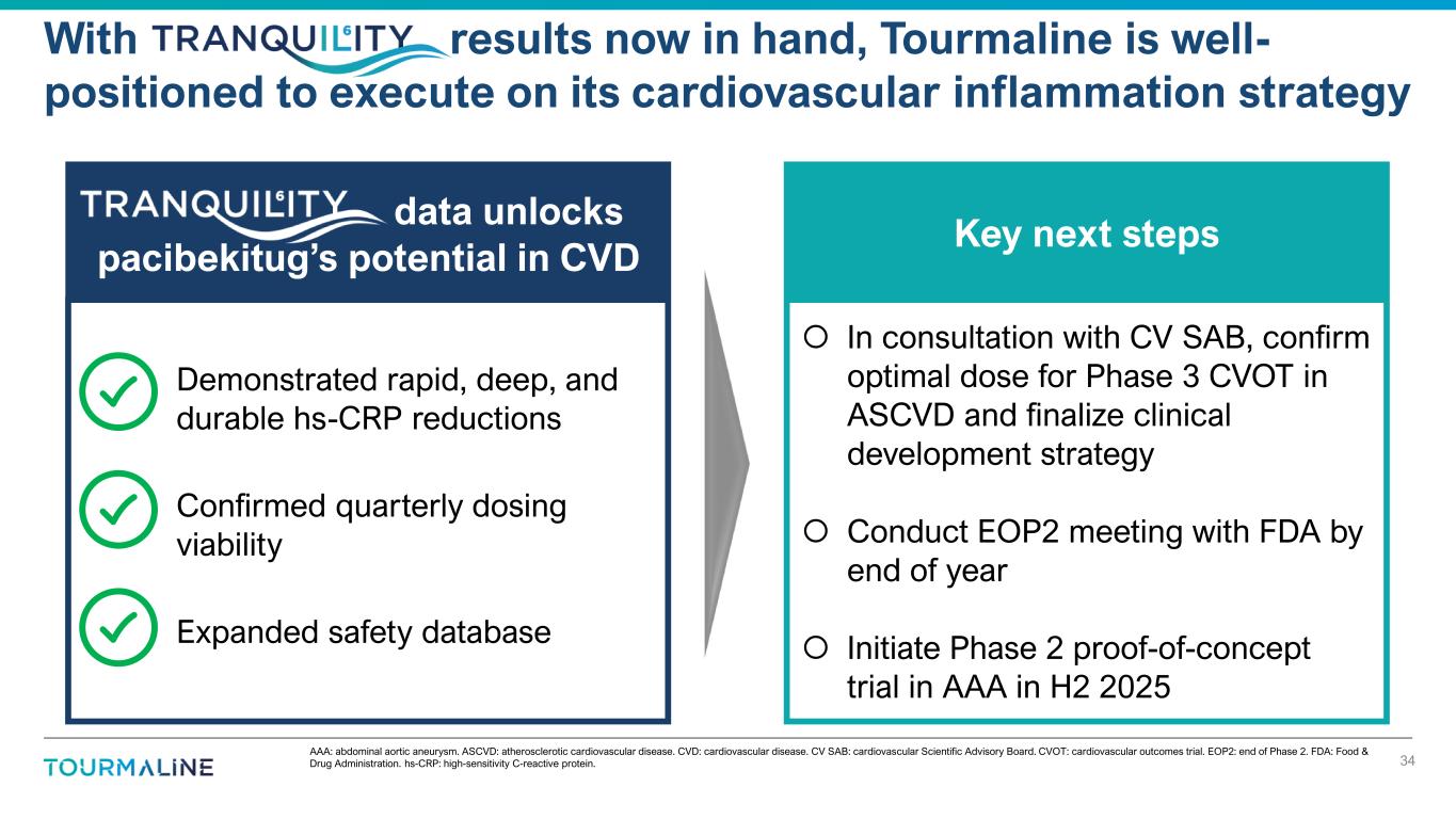 1Chaikof et al., J Vasc Surg (2018). Isselbacher et al., Circulation (2022). Figure adapted from Perry et al., Ann Vasc Surg (2022). AAA: abdominal aortic aneurysm. PoC: proof of concept. Phase 2 PoC study expected to use imaging to evaluate the ability of pacibekitug to inhibit AAA growth 33 • Serial imaging is the foundation of clinical care1 • Phase 2 PoC expected to use multimodality imaging to efficiently characterize pacibekitug • Alignment reached with FDA on Phase 2 PoC design 3D reconstruction CT Maximum aneurysm diameter Centerline analysis Next steps: – Confirm dose to be evaluated based on TRANQUILITY analysis – Details expected to be shared prior to study start