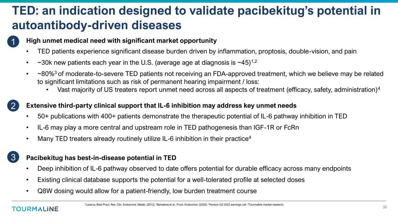 1Lazarus, Best Pract. Res. Clin. Endocrinol. Metab. (2012). 2Bartalena et al., Front. Endocrinol. (2020). 3Horizon Q3 2022 earnings call. 4Tourmaline market research. TED: an indication designed to validate pacibekitug’s potential in autoantibody-driven diseases 36 High unmet medical need with significant market opportunity • TED patients experience significant disease burden driven by inflammation, proptosis, double-vision, and pain • ~30k new patients each year in the U.S. (average age at diagnosis is ~45)1,2 • ~80%3 of moderate-to-severe TED patients not receiving an FDA-approved treatment, which we believe may be related to significant limitations such as risk of permanent hearing impairment / loss: • Vast majority of US treaters report unmet need across all aspects of treatment (efficacy, safety, administration)4 Extensive third-party clinical support that IL-6 inhibition may address key unmet needs • 50+ publications with 400+ patients demonstrate the therapeutic potential of IL-6 pathway inhibition in TED • IL-6 may play a more central and upstream role in TED pathogenesis than IGF-1R or FcRn • Many TED treaters already routinely utilize IL-6 inhibition in their practice4 Pacibekitug has best-in-disease potential in TED • Deep inhibition of IL-6 pathway observed to date offers potential for durable efficacy across many endpoints • Existing clinical database supports the potential for a well-tolerated profile at selected doses • Q8W dosing would allow for a patient-friendly, low burden treatment course 1 2 3