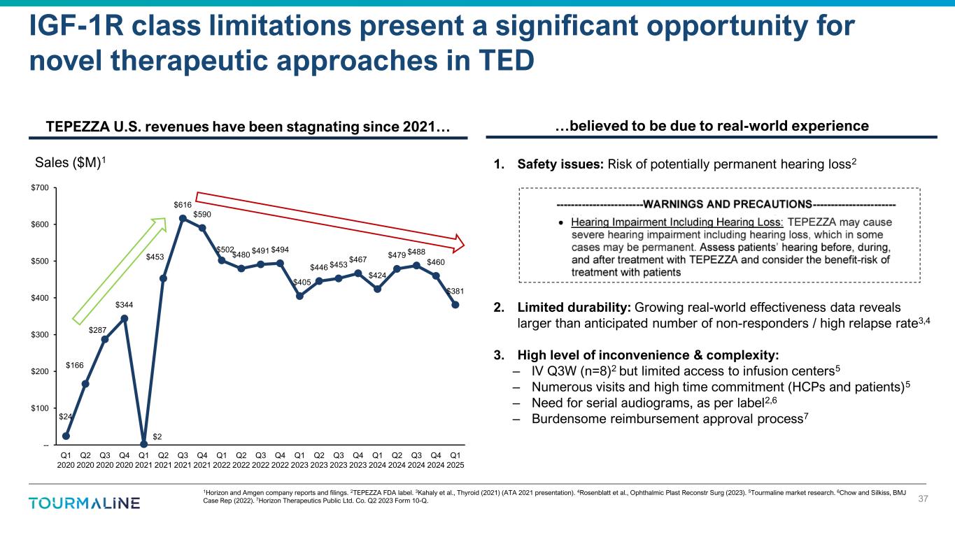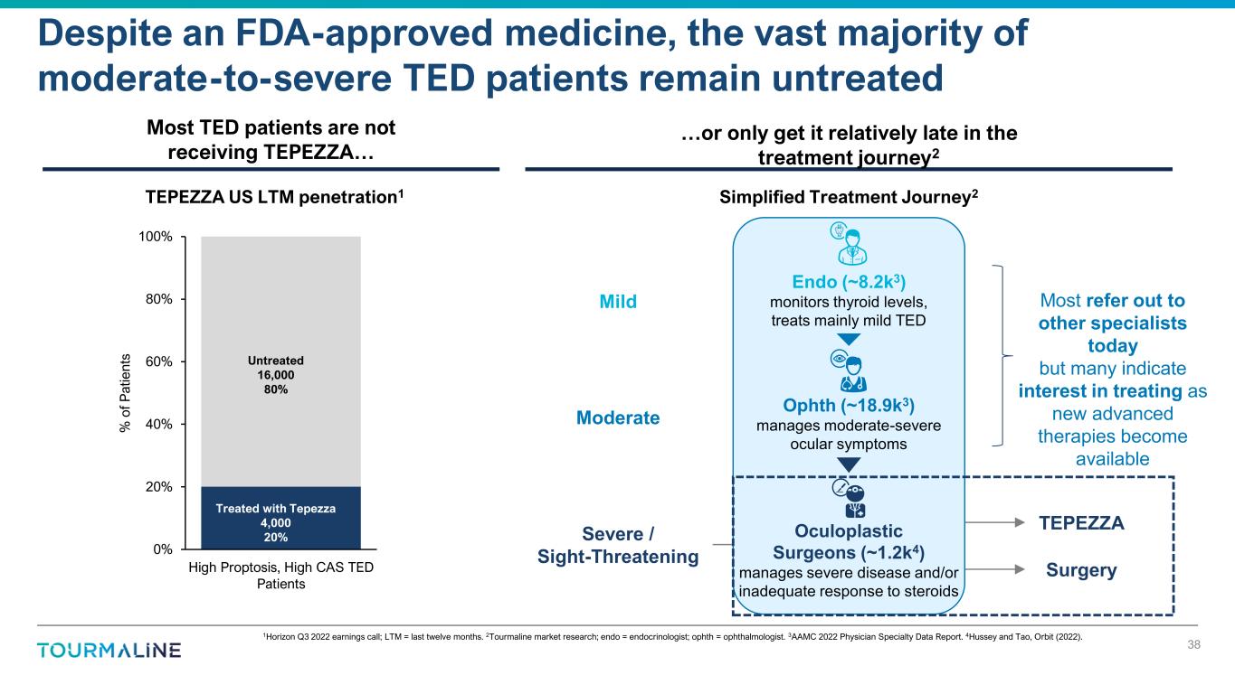 $24 $166 $287 $344 $2 $453 $616 $590 $502 $480 $491 $494 $405 $446 $453 $467 $424 $479 $488 $460 $381 -- $100 $200 $300 $400 $500 $600 $700 Q1 2020 Q2 2020 Q3 2020 Q4 2020 Q1 2021 Q2 2021 Q3 2021 Q4 2021 Q1 2022 Q2 2022 Q3 2022 Q4 2022 Q1 2023 Q2 2023 Q3 2023 Q4 2023 Q1 2024 Q2 2024 Q3 2024 Q4 2024 Q1 2025 1. Safety issues: Risk of potentially permanent hearing loss2 2. Limited durability: Growing real-world effectiveness data reveals larger than anticipated number of non-responders / high relapse rate3,4 3. High level of inconvenience & complexity: – IV Q3W (n=8)2 but limited access to infusion centers5 – Numerous visits and high time commitment (HCPs and patients)5 – Need for serial audiograms, as per label2,6 – Burdensome reimbursement approval process7 1Horizon and Amgen company reports and filings. 2TEPEZZA FDA label. 3Kahaly et al., Thyroid (2021) (ATA 2021 presentation). 4Rosenblatt et al., Ophthalmic Plast Reconstr Surg (2023). 5Tourmaline market research. 6Chow and Silkiss, BMJ Case Rep (2022). 7Horizon Therapeutics Public Ltd. Co. Q2 2023 Form 10-Q. IGF-1R class limitations present a significant opportunity for novel therapeutic approaches in TED 37 Sales ($M)1 TEPEZZA U.S. revenues have been stagnating since 2021… …believed to be due to real-world experience