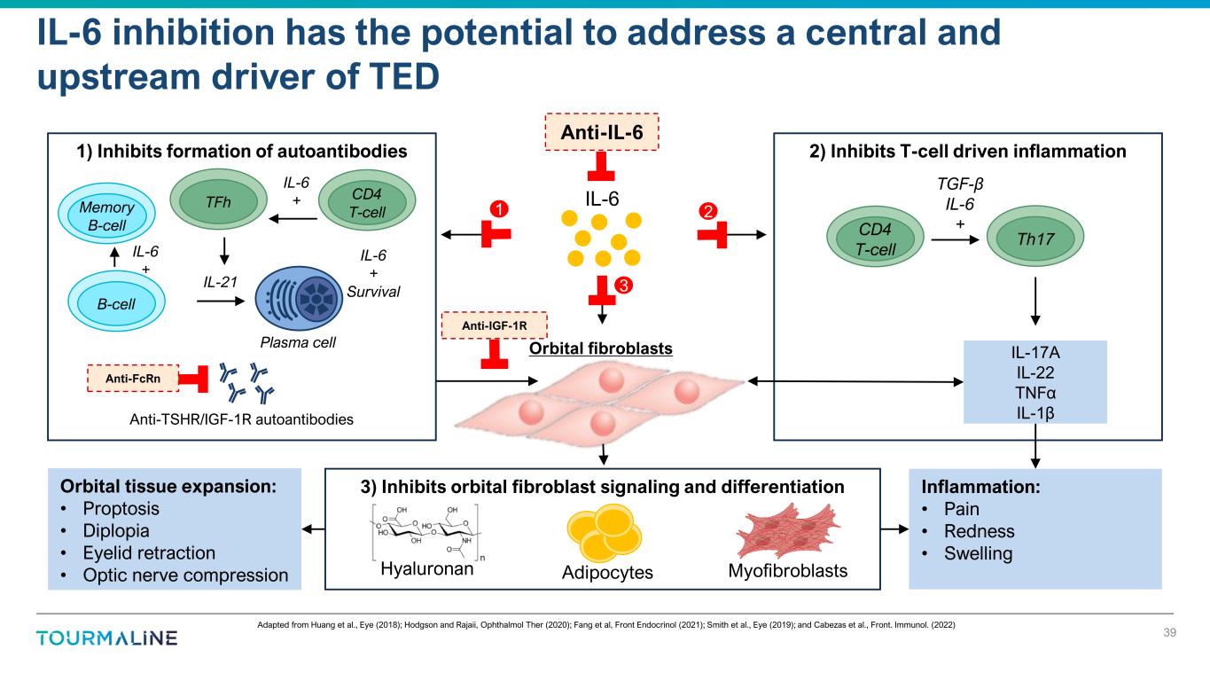 Adapted from Huang et al., Eye (2018); Hodgson and Rajaii, Ophthalmol Ther (2020); Fang et al, Front Endocrinol (2021); Smith et al., Eye (2019); and Cabezas et al., Front. Immunol. (2022) IL-6 inhibition has the potential to address a central and upstream driver of TED 39 Adipocytes MyofibroblastsHyaluronan 3) Inhibits orbital fibroblast signaling and differentiation Inflammation: • Pain • Redness • Swelling Orbital tissue expansion: • Proptosis • Diplopia • Eyelid retraction • Optic nerve compression Anti-TSHR/IGF-1R autoantibodies IL-6 Orbital fibroblasts 2) Inhibits T-cell driven inflammation1) Inhibits formation of autoantibodies CD4 T-cell TFhMemory B-cell B-cell IL-6 + IL-6 + IL-6 + Survival Plasma cell IL-21 Th17 CD4 T-cell TGF-β IL-6 + IL-17A IL-22 TNFα IL-1β Anti-FcRn Anti-IGF-1R Anti-IL-6 1 3 2