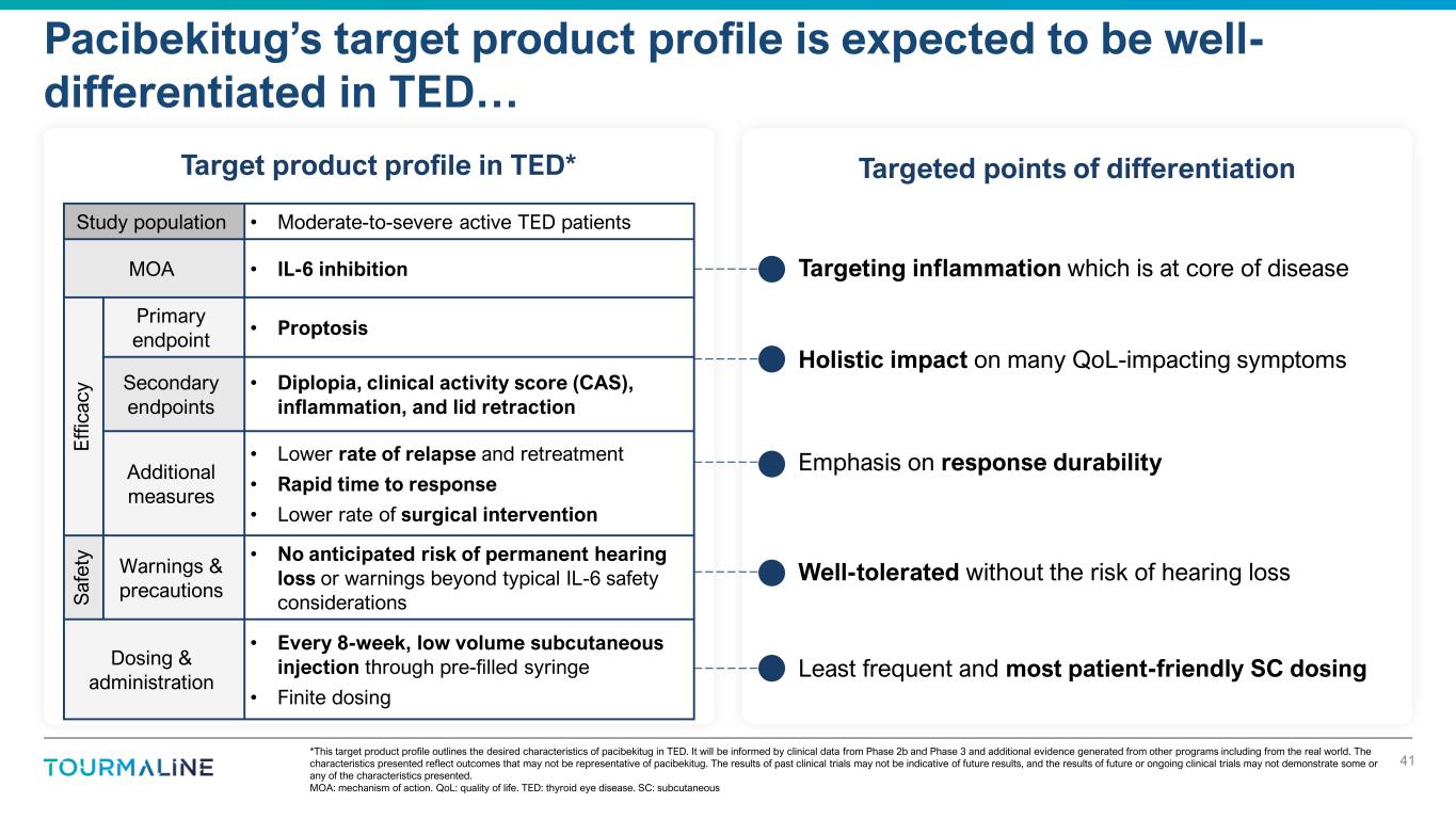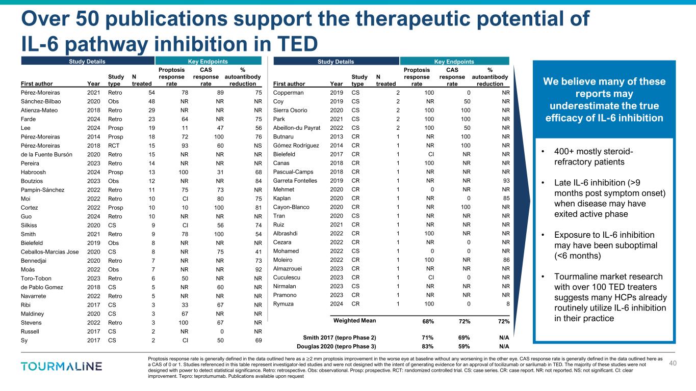 Proptosis response rate is generally defined in the data outlined here as a ≥2 mm proptosis improvement in the worse eye at baseline without any worsening in the other eye. CAS response rate is generally defined in the data outlined here as a CAS of 0 or 1. Studies referenced in this table represent investigator-led studies and were not designed with the intent of generating evidence for an approval of tocilizumab or sarilumab in TED. The majority of these studies were not designed with power to detect statistical significance. Retro: retrospective. Obs: observational. Prosp: prospective. RCT: randomized controlled trial. CS: case series. CR: case report. NR: not reported. NS: not significant. CI: clear improvement. Tepro: teprotumumab. Publications available upon request Over 50 publications support the therapeutic potential of IL-6 pathway inhibition in TED 40 • 400+ mostly steroid- refractory patients • Late IL-6 inhibition (>9 months post symptom onset) when disease may have exited active phase • Exposure to IL-6 inhibition may have been suboptimal (<6 months) • Tourmaline market research with over 100 TED treaters suggests many HCPs already routinely utilize IL-6 inhibition in their practice We believe many of these reports may underestimate the true efficacy of IL-6 inhibition Study Details Key Endpoints First author Year Study type N treated Proptosis response rate CAS response rate % autoantibody reduction Pérez-Moreiras 2021 Retro 54 78 89 75 Sánchez-Bilbao 2020 Obs 48 NR NR NR Atienza-Mateo 2018 Retro 29 NR NR NR Farde 2024 Retro 23 64 NR 75 Lee 2024 Prosp 19 11 47 56 Pérez-Moreiras 2014 Prosp 18 72 100 76 Pérez-Moreiras 2018 RCT 15 93 60 NS de la Fuente Bursón 2020 Retro 15 NR NR NR Pereira 2023 Retro 14 NR NR NR Habroosh 2024 Prosp 13 100 31 68 Boutzios 2023 Obs 12 NR NR 84 Pampín-Sánchez 2022 Retro 11 75 73 NR Moi 2022 Retro 10 CI 80 75 Cortez 2022 Prosp 10 10 100 81 Guo 2024 Retro 10 NR NR NR Silkiss 2020 CS 9 CI 56 74 Smith 2021 Retro 9 78 100 54 Bielefeld 2019 Obs 8 NR NR NR Ceballos-Marcias Jose 2020 CS 8 NR 75 41 Bennedjai 2020 Retro 7 NR NR 73 Moás 2022 Obs 7 NR NR 92 Toro-Tobon 2023 Retro 6 50 NR NR de Pablo Gomez 2018 CS 5 NR 60 NR Navarrete 2022 Retro 5 NR NR NR Ribi 2017 CS 3 33 67 NR Maldiney 2020 CS 3 67 NR NR Stevens 2022 Retro 3 100 67 NR Russell 2017 CS 2 NR 0 NR Sy 2017 CS 2 CI 50 69 Study Details Key Endpoints First author Year Study type N treated Proptosis response rate CAS response rate % autoantibody reduction Copperman 2019 CS 2 100 0 NR Coy 2019 CS 2 NR 50 NR Sierra Osorio 2020 CS 2 100 100 NR Park 2021 CS 2 100 100 NR Abeillon-du Payrat 2022 CS 2 100 50 NR Butnaru 2013 CR 1 NR 100 NR Gómez Rodríguez 2014 CR 1 NR 100 NR Bielefeld 2017 CR 1 CI NR NR Canas 2018 CR 1 100 NR NR Pascual-Camps 2018 CR 1 NR NR NR Garreta Fontelles 2019 CR 1 NR NR 93 Mehmet 2020 CR 1 0 NR NR Kaplan 2020 CR 1 NR 0 85 Cayon-Blanco 2020 CR 1 NR 100 NR Tran 2020 CS 1 NR NR NR Ruiz 2021 CR 1 NR NR NR Albrashdi 2022 CR 1 100 NR NR Cezara 2022 CR 1 NR 0 NR Mohamed 2022 CS 1 0 0 NR Moleiro 2022 CR 1 100 NR 86 Almazrouei 2023 CR 1 NR NR NR Cuculescu 2023 CR 1 CI 0 NR Nirmalan 2023 CS 1 NR NR NR Pramono 2023 CR 1 NR NR NR Rymuza 2024 CR 1 100 0 8 Weighted Mean 68% 72% 72% Smith 2017 (tepro Phase 2) 71% 69% N/A Douglas 2020 (tepro Phase 3) 83% 59% N/A