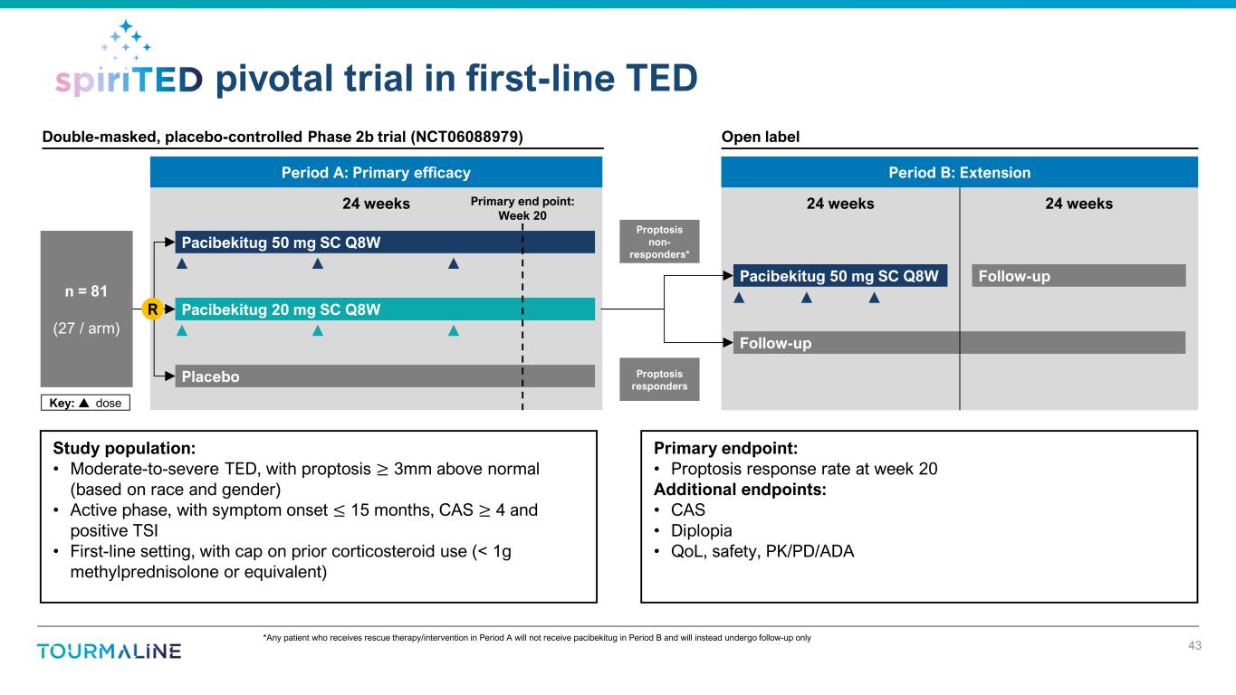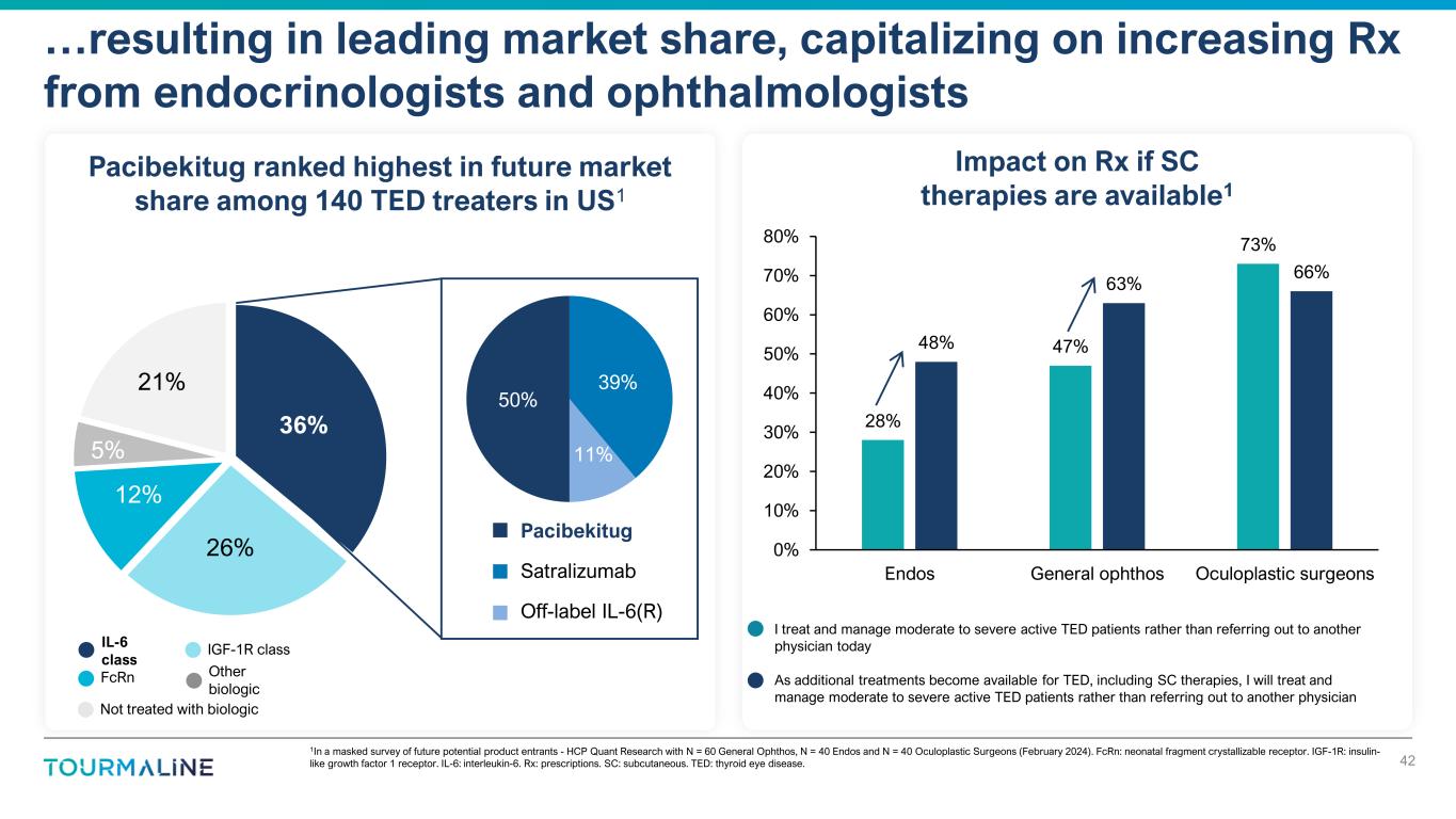 *This target product profile outlines the desired characteristics of pacibekitug in TED. It will be informed by clinical data from Phase 2b and Phase 3 and additional evidence generated from other programs including from the real world. The characteristics presented reflect outcomes that may not be representative of pacibekitug. The results of past clinical trials may not be indicative of future results, and the results of future or ongoing clinical trials may not demonstrate some or any of the characteristics presented. MOA: mechanism of action. QoL: quality of life. TED: thyroid eye disease. SC: subcutaneous Pacibekitug’s target product profile is expected to be well- differentiated in TED… 41 Target product profile in TED* Targeted points of differentiation Study population • Moderate-to-severe active TED patients MOA • IL-6 inhibition E ff ic a c y Primary endpoint • Proptosis Secondary endpoints • Diplopia, clinical activity score (CAS), inflammation, and lid retraction Additional measures • Lower rate of relapse and retreatment • Rapid time to response • Lower rate of surgical intervention S a fe ty Warnings & precautions • No anticipated risk of permanent hearing loss or warnings beyond typical IL-6 safety considerations Dosing & administration • Every 8-week, low volume subcutaneous injection through pre-filled syringe • Finite dosing Targeting inflammation which is at core of disease Holistic impact on many QoL-impacting symptoms Emphasis on response durability Well-tolerated without the risk of hearing loss Least frequent and most patient-friendly SC dosing