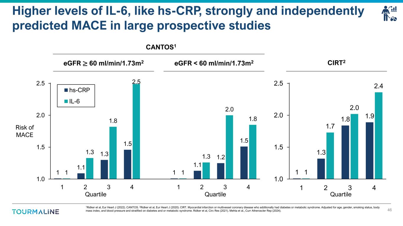 0.8 1.0 1.2 1.4 1.6 1 2 3 4 1 2 3 4 1 2 3 4 1 2 3 4 1 2 3 4 1 2 3 4 Hazard ratios shown. Major adverse cardiovascular events (MACE) include myocardial infarction, stroke, coronary revascularization, cardiovascular (CV) death. CKD: chronic kidney disease. hs-CRP: high-sensitivity C-reactive protein. LDL: low-density lipoprotein cholesterol. Certain data in this presentation are based on a cross-trial comparison and are not based on head-to-head clinical trials. Cross trial comparisons are inherently limited and may suggest misleading similarities or differences in outcomes. Results of head-to-head comparisons may differ significantly from those set forth herein. 1Ridker et al., Lancet (2023). 2Ridker et al., Circulation (2023). 3Ridker et al., Eur Heart J (2022). Multiple observational studies show hs-CRP levels predict future MACE even better than cholesterol in high-risk populations 45 LDL-C hs-CRP Risk of MACE ASCVD or high risk of ASCVD1 (n=31,245) LDL-C hs-CRP LDL-C hs-CRP 0.4 1.0 1.6 2.2 2.8 1 2 3 4 1 2 3 4 1 2 3 4 1 2 3 4 1 2 3 4 1 2 3 4 Risk of CV death (downstream biomarker of IL-6 activity) CANTOS CKD subgroup3 (n=1,192) CLEAR-Outcomes2 (n=13,970) Quartile Quartile Quartile Quartile Quartile Quartile Quartile Quartile Quartile Quartile Quartile Quartile LDL-C hs-CRP