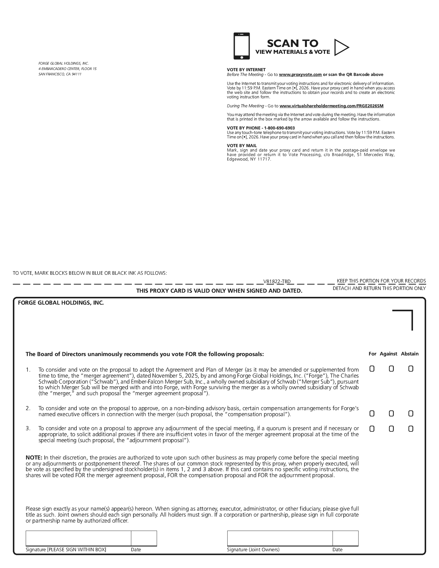 Unless otherwise indicated or as the context otherwise requires, all references to “Forge,” the “Company,” “we,” “us,” or “our” in this proxy statement refer to Forge Global Holdings, Inc., a Delaware corporation; all references to “Schwab” refer to The Charles Schwab Corporation, a Delaware corporation; all references to “Merger Sub” refer to Ember-Falcon Merger Sub, Inc., a Delaware corporation and a wholly owned subsidiary of Schwab formed for the sole purpose of effecting the merger; all references to the “Special Committee” refer to the special committee formed by the Board and comprised solely of independent and disinterested directors; all references to “common stock” refer to the common stock, par value $0.0001, of Forge; all references to the “Board” refer to the board of directors of Forge; all references to the “merger” refer to the proposed merger of Merger Sub with and into Forge, with Forge surviving as a wholly owned subsidiary of Schwab; all references to the “merger agreement” refer to the Agreement and Plan of Merger, dated as of November 5, 2025, as it may be amended from time to time, by and among Forge, Schwab and Merger Sub, a copy of which is included as Annex A to this proxy statement; and all references to the support agreements collectively refer to (i) that certain support agreement, dated as of November 5, 2025 among Schwab and Motive Capital Fund I-A, LP, Motive Capital Fund I-B, LP, Motive Capital Fund I-MPF, LP, MCF2 FG Aggregator, LLC and Motive Capital Funds Sponsor, LLC (the “Motive Entities” and such support agreement, the “Motive support agreement”), a copy of which is included as Annex B to this proxy statement and (ii) that certain support agreement, dated as of November 5, 2025 between Schwab and Deutsche Börse AG (“DB” and such support agreement, the “DB support agreement”), a copy of which is included as Annex C to this proxy statement. Forge, following the completion of the merger, is sometimes referred to in this proxy statement as the “surviving corporation.”
