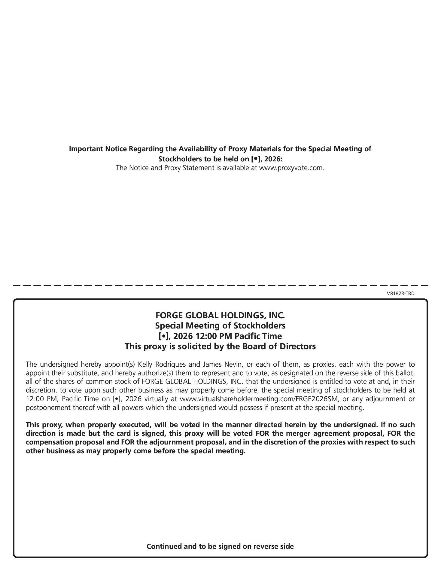 The special meeting (the “special meeting”) of stockholders of Forge Global Holdings, Inc. (“Forge”) will be held virtually via the Internet at www.virtualshareholdermeeting.com/FRGE2026SM (the “virtual meeting website”), where you will be able to attend the special meeting, vote, and submit your questions during the special meeting. You will not be able to attend the special meeting in person.