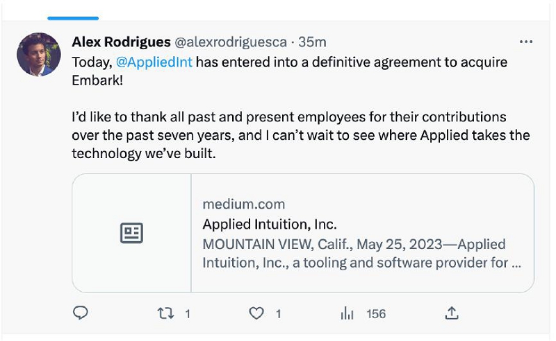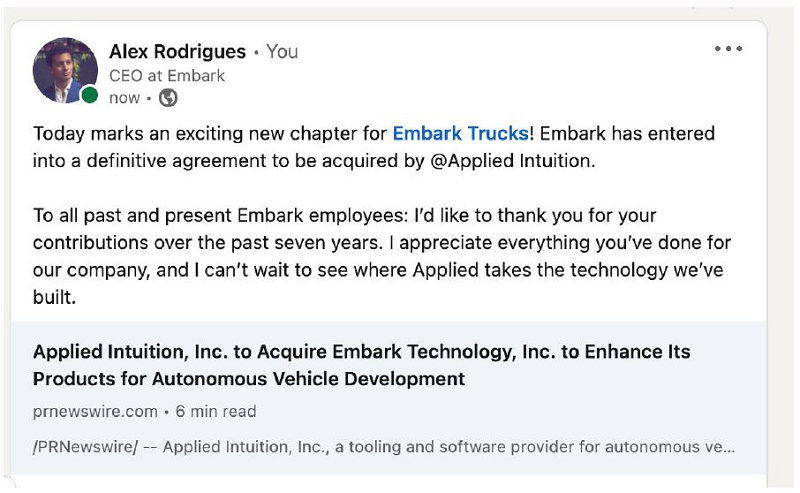 On May 25, 2023, Alex Rodrigues, the Chief Executive Officer of Embark, made the following post on Twitter:
