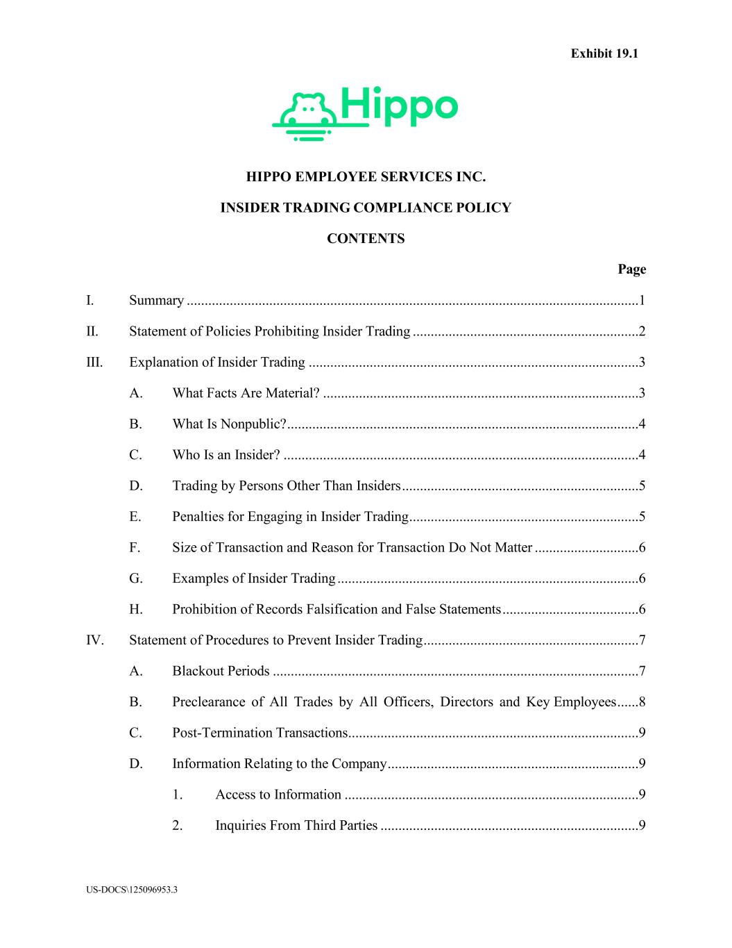 US-DOCS\125096953.3 HIPPO EMPLOYEE SERVICES INC. INSIDER TRADING COMPLIANCE POLICY (Adopted December 8, 2022) (Amended effective March 5, 2025) Federal and state laws prohibit trading in the securities of a company while in possession of material nonpublic information and providing material nonpublic information to others so that they can trade. Violating such laws can undermine investor trust, harm Hippo’s reputation, and result in your dismissal from Hippo Employee Services Inc. (together with its affiliates, the “Company”) or even serious criminal and civil charges against you and the Company. This Insider Trading Compliance Policy (this “Policy”) outlines your responsibilities to avoid insider trading and implements certain procedures to help you avoid even the appearance of insider trading. I. Summary Preventing insider trading is necessary to comply with securities laws and to preserve the reputation and integrity of the Company. “Insider trading” occurs when any person purchases or sells a security while in possession of material nonpublic information relating to the security. Insider trading is a crime. The criminal penalties for violating insider trading laws include imprisonment and fines of up to $5 million for individuals and $25 million for corporations. Insider trading may also result in civil penalties, including disgorgement of profits and civil fines. Insider trading is also prohibited by this Policy, and violation of this Policy may result in Company- imposed sanctions, including removal or dismissal for cause. This Policy applies to all officers, directors, and employees of the Company. As someone subject to this Policy, you are responsible for ensuring that members of your household also comply with this Policy. This Policy also applies to any entities you control or are controlled by individuals subject to this Policy (including any corporations, partnerships or trusts) and transactions by such entities should be treated for the purposes of this Policy and applicable securities laws as if they were for your own account. The Company may determine that this Policy applies to additional persons with access to material nonpublic information, such as contractors or consultants. This Policy extends to all activities within and outside your Company duties. Every officer, director, and employee must review this Policy. Questions regarding this Policy should be directed to the Company’s General Counsel and Vice President of Compliance (as defined below). Tracy Bowden, General Counsel and Vice President of Compliance (the “Compliance Officer”) shall be responsible for the administration of this Policy. In the absence of the Compliance Officer, responsibility for administering this Policy will rest with Chief Financial Officer or such other employee as may be designated by the Compliance Officer.