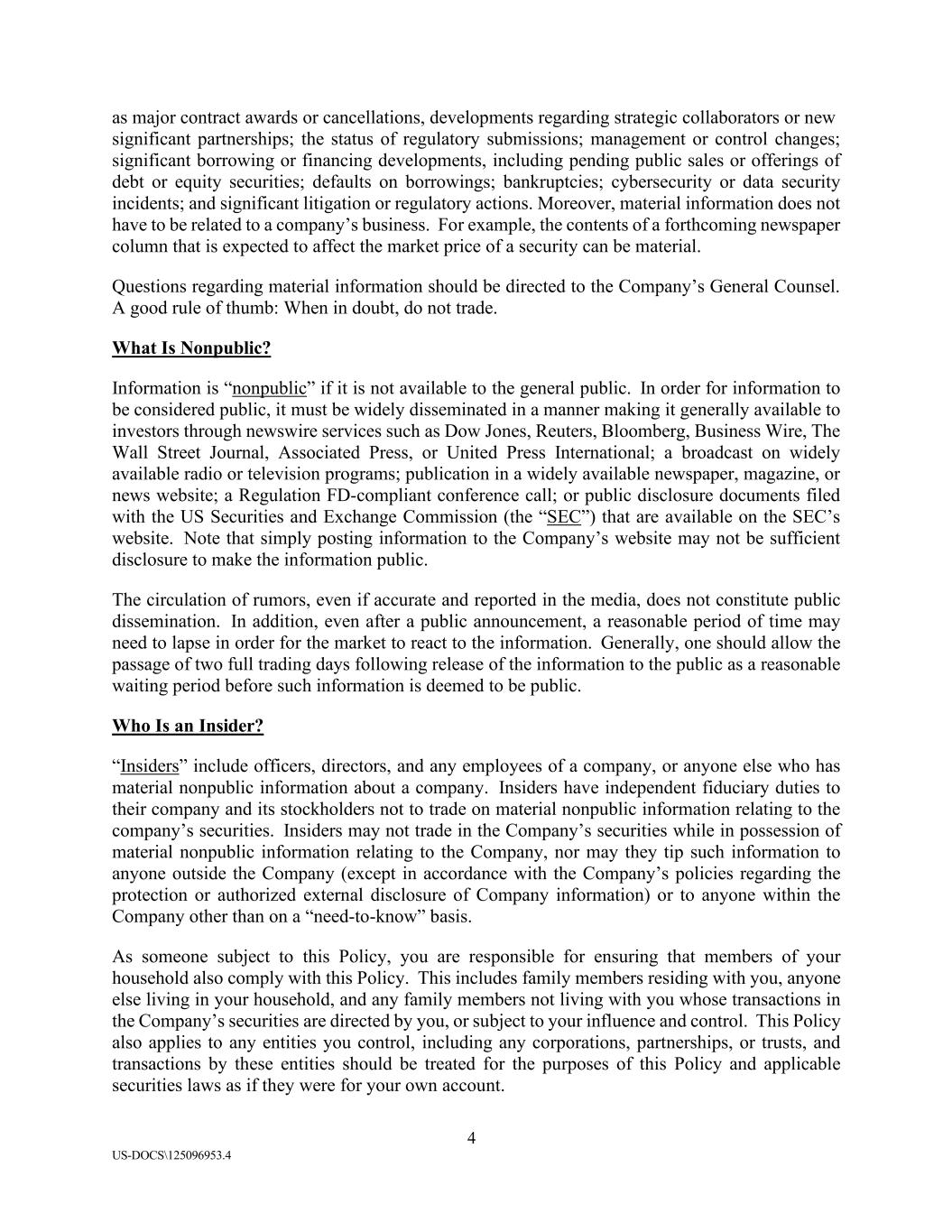 4 US-DOCS\125096953.4 as major contract awards or cancellations, developments regarding strategic collaborators or new significant partnerships; the status of regulatory submissions; management or control changes; significant borrowing or financing developments, including pending public sales or offerings of debt or equity securities; defaults on borrowings; bankruptcies; cybersecurity or data security incidents; and significant litigation or regulatory actions. Moreover, material information does not have to be related to a company’s business. For example, the contents of a forthcoming newspaper column that is expected to affect the market price of a security can be material. Questions regarding material information should be directed to the Company’s General Counsel. A good rule of thumb: When in doubt, do not trade. What Is Nonpublic? Information is “nonpublic” if it is not available to the general public. In order for information to be considered public, it must be widely disseminated in a manner making it generally available to investors through newswire services such as Dow Jones, Reuters, Bloomberg, Business Wire, The Wall Street Journal, Associated Press, or United Press International; a broadcast on widely available radio or television programs; publication in a widely available newspaper, magazine, or news website; a Regulation FD-compliant conference call; or public disclosure documents filed with the US Securities and Exchange Commission (the “SEC”) that are available on the SEC’s website. Note that simply posting information to the Company’s website may not be sufficient disclosure to make the information public. The circulation of rumors, even if accurate and reported in the media, does not constitute public dissemination. In addition, even after a public announcement, a reasonable period of time may need to lapse in order for the market to react to the information. Generally, one should allow the passage of two full trading days following release of the information to the public as a reasonable waiting period before such information is deemed to be public. Who Is an Insider? “Insiders” include officers, directors, and any employees of a company, or anyone else who has material nonpublic information about a company. Insiders have independent fiduciary duties to their company and its stockholders not to trade on material nonpublic information relating to the company’s securities. Insiders may not trade in the Company’s securities while in possession of material nonpublic information relating to the Company, nor may they tip such information to anyone outside the Company (except in accordance with the Company’s policies regarding the protection or authorized external disclosure of Company information) or to anyone within the Company other than on a “need-to-know” basis. As someone subject to this Policy, you are responsible for ensuring that members of your household also comply with this Policy. This includes family members residing with you, anyone else living in your household, and any family members not living with you whose transactions in the Company’s securities are directed by you, or subject to your influence and control. This Policy also applies to any entities you control, including any corporations, partnerships, or trusts, and transactions by these entities should be treated for the purposes of this Policy and applicable securities laws as if they were for your own account.