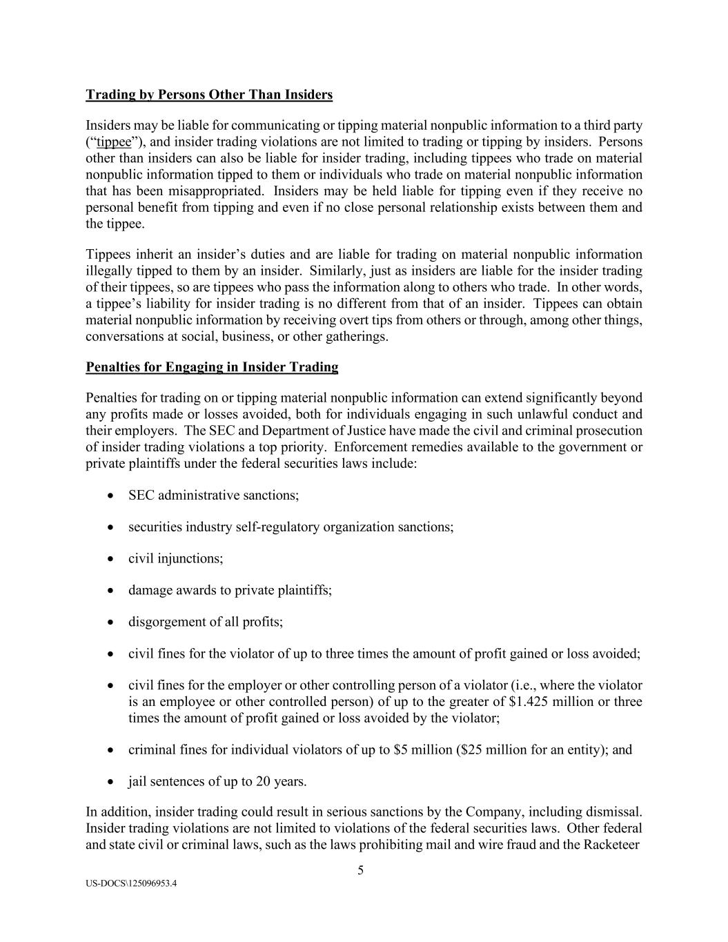 5 US-DOCS\125096953.4 Trading by Persons Other Than Insiders Insiders may be liable for communicating or tipping material nonpublic information to a third party (“tippee”), and insider trading violations are not limited to trading or tipping by insiders. Persons other than insiders can also be liable for insider trading, including tippees who trade on material nonpublic information tipped to them or individuals who trade on material nonpublic information that has been misappropriated. Insiders may be held liable for tipping even if they receive no personal benefit from tipping and even if no close personal relationship exists between them and the tippee. Tippees inherit an insider’s duties and are liable for trading on material nonpublic information illegally tipped to them by an insider. Similarly, just as insiders are liable for the insider trading of their tippees, so are tippees who pass the information along to others who trade. In other words, a tippee’s liability for insider trading is no different from that of an insider. Tippees can obtain material nonpublic information by receiving overt tips from others or through, among other things, conversations at social, business, or other gatherings. Penalties for Engaging in Insider Trading Penalties for trading on or tipping material nonpublic information can extend significantly beyond any profits made or losses avoided, both for individuals engaging in such unlawful conduct and their employers. The SEC and Department of Justice have made the civil and criminal prosecution of insider trading violations a top priority. Enforcement remedies available to the government or private plaintiffs under the federal securities laws include: • SEC administrative sanctions; • securities industry self-regulatory organization sanctions; • civil injunctions; • damage awards to private plaintiffs; • disgorgement of all profits; • civil fines for the violator of up to three times the amount of profit gained or loss avoided; • civil fines for the employer or other controlling person of a violator (i.e., where the violator is an employee or other controlled person) of up to the greater of $1.425 million or three times the amount of profit gained or loss avoided by the violator; • criminal fines for individual violators of up to $5 million ($25 million for an entity); and • jail sentences of up to 20 years. In addition, insider trading could result in serious sanctions by the Company, including dismissal. Insider trading violations are not limited to violations of the federal securities laws. Other federal and state civil or criminal laws, such as the laws prohibiting mail and wire fraud and the Racketeer