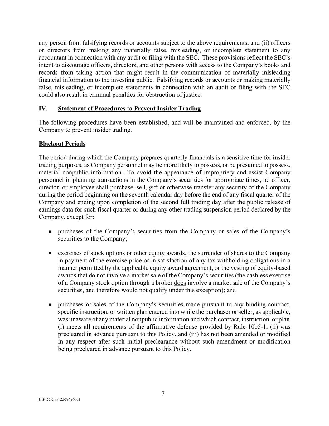7 US-DOCS\125096953.4 any person from falsifying records or accounts subject to the above requirements, and (ii) officers or directors from making any materially false, misleading, or incomplete statement to any accountant in connection with any audit or filing with the SEC. These provisions reflect the SEC’s intent to discourage officers, directors, and other persons with access to the Company’s books and records from taking action that might result in the communication of materially misleading financial information to the investing public. Falsifying records or accounts or making materially false, misleading, or incomplete statements in connection with an audit or filing with the SEC could also result in criminal penalties for obstruction of justice. IV. Statement of Procedures to Prevent Insider Trading The following procedures have been established, and will be maintained and enforced, by the Company to prevent insider trading. Blackout Periods The period during which the Company prepares quarterly financials is a sensitive time for insider trading purposes, as Company personnel may be more likely to possess, or be presumed to possess, material nonpublic information. To avoid the appearance of impropriety and assist Company personnel in planning transactions in the Company’s securities for appropriate times, no officer, director, or employee shall purchase, sell, gift or otherwise transfer any security of the Company during the period beginning on the seventh calendar day before the end of any fiscal quarter of the Company and ending upon completion of the second full trading day after the public release of earnings data for such fiscal quarter or during any other trading suspension period declared by the Company, except for: • purchases of the Company’s securities from the Company or sales of the Company’s securities to the Company; • exercises of stock options or other equity awards, the surrender of shares to the Company in payment of the exercise price or in satisfaction of any tax withholding obligations in a manner permitted by the applicable equity award agreement, or the vesting of equity-based awards that do not involve a market sale of the Company’s securities (the cashless exercise of a Company stock option through a broker does involve a market sale of the Company’s securities, and therefore would not qualify under this exception); and • purchases or sales of the Company’s securities made pursuant to any binding contract, specific instruction, or written plan entered into while the purchaser or seller, as applicable, was unaware of any material nonpublic information and which contract, instruction, or plan (i) meets all requirements of the affirmative defense provided by Rule 10b5-1, (ii) was precleared in advance pursuant to this Policy, and (iii) has not been amended or modified in any respect after such initial preclearance without such amendment or modification being precleared in advance pursuant to this Policy.