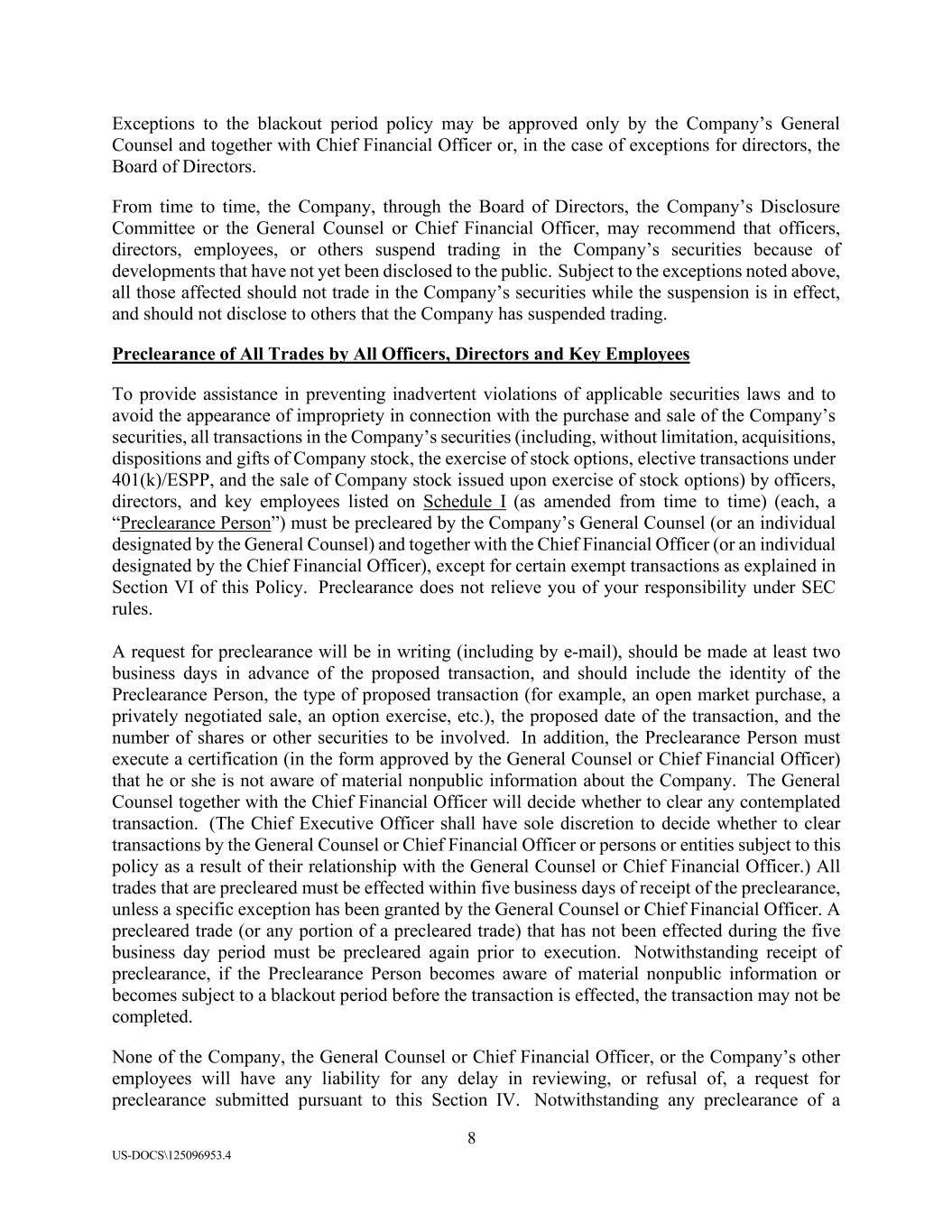 8 US-DOCS\125096953.4 Exceptions to the blackout period policy may be approved only by the Company’s General Counsel and together with Chief Financial Officer or, in the case of exceptions for directors, the Board of Directors. From time to time, the Company, through the Board of Directors, the Company’s Disclosure Committee or the General Counsel or Chief Financial Officer, may recommend that officers, directors, employees, or others suspend trading in the Company’s securities because of developments that have not yet been disclosed to the public. Subject to the exceptions noted above, all those affected should not trade in the Company’s securities while the suspension is in effect, and should not disclose to others that the Company has suspended trading. Preclearance of All Trades by All Officers, Directors and Key Employees To provide assistance in preventing inadvertent violations of applicable securities laws and to avoid the appearance of impropriety in connection with the purchase and sale of the Company’s securities, all transactions in the Company’s securities (including, without limitation, acquisitions, dispositions and gifts of Company stock, the exercise of stock options, elective transactions under 401(k)/ESPP, and the sale of Company stock issued upon exercise of stock options) by officers, directors, and key employees listed on Schedule I (as amended from time to time) (each, a “Preclearance Person”) must be precleared by the Company’s General Counsel (or an individual designated by the General Counsel) and together with the Chief Financial Officer (or an individual designated by the Chief Financial Officer), except for certain exempt transactions as explained in Section VI of this Policy. Preclearance does not relieve you of your responsibility under SEC rules. A request for preclearance will be in writing (including by e-mail), should be made at least two business days in advance of the proposed transaction, and should include the identity of the Preclearance Person, the type of proposed transaction (for example, an open market purchase, a privately negotiated sale, an option exercise, etc.), the proposed date of the transaction, and the number of shares or other securities to be involved. In addition, the Preclearance Person must execute a certification (in the form approved by the General Counsel or Chief Financial Officer) that he or she is not aware of material nonpublic information about the Company. The General Counsel together with the Chief Financial Officer will decide whether to clear any contemplated transaction. (The Chief Executive Officer shall have sole discretion to decide whether to clear transactions by the General Counsel or Chief Financial Officer or persons or entities subject to this policy as a result of their relationship with the General Counsel or Chief Financial Officer.) All trades that are precleared must be effected within five business days of receipt of the preclearance, unless a specific exception has been granted by the General Counsel or Chief Financial Officer. A precleared trade (or any portion of a precleared trade) that has not been effected during the five business day period must be precleared again prior to execution. Notwithstanding receipt of preclearance, if the Preclearance Person becomes aware of material nonpublic information or becomes subject to a blackout period before the transaction is effected, the transaction may not be completed. None of the Company, the General Counsel or Chief Financial Officer, or the Company’s other employees will have any liability for any delay in reviewing, or refusal of, a request for preclearance submitted pursuant to this Section IV. Notwithstanding any preclearance of a