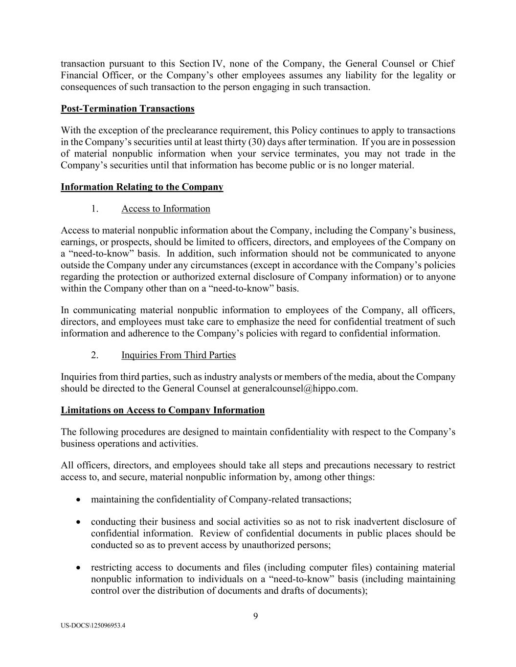 9 US-DOCS\125096953.4 transaction pursuant to this Section IV, none of the Company, the General Counsel or Chief Financial Officer, or the Company’s other employees assumes any liability for the legality or consequences of such transaction to the person engaging in such transaction. Post-Termination Transactions With the exception of the preclearance requirement, this Policy continues to apply to transactions in the Company’s securities until at least thirty (30) days after termination. If you are in possession of material nonpublic information when your service terminates, you may not trade in the Company’s securities until that information has become public or is no longer material. Information Relating to the Company 1. Access to Information Access to material nonpublic information about the Company, including the Company’s business, earnings, or prospects, should be limited to officers, directors, and employees of the Company on a “need-to-know” basis. In addition, such information should not be communicated to anyone outside the Company under any circumstances (except in accordance with the Company’s policies regarding the protection or authorized external disclosure of Company information) or to anyone within the Company other than on a “need-to-know” basis. In communicating material nonpublic information to employees of the Company, all officers, directors, and employees must take care to emphasize the need for confidential treatment of such information and adherence to the Company’s policies with regard to confidential information. 2. Inquiries From Third Parties Inquiries from third parties, such as industry analysts or members of the media, about the Company should be directed to the General Counsel at generalcounsel@hippo.com. Limitations on Access to Company Information The following procedures are designed to maintain confidentiality with respect to the Company’s business operations and activities. All officers, directors, and employees should take all steps and precautions necessary to restrict access to, and secure, material nonpublic information by, among other things: • maintaining the confidentiality of Company-related transactions; • conducting their business and social activities so as not to risk inadvertent disclosure of confidential information. Review of confidential documents in public places should be conducted so as to prevent access by unauthorized persons; • restricting access to documents and files (including computer files) containing material nonpublic information to individuals on a “need-to-know” basis (including maintaining control over the distribution of documents and drafts of documents);