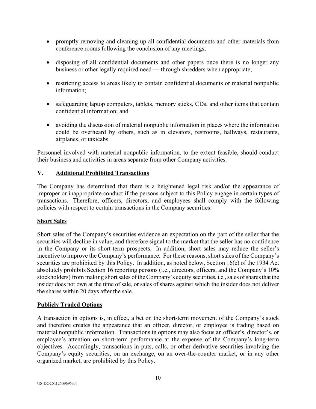 10 US-DOCS\125096953.4 • promptly removing and cleaning up all confidential documents and other materials from conference rooms following the conclusion of any meetings; • disposing of all confidential documents and other papers once there is no longer any business or other legally required need — through shredders when appropriate; • restricting access to areas likely to contain confidential documents or material nonpublic information; • safeguarding laptop computers, tablets, memory sticks, CDs, and other items that contain confidential information; and • avoiding the discussion of material nonpublic information in places where the information could be overheard by others, such as in elevators, restrooms, hallways, restaurants, airplanes, or taxicabs. Personnel involved with material nonpublic information, to the extent feasible, should conduct their business and activities in areas separate from other Company activities. V. Additional Prohibited Transactions The Company has determined that there is a heightened legal risk and/or the appearance of improper or inappropriate conduct if the persons subject to this Policy engage in certain types of transactions. Therefore, officers, directors, and employees shall comply with the following policies with respect to certain transactions in the Company securities: Short Sales Short sales of the Company’s securities evidence an expectation on the part of the seller that the securities will decline in value, and therefore signal to the market that the seller has no confidence in the Company or its short-term prospects. In addition, short sales may reduce the seller’s incentive to improve the Company’s performance. For these reasons, short sales of the Company’s securities are prohibited by this Policy. In addition, as noted below, Section 16(c) of the 1934 Act absolutely prohibits Section 16 reporting persons (i.e., directors, officers, and the Company’s 10% stockholders) from making short sales of the Company’s equity securities, i.e., sales of shares that the insider does not own at the time of sale, or sales of shares against which the insider does not deliver the shares within 20 days after the sale. Publicly Traded Options A transaction in options is, in effect, a bet on the short-term movement of the Company’s stock and therefore creates the appearance that an officer, director, or employee is trading based on material nonpublic information. Transactions in options may also focus an officer’s, director’s, or employee’s attention on short-term performance at the expense of the Company’s long-term objectives. Accordingly, transactions in puts, calls, or other derivative securities involving the Company’s equity securities, on an exchange, on an over-the-counter market, or in any other organized market, are prohibited by this Policy.
