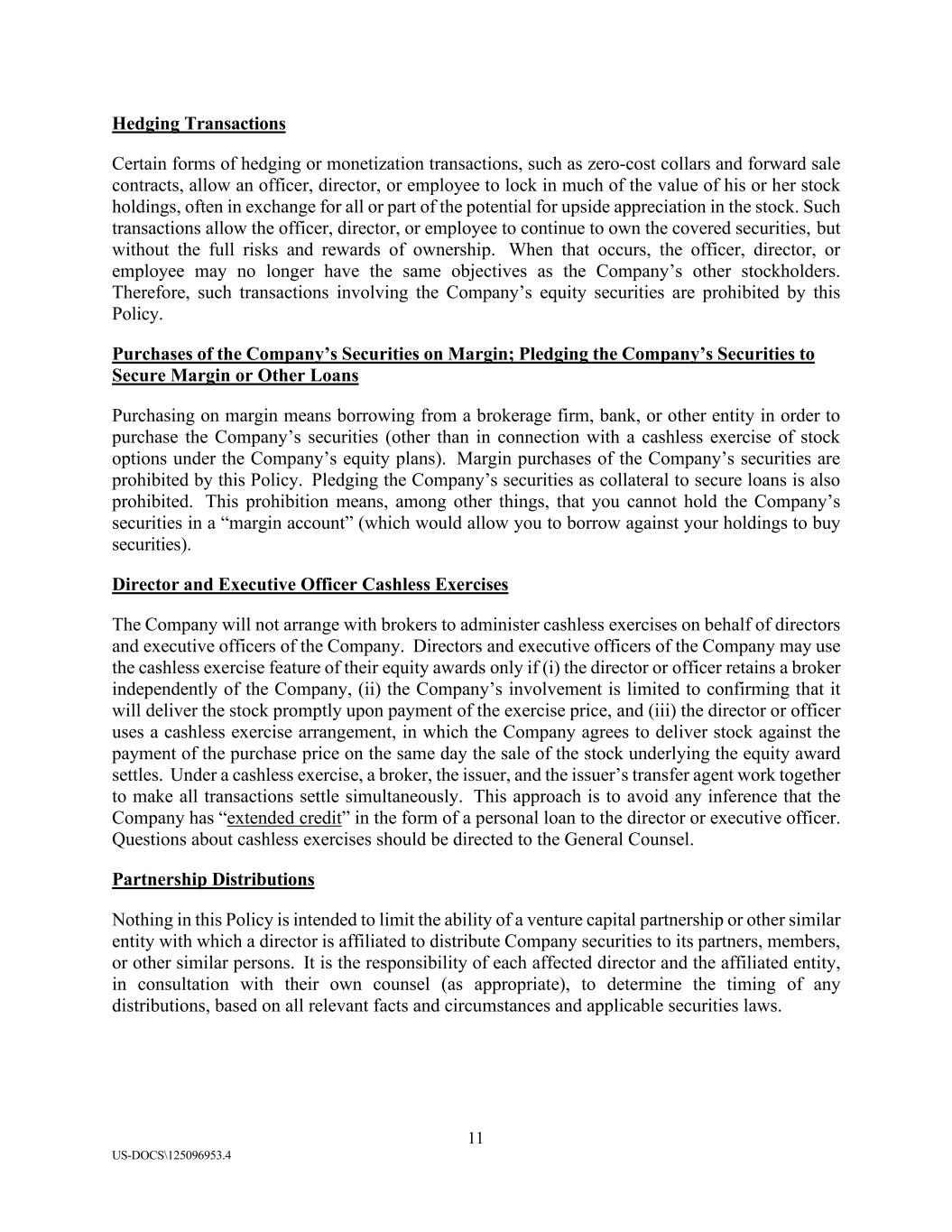 11 US-DOCS\125096953.4 Hedging Transactions Certain forms of hedging or monetization transactions, such as zero-cost collars and forward sale contracts, allow an officer, director, or employee to lock in much of the value of his or her stock holdings, often in exchange for all or part of the potential for upside appreciation in the stock. Such transactions allow the officer, director, or employee to continue to own the covered securities, but without the full risks and rewards of ownership. When that occurs, the officer, director, or employee may no longer have the same objectives as the Company’s other stockholders. Therefore, such transactions involving the Company’s equity securities are prohibited by this Policy. Purchases of the Company’s Securities on Margin; Pledging the Company’s Securities to Secure Margin or Other Loans Purchasing on margin means borrowing from a brokerage firm, bank, or other entity in order to purchase the Company’s securities (other than in connection with a cashless exercise of stock options under the Company’s equity plans). Margin purchases of the Company’s securities are prohibited by this Policy. Pledging the Company’s securities as collateral to secure loans is also prohibited. This prohibition means, among other things, that you cannot hold the Company’s securities in a “margin account” (which would allow you to borrow against your holdings to buy securities). Director and Executive Officer Cashless Exercises The Company will not arrange with brokers to administer cashless exercises on behalf of directors and executive officers of the Company. Directors and executive officers of the Company may use the cashless exercise feature of their equity awards only if (i) the director or officer retains a broker independently of the Company, (ii) the Company’s involvement is limited to confirming that it will deliver the stock promptly upon payment of the exercise price, and (iii) the director or officer uses a cashless exercise arrangement, in which the Company agrees to deliver stock against the payment of the purchase price on the same day the sale of the stock underlying the equity award settles. Under a cashless exercise, a broker, the issuer, and the issuer’s transfer agent work together to make all transactions settle simultaneously. This approach is to avoid any inference that the Company has “extended credit” in the form of a personal loan to the director or executive officer. Questions about cashless exercises should be directed to the General Counsel. Partnership Distributions Nothing in this Policy is intended to limit the ability of a venture capital partnership or other similar entity with which a director is affiliated to distribute Company securities to its partners, members, or other similar persons. It is the responsibility of each affected director and the affiliated entity, in consultation with their own counsel (as appropriate), to determine the timing of any distributions, based on all relevant facts and circumstances and applicable securities laws.