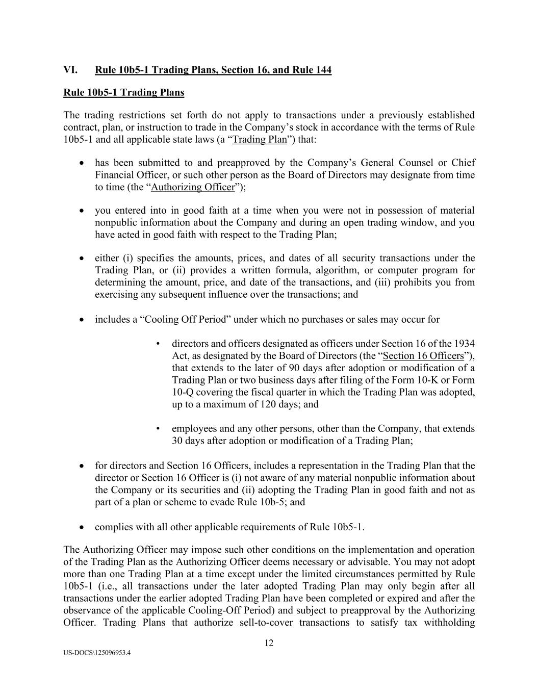 12 US-DOCS\125096953.4 VI. Rule 10b5-1 Trading Plans, Section 16, and Rule 144 Rule 10b5-1 Trading Plans The trading restrictions set forth do not apply to transactions under a previously established contract, plan, or instruction to trade in the Company’s stock in accordance with the terms of Rule 10b5-1 and all applicable state laws (a “Trading Plan”) that: • has been submitted to and preapproved by the Company’s General Counsel or Chief Financial Officer, or such other person as the Board of Directors may designate from time to time (the “Authorizing Officer”); • you entered into in good faith at a time when you were not in possession of material nonpublic information about the Company and during an open trading window, and you have acted in good faith with respect to the Trading Plan; • either (i) specifies the amounts, prices, and dates of all security transactions under the Trading Plan, or (ii) provides a written formula, algorithm, or computer program for determining the amount, price, and date of the transactions, and (iii) prohibits you from exercising any subsequent influence over the transactions; and • includes a “Cooling Off Period” under which no purchases or sales may occur for • directors and officers designated as officers under Section 16 of the 1934 Act, as designated by the Board of Directors (the “Section 16 Officers”), that extends to the later of 90 days after adoption or modification of a Trading Plan or two business days after filing of the Form 10-K or Form 10-Q covering the fiscal quarter in which the Trading Plan was adopted, up to a maximum of 120 days; and • employees and any other persons, other than the Company, that extends 30 days after adoption or modification of a Trading Plan; • for directors and Section 16 Officers, includes a representation in the Trading Plan that the director or Section 16 Officer is (i) not aware of any material nonpublic information about the Company or its securities and (ii) adopting the Trading Plan in good faith and not as part of a plan or scheme to evade Rule 10b-5; and • complies with all other applicable requirements of Rule 10b5-1. The Authorizing Officer may impose such other conditions on the implementation and operation of the Trading Plan as the Authorizing Officer deems necessary or advisable. You may not adopt more than one Trading Plan at a time except under the limited circumstances permitted by Rule 10b5-1 (i.e., all transactions under the later adopted Trading Plan may only begin after all transactions under the earlier adopted Trading Plan have been completed or expired and after the observance of the applicable Cooling-Off Period) and subject to preapproval by the Authorizing Officer. Trading Plans that authorize sell-to-cover transactions to satisfy tax withholding