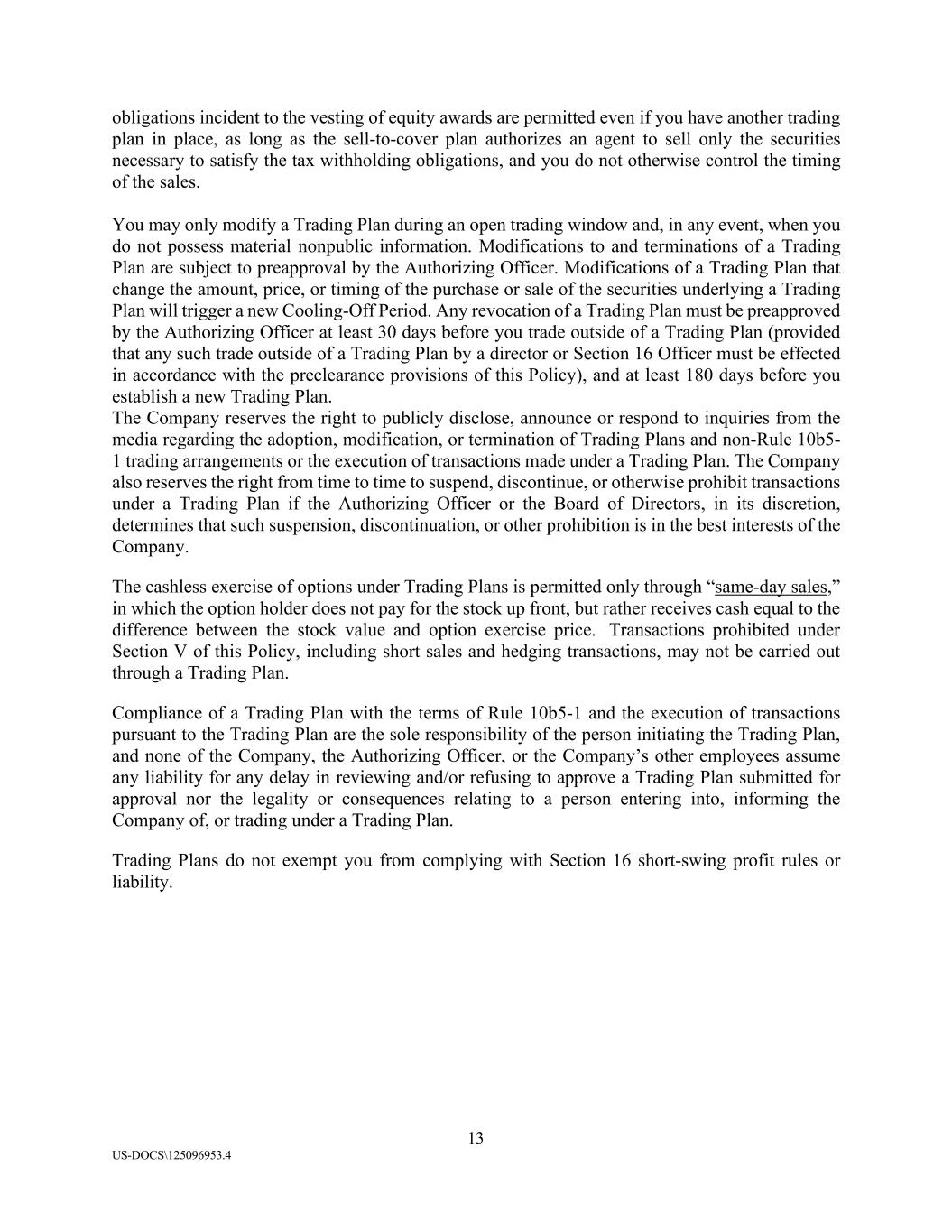13 US-DOCS\125096953.4 obligations incident to the vesting of equity awards are permitted even if you have another trading plan in place, as long as the sell-to-cover plan authorizes an agent to sell only the securities necessary to satisfy the tax withholding obligations, and you do not otherwise control the timing of the sales. You may only modify a Trading Plan during an open trading window and, in any event, when you do not possess material nonpublic information. Modifications to and terminations of a Trading Plan are subject to preapproval by the Authorizing Officer. Modifications of a Trading Plan that change the amount, price, or timing of the purchase or sale of the securities underlying a Trading Plan will trigger a new Cooling-Off Period. Any revocation of a Trading Plan must be preapproved by the Authorizing Officer at least 30 days before you trade outside of a Trading Plan (provided that any such trade outside of a Trading Plan by a director or Section 16 Officer must be effected in accordance with the preclearance provisions of this Policy), and at least 180 days before you establish a new Trading Plan. The Company reserves the right to publicly disclose, announce or respond to inquiries from the media regarding the adoption, modification, or termination of Trading Plans and non-Rule 10b5- 1 trading arrangements or the execution of transactions made under a Trading Plan. The Company also reserves the right from time to time to suspend, discontinue, or otherwise prohibit transactions under a Trading Plan if the Authorizing Officer or the Board of Directors, in its discretion, determines that such suspension, discontinuation, or other prohibition is in the best interests of the Company. The cashless exercise of options under Trading Plans is permitted only through “same-day sales,” in which the option holder does not pay for the stock up front, but rather receives cash equal to the difference between the stock value and option exercise price. Transactions prohibited under Section V of this Policy, including short sales and hedging transactions, may not be carried out through a Trading Plan. Compliance of a Trading Plan with the terms of Rule 10b5-1 and the execution of transactions pursuant to the Trading Plan are the sole responsibility of the person initiating the Trading Plan, and none of the Company, the Authorizing Officer, or the Company’s other employees assume any liability for any delay in reviewing and/or refusing to approve a Trading Plan submitted for approval nor the legality or consequences relating to a person entering into, informing the Company of, or trading under a Trading Plan. Trading Plans do not exempt you from complying with Section 16 short-swing profit rules or liability.