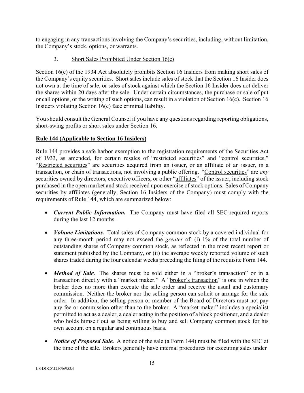 15 US-DOCS\125096953.4 to engaging in any transactions involving the Company’s securities, including, without limitation, the Company’s stock, options, or warrants. 3. Short Sales Prohibited Under Section 16(c) Section 16(c) of the 1934 Act absolutely prohibits Section 16 Insiders from making short sales of the Company’s equity securities. Short sales include sales of stock that the Section 16 Insider does not own at the time of sale, or sales of stock against which the Section 16 Insider does not deliver the shares within 20 days after the sale. Under certain circumstances, the purchase or sale of put or call options, or the writing of such options, can result in a violation of Section 16(c). Section 16 Insiders violating Section 16(c) face criminal liability. You should consult the General Counsel if you have any questions regarding reporting obligations, short-swing profits or short sales under Section 16. Rule 144 (Applicable to Section 16 Insiders) Rule 144 provides a safe harbor exemption to the registration requirements of the Securities Act of 1933, as amended, for certain resales of “restricted securities” and “control securities.” “Restricted securities” are securities acquired from an issuer, or an affiliate of an issuer, in a transaction, or chain of transactions, not involving a public offering. “Control securities” are any securities owned by directors, executive officers, or other “affiliates” of the issuer, including stock purchased in the open market and stock received upon exercise of stock options. Sales of Company securities by affiliates (generally, Section 16 Insiders of the Company) must comply with the requirements of Rule 144, which are summarized below: • Current Public Information. The Company must have filed all SEC-required reports during the last 12 months. • Volume Limitations. Total sales of Company common stock by a covered individual for any three-month period may not exceed the greater of: (i) 1% of the total number of outstanding shares of Company common stock, as reflected in the most recent report or statement published by the Company, or (ii) the average weekly reported volume of such shares traded during the four calendar weeks preceding the filing of the requisite Form 144. • Method of Sale. The shares must be sold either in a “broker’s transaction” or in a transaction directly with a “market maker.” A “broker’s transaction” is one in which the broker does no more than execute the sale order and receive the usual and customary commission. Neither the broker nor the selling person can solicit or arrange for the sale order. In addition, the selling person or member of the Board of Directors must not pay any fee or commission other than to the broker. A “market maker” includes a specialist permitted to act as a dealer, a dealer acting in the position of a block positioner, and a dealer who holds himself out as being willing to buy and sell Company common stock for his own account on a regular and continuous basis. • Notice of Proposed Sale. A notice of the sale (a Form 144) must be filed with the SEC at the time of the sale. Brokers generally have internal procedures for executing sales under