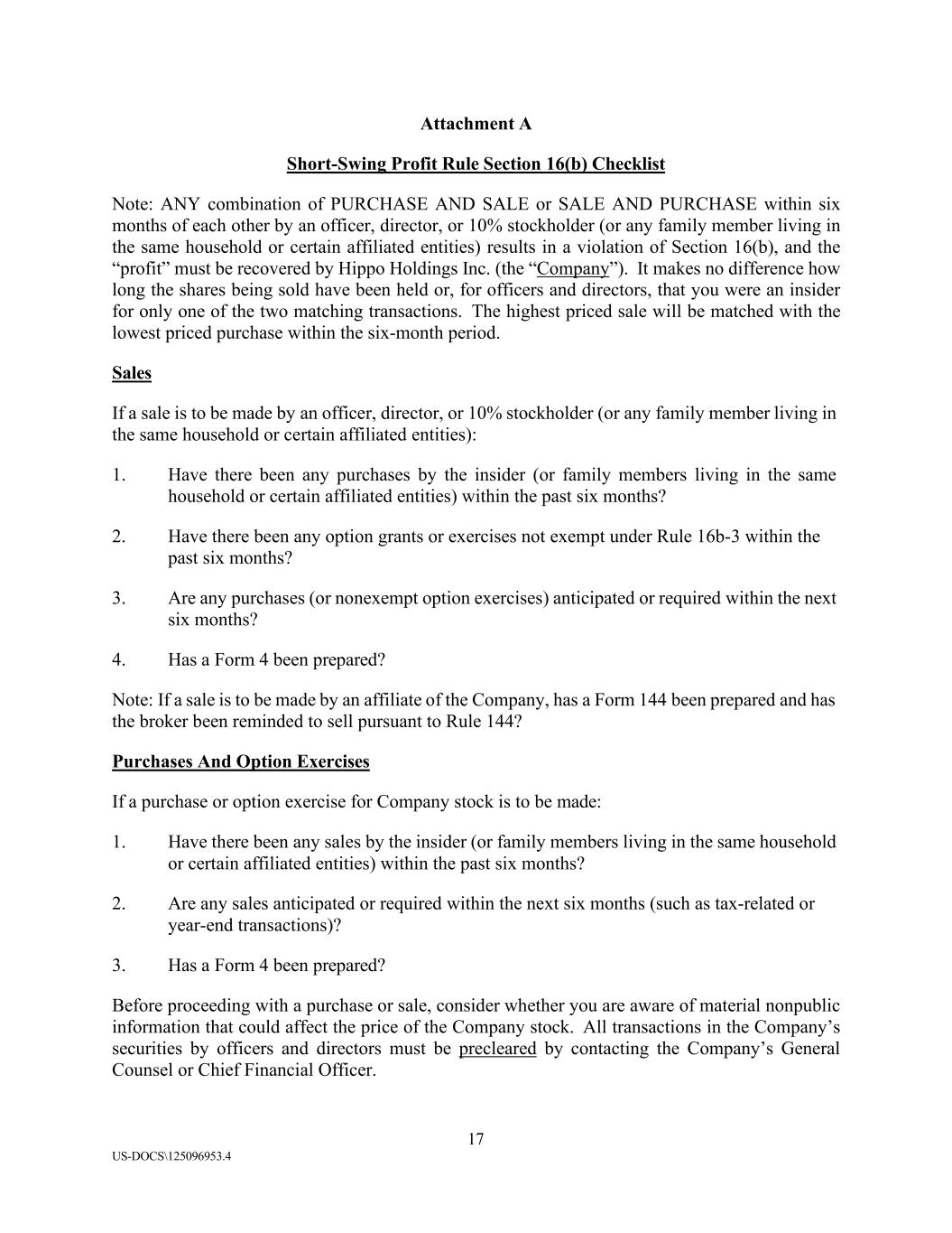 17 US-DOCS\125096953.4 Attachment A Short-Swing Profit Rule Section 16(b) Checklist Note: ANY combination of PURCHASE AND SALE or SALE AND PURCHASE within six months of each other by an officer, director, or 10% stockholder (or any family member living in the same household or certain affiliated entities) results in a violation of Section 16(b), and the “profit” must be recovered by Hippo Holdings Inc. (the “Company”). It makes no difference how long the shares being sold have been held or, for officers and directors, that you were an insider for only one of the two matching transactions. The highest priced sale will be matched with the lowest priced purchase within the six-month period. Sales If a sale is to be made by an officer, director, or 10% stockholder (or any family member living in the same household or certain affiliated entities): 1. Have there been any purchases by the insider (or family members living in the same household or certain affiliated entities) within the past six months? 2. Have there been any option grants or exercises not exempt under Rule 16b-3 within the past six months? 3. Are any purchases (or nonexempt option exercises) anticipated or required within the next six months? 4. Has a Form 4 been prepared? Note: If a sale is to be made by an affiliate of the Company, has a Form 144 been prepared and has the broker been reminded to sell pursuant to Rule 144? Purchases And Option Exercises If a purchase or option exercise for Company stock is to be made: 1. Have there been any sales by the insider (or family members living in the same household or certain affiliated entities) within the past six months? 2. Are any sales anticipated or required within the next six months (such as tax-related or year-end transactions)? 3. Has a Form 4 been prepared? Before proceeding with a purchase or sale, consider whether you are aware of material nonpublic information that could affect the price of the Company stock. All transactions in the Company’s securities by officers and directors must be precleared by contacting the Company’s General Counsel or Chief Financial Officer.