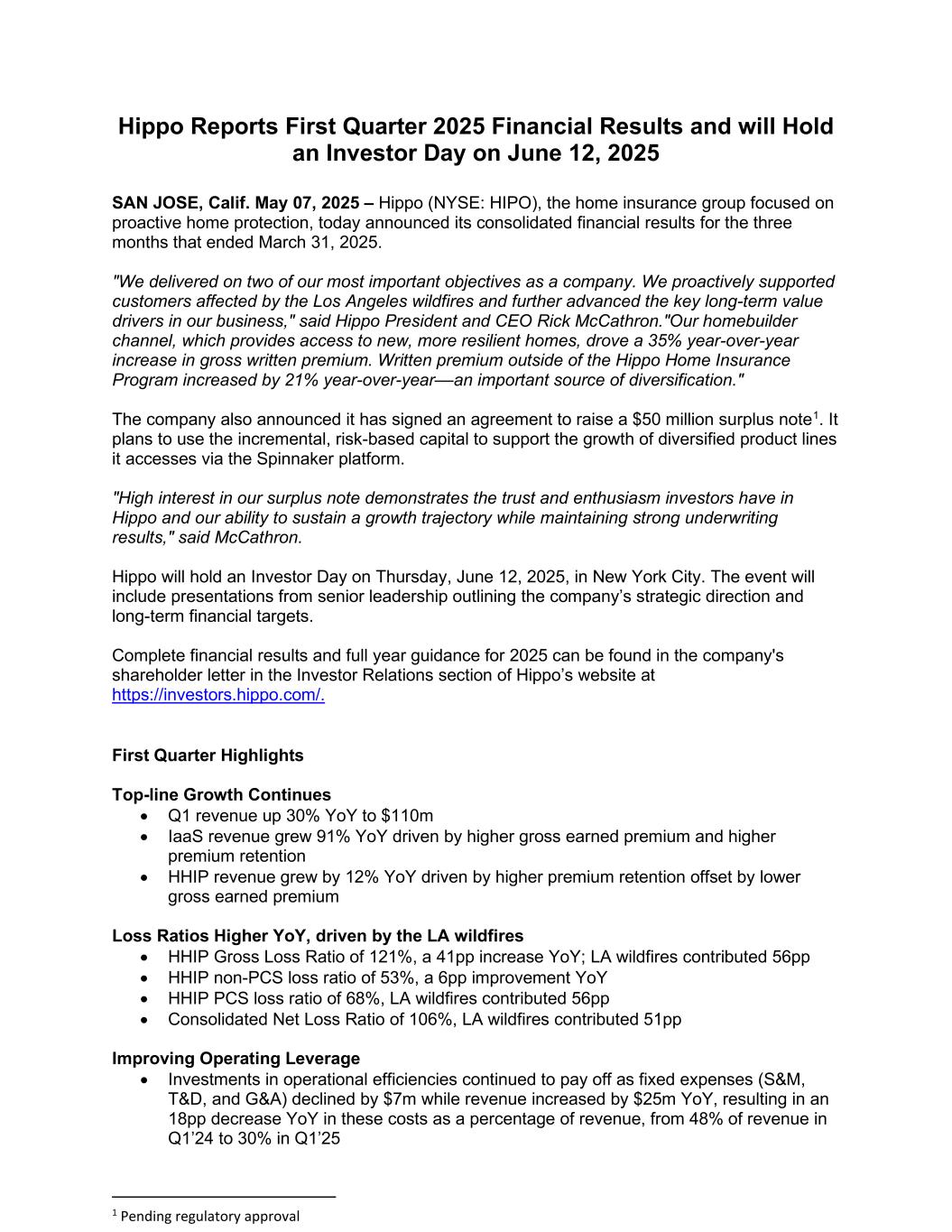 Hippo Reports First Quarter 2025 Financial Results and will Hold an Investor Day on June 12, 2025 SAN JOSE, Calif. May 07, 2025 – Hippo (NYSE: HIPO), the home insurance group focused on proactive home protection, today announced its consolidated financial results for the three months that ended March 31, 2025. "We delivered on two of our most important objectives as a company. We proactively supported customers affected by the Los Angeles wildfires and further advanced the key long-term value drivers in our business," said Hippo President and CEO Rick McCathron."Our homebuilder channel, which provides access to new, more resilient homes, drove a 35% year-over-year increase in gross written premium. Written premium outside of the Hippo Home Insurance Program increased by 21% year-over-year––an important source of diversification." The company also announced it has signed an agreement to raise a $50 million surplus note1. It plans to use the incremental, risk-based capital to support the growth of diversified product lines it accesses via the Spinnaker platform. "High interest in our surplus note demonstrates the trust and enthusiasm investors have in Hippo and our ability to sustain a growth trajectory while maintaining strong underwriting results," said McCathron. Hippo will hold an Investor Day on Thursday, June 12, 2025, in New York City. The event will include presentations from senior leadership outlining the company’s strategic direction and long-term financial targets. Complete financial results and full year guidance for 2025 can be found in the company's shareholder letter in the Investor Relations section of Hippo’s website at https://investors.hippo.com/. First Quarter Highlights Top-line Growth Continues • Q1 revenue up 30% YoY to $110m • IaaS revenue grew 91% YoY driven by higher gross earned premium and higher premium retention • HHIP revenue grew by 12% YoY driven by higher premium retention offset by lower gross earned premium Loss Ratios Higher YoY, driven by the LA wildfires • HHIP Gross Loss Ratio of 121%, a 41pp increase YoY; LA wildfires contributed 56pp • HHIP non-PCS loss ratio of 53%, a 6pp improvement YoY • HHIP PCS loss ratio of 68%, LA wildfires contributed 56pp • Consolidated Net Loss Ratio of 106%, LA wildfires contributed 51pp Improving Operating Leverage • Investments in operational efficiencies continued to pay off as fixed expenses (S&M, T&D, and G&A) declined by $7m while revenue increased by $25m YoY, resulting in an 18pp decrease YoY in these costs as a percentage of revenue, from 48% of revenue in Q1’24 to 30% in Q1’25 1 Pending regulatory approval