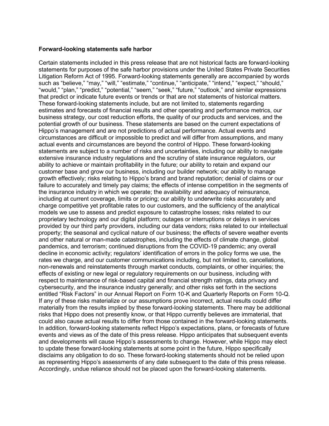 Forward-looking statements safe harbor Certain statements included in this press release that are not historical facts are forward-looking statements for purposes of the safe harbor provisions under the United States Private Securities Litigation Reform Act of 1995. Forward-looking statements generally are accompanied by words such as “believe,” “may,” “will,” “estimate,” “continue,” “anticipate,” “intend,” “expect,” “should,” “would,” “plan,” “predict,” “potential,” “seem,” “seek,” “future,” “outlook,” and similar expressions that predict or indicate future events or trends or that are not statements of historical matters. These forward-looking statements include, but are not limited to, statements regarding estimates and forecasts of financial results and other operating and performance metrics, our business strategy, our cost reduction efforts, the quality of our products and services, and the potential growth of our business. These statements are based on the current expectations of Hippo’s management and are not predictions of actual performance. Actual events and circumstances are difficult or impossible to predict and will differ from assumptions, and many actual events and circumstances are beyond the control of Hippo. These forward-looking statements are subject to a number of risks and uncertainties, including our ability to navigate extensive insurance industry regulations and the scrutiny of state insurance regulators, our ability to achieve or maintain profitability in the future; our ability to retain and expand our customer base and grow our business, including our builder network; our ability to manage growth effectively; risks relating to Hippo’s brand and brand reputation; denial of claims or our failure to accurately and timely pay claims; the effects of intense competition in the segments of the insurance industry in which we operate; the availability and adequacy of reinsurance, including at current coverage, limits or pricing; our ability to underwrite risks accurately and charge competitive yet profitable rates to our customers, and the sufficiency of the analytical models we use to assess and predict exposure to catastrophe losses; risks related to our proprietary technology and our digital platform; outages or interruptions or delays in services provided by our third party providers, including our data vendors; risks related to our intellectual property; the seasonal and cyclical nature of our business; the effects of severe weather events and other natural or man-made catastrophes, including the effects of climate change, global pandemics, and terrorism; continued disruptions from the COVID-19 pandemic; any overall decline in economic activity; regulators’ identification of errors in the policy forms we use, the rates we charge, and our customer communications including, but not limited to, cancellations, non-renewals and reinstatements through market conducts, complaints, or other inquiries; the effects of existing or new legal or regulatory requirements on our business, including with respect to maintenance of risk-based capital and financial strength ratings, data privacy and cybersecurity, and the insurance industry generally; and other risks set forth in the sections entitled “Risk Factors” in our Annual Report on Form 10-K and Quarterly Reports on Form 10-Q. If any of these risks materialize or our assumptions prove incorrect, actual results could differ materially from the results implied by these forward-looking statements. There may be additional risks that Hippo does not presently know, or that Hippo currently believes are immaterial, that could also cause actual results to differ from those contained in the forward-looking statements. In addition, forward-looking statements reflect Hippo’s expectations, plans, or forecasts of future events and views as of the date of this press release. Hippo anticipates that subsequent events and developments will cause Hippo’s assessments to change. However, while Hippo may elect to update these forward-looking statements at some point in the future, Hippo specifically disclaims any obligation to do so. These forward-looking statements should not be relied upon as representing Hippo’s assessments of any date subsequent to the date of this press release. Accordingly, undue reliance should not be placed upon the forward-looking statements.