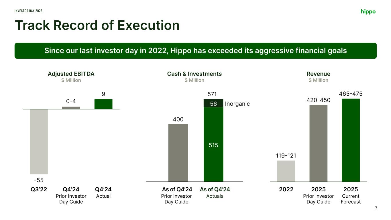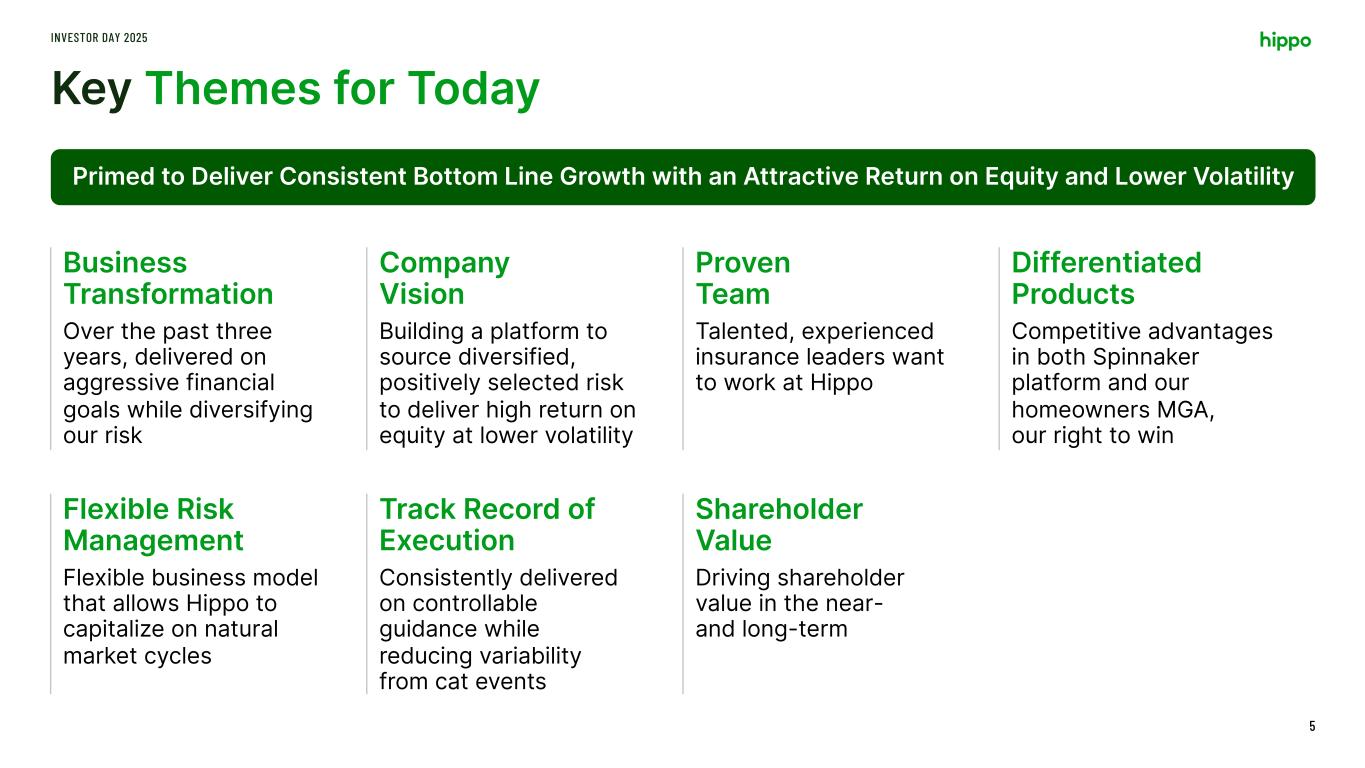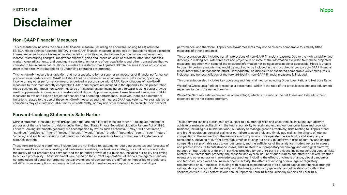 Disclaimer INVESTOR DAY 2025 2 This presentation includes the non-GAAP financial measure (including on a forward-looking basis) Adjusted EBITDA. Hippo defines Adjusted EBITDA, a non-GAAP financial measure, as net loss attributable to Hippo excluding interest expense, income tax expense, depreciation, amortization, stock-based compensation, net investment income, restructuring charges, impairment expense, gains and losses on sales of business, other non-cash fair market value adjustments, and contingent consideration for one of our acquisitions and other transactions that we consider to be unique in nature. Hippo excludes these items from Adjusted EBITDA because it does not consider them to be directly attributable to its underlying operating performance. This non-GAAP measure is an addition, and not a substitute for, or superior to, measures of financial performance prepared in accordance with GAAP and should not be considered as an alternative to net income, operating income or any other performance measures derived in accordance with GAAP. Reconciliations of non-GAAP measures to their most directly comparable GAAP counterparts are included in the Appendix to this presentation. Hippo believes that these non-GAAP measures of financial results (including on a forward-looking basis) provide useful supplemental information to investors about Hippo. Hippo’s management uses forward looking non- GAAP measures to evaluate Hippo’s projected financial and operating performance. However, there are a number of limitations related to the use of these non-GAAP measures and their nearest GAAP equivalents. For example, other companies may calculate non-GAAP measures differently, or may use other measures to calculate their financial performance, and therefore Hippo’s non-GAAP measures may not be directly comparable to similarly titled measures of other companies. This presentation also includes certain projections of non-GAAP financial measures. Due to the high variability and difficulty in making accurate forecasts and projections of some of the information excluded from these projected measures, together with some of the excluded information not being ascertainable or accessible, Hippo is unable to quantify certain amounts that would be required to be included in the most directly comparable GAAP financial measures without unreasonable effort. Consequently, no disclosure of estimated comparable GAAP measures is included, and no reconciliation of the forward-looking non-GAAP financial measures is included. This presentation also includes key operating and financial metrics including Gross Loss Ratio and Net Loss Ratio. We define Gross Loss Ratio expressed as a percentage, which is the ratio of the gross losses and loss adjustment expenses to the gross earned premium. We define Net Loss Ratio expressed as a percentage, which is the ratio of the net losses and loss adjustment expenses to the net earned premium. Non-GAAP Financial Measures Certain statements included in this presentation that are not historical facts are forward-looking statements for purposes of the safe harbor provisions under the United States Private Securities Litigation Reform Act of 1995. Forward-looking statements generally are accompanied by words such as “believe,” “may,” “will,” “estimate,” “continue,” “anticipate,” “intend,” “expect,” “should,” “would,” “plan,” “predict,” “potential,” “seem,” “seek,” “future,” “outlook,” and similar expressions that predict or indicate future events or trends or that are not statements of historical matters. These forward-looking statements include, but are not limited to, statements regarding estimates and forecasts of financial results and other operating and performance metrics, our business strategy, our cost reduction efforts, the quality of our products and services, and the potential growth of our business, including our ability and timing to achieve profitability. These statements are based on the current expectations of Hippo’s management and are not predictions of actual performance. Actual events and circumstances are difficult or impossible to predict and will differ from assumptions, and many actual events and circumstances are beyond the control of Hippo. These forward-looking statements are subject to a number of risks and uncertainties, including our ability to achieve or maintain profitability in the future; our ability to retain and expand our customer base and grow our business, including our builder network; our ability to manage growth effectively; risks relating to Hippo’s brand and brand reputation; denial of claims or our failure to accurately and timely pay claims; the effects of intense competition in the segments of the insurance industry in which we operate; the availability and adequacy of reinsurance, including at current coverage, limits or pricing; our ability to underwrite risks accurately and charge competitive yet profitable rates to our customers, and the sufficiency of the analytical models we use to assess and predict exposure to catastrophe losses; risks related to our proprietary technology and our digital platform; outages or interruptions or delays in services provided by our third party providers, including our data vendor; risks related to our intellectual property; the seasonal and cyclical nature of our business; the effects of severe weather events and other natural or man-made catastrophes, including the effects of climate change, global pandemics, and terrorism; any overall decline in economic activity; the effects of existing or new legal or regulatory requirements on our business, including with respect to maintenance of risk-based capital and financial strength ratings, data privacy and cybersecurity, and the insurance industry generally; and other risks set forth in the sections entitled “Risk Factors” in our Annual Report on Form 10-K and Quarterly Reports on