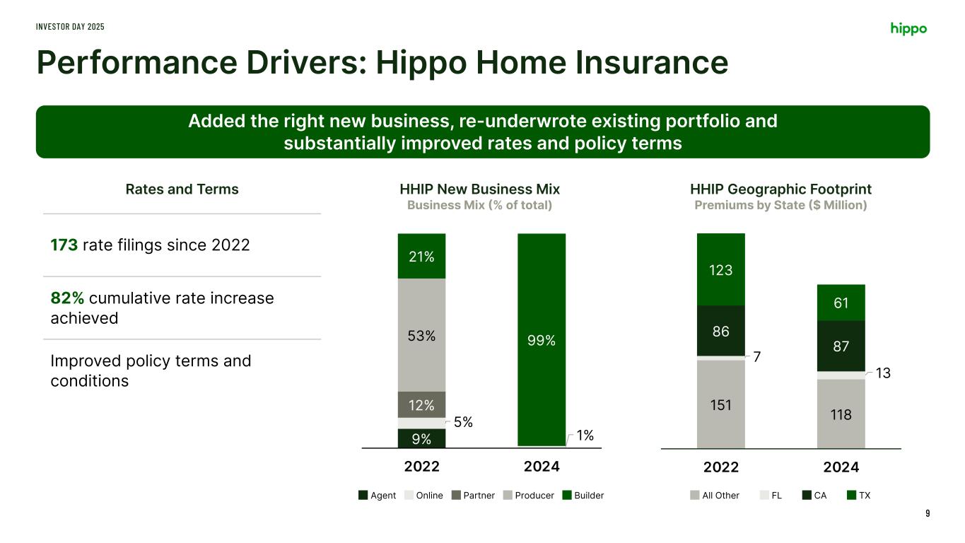Path to Positive Adjusted EBITDA INVESTOR DAY 2025 8 Pulling key levers for profitability at scale Q3’22 Q4’24 Adjusted EBITDA Improved HHIP Underwriting Profit Operating Leverage Scale-up Insurance-as -a-Service Scale-up Services Adjusted EBITDA 32 21 7 -55 3 9 Improved gross loss ratio, reduced volatility, and better risk selection and pricing Driven by automation, optimized footprint, and leaner operations Scaling premium by ~3x while improving UW performance Growth in non-Hippo policies placed through our Agency Key Drivers 1 2 3 4 1 2 3 4 Adjusted EBITDA Walk $ Million