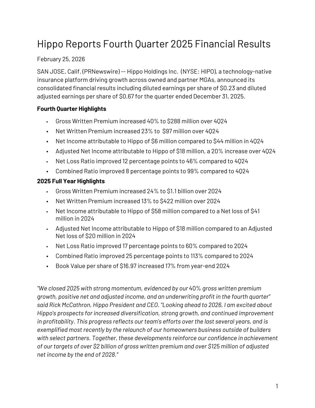 Hippo Reports Fourth Quarter 2025 Financial Results February 25, 2026 SAN JOSE, Calif. (PRNewswire) -- Hippo Holdings Inc. (NYSE: HIPO), a technology-native insurance platform driving growth across owned and partner MGAs, announced its consolidated financial results including diluted earnings per share of $0.23 and diluted adjusted earnings per share of $0.67 for the quarter ended December 31, 2025. Fourth Quarter Highlights • Gross Written Premium increased 40% to $288 million over 4Q24 • Net Written Premium increased 23% to $97 million over 4Q24 • Net Income attributable to Hippo of $6 million compared to $44 million in 4Q24 • Adjusted Net Income attributable to Hippo of $18 million, a 20% increase over 4Q24 • Net Loss Ratio improved 12 percentage points to 46% compared to 4Q24 • Combined Ratio improved 8 percentage points to 99% compared to 4Q24 2025 Full Year Highlights • Gross Written Premium increased 24% to $1.1 billion over 2024 • Net Written Premium increased 13% to $422 million over 2024 • Net Income attributable to Hippo of $58 million compared to a Net loss of $41 million in 2024 • Adjusted Net Income attributable to Hippo of $18 million compared to an Adjusted Net loss of $20 million in 2024 • Net Loss Ratio improved 17 percentage points to 60% compared to 2024 • Combined Ratio improved 25 percentage points to 113% compared to 2024 • Book Value per share of $16.97 increased 17% from year-end 2024 "We closed 2025 with strong momentum, evidenced by our 40% gross written premium growth, positive net and adjusted income, and an underwriting profit in the fourth quarter” said Rick McCathron, Hippo President and CEO. “Looking ahead to 2026, I am excited about Hippo's prospects for increased diversification, strong growth, and continued improvement in profitability. This progress reflects our team's efforts over the last several years, and is exemplified most recently by the relaunch of our homeowners business outside of builders with select partners. Together, these developments reinforce our confidence in achievement of our targets of over $2 billion of gross written premium and over $125 million of adjusted net income by the end of 2028.” 1