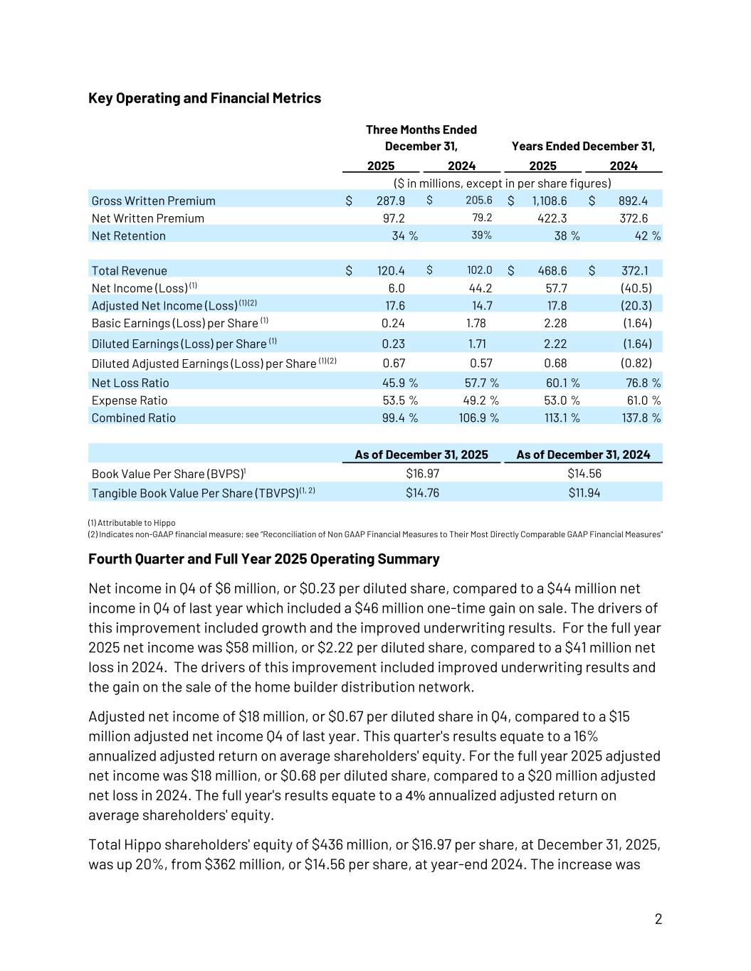 Key Operating and Financial Metrics Three Months Ended December 31, Years Ended December 31, 2025 2024 2025 2024 ($ in millions, except in per share figures) Gross Written Premium $ 287.9 $ 205.6 $ 1,108.6 $ 892.4 Net Written Premium 97.2 79.2 422.3 372.6 Net Retention 34 % 39 % 38 % 42 % Total Revenue $ 120.4 $ 102.0 $ 468.6 $ 372.1 Net Income (Loss) (1) 6.0 44.2 57.7 (40.5) Adjusted Net Income (Loss) (1) (2) 17.6 14.7 17.8 (20.3) Basic Earnings (Loss) per Share (1) 0.24 1.78 2.28 (1.64) Diluted Earnings (Loss) per Share (1) 0.23 1.71 2.22 (1.64) Diluted Adjusted Earnings (Loss) per Share (1) (2) 0.67 0.57 0.68 (0.82) Net Loss Ratio 45.9 % 57.7 % 60.1 % 76.8 % Expense Ratio 53.5 % 49.2 % 53.0 % 61.0 % Combined Ratio 99.4 % 106.9 % 113.1 % 137.8 % As of December 31, 2025 As of December 31, 2024 Book Value Per Share (BVPS)1 $16.97 $14.56 Tangible Book Value Per Share (TBVPS) (1, 2) $14.76 $11.94 (1) Attributable to Hippo (2) Indicates non-GAAP financial measure; see “Reconciliation of Non GAAP Financial Measures to Their Most Directly Comparable GAAP Financial Measures" Fourth Quarter and Full Year 2025 Operating Summary Net income in Q4 of $6 million, or $0.23 per diluted share, compared to a $44 million net income in Q4 of last year which included a $46 million one-time gain on sale. The drivers of this improvement included growth and the improved underwriting results. For the full year 2025 net income was $58 million, or $2.22 per diluted share, compared to a $41 million net loss in 2024. The drivers of this improvement included improved underwriting results and the gain on the sale of the home builder distribution network. Adjusted net income of $18 million, or $0.67 per diluted share in Q4, compared to a $15 million adjusted net income Q4 of last year. This quarter's results equate to a 16% annualized adjusted return on average shareholders' equity. For the full year 2025 adjusted net income was $18 million, or $0.68 per diluted share, compared to a $20 million adjusted net loss in 2024. The full year's results equate to a 4% annualized adjusted return on average shareholders' equity. Total Hippo shareholders' equity of $436 million, or $16.97 per share, at December 31, 2025, was up 20%, from $362 million, or $14.56 per share, at year-end 2024. The increase was 2