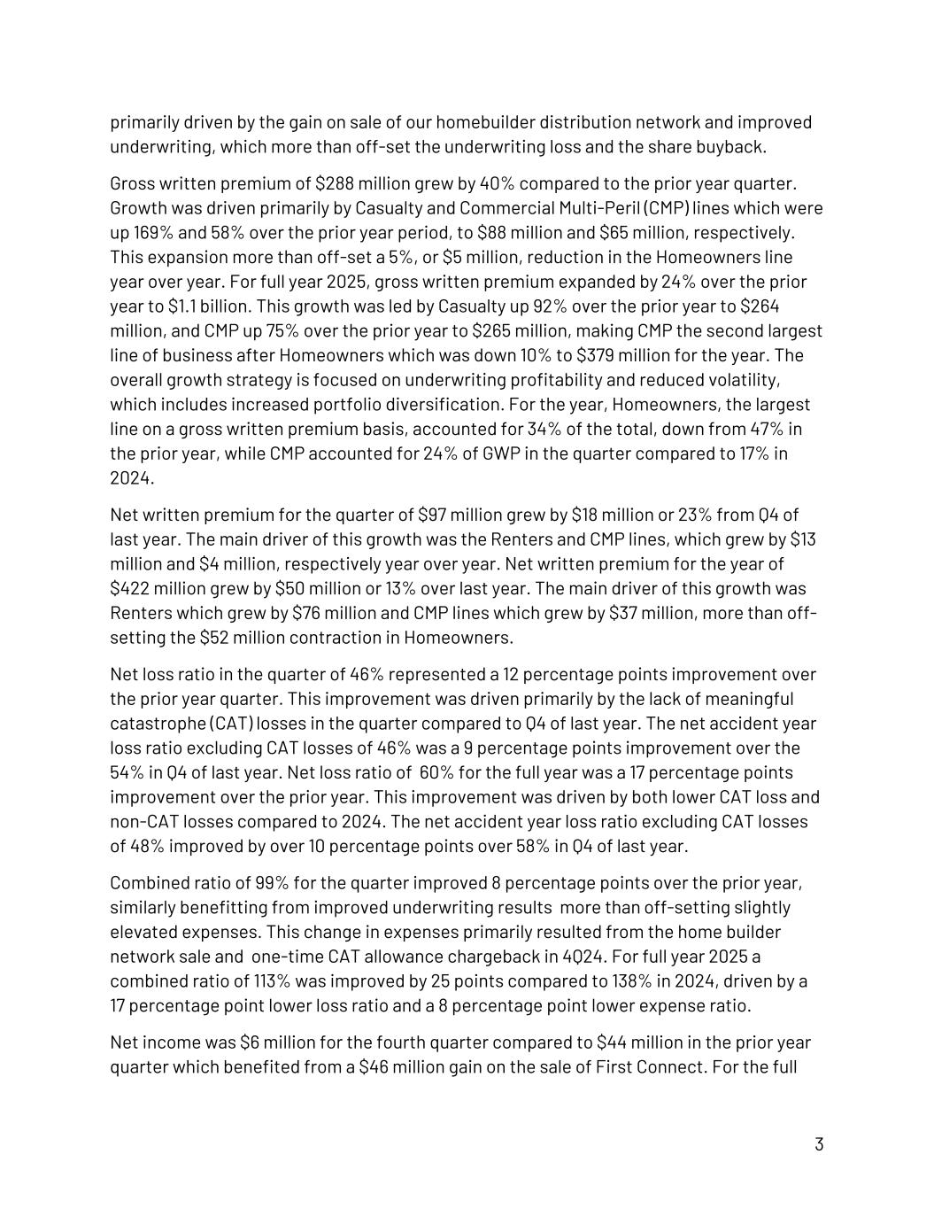 primarily driven by the gain on sale of our homebuilder distribution network and improved underwriting, which more than off-set the underwriting loss and the share buyback. Gross written premium of $288 million grew by 40% compared to the prior year quarter. Growth was driven primarily by Casualty and Commercial Multi-Peril (CMP) lines which were up 169% and 58% over the prior year period, to $88 million and $65 million, respectively. This expansion more than off-set a 5%, or $5 million, reduction in the Homeowners line year over year. For full year 2025, gross written premium expanded by 24% over the prior year to $1.1 billion. This growth was led by Casualty up 92% over the prior year to $264 million, and CMP up 75% over the prior year to $265 million, making CMP the second largest line of business after Homeowners which was down 10% to $379 million for the year. The overall growth strategy is focused on underwriting profitability and reduced volatility, which includes increased portfolio diversification. For the year, Homeowners, the largest line on a gross written premium basis, accounted for 34% of the total, down from 47% in the prior year, while CMP accounted for 24% of GWP in the quarter compared to 17% in 2024. Net written premium for the quarter of $97 million grew by $18 million or 23% from Q4 of last year. The main driver of this growth was the Renters and CMP lines, which grew by $13 million and $4 million, respectively year over year. Net written premium for the year of $422 million grew by $50 million or 13% over last year. The main driver of this growth was Renters which grew by $76 million and CMP lines which grew by $37 million, more than off- setting the $52 million contraction in Homeowners. Net loss ratio in the quarter of 46% represented a 12 percentage points improvement over the prior year quarter. This improvement was driven primarily by the lack of meaningful catastrophe (CAT) losses in the quarter compared to Q4 of last year. The net accident year loss ratio excluding CAT losses of 46% was a 9 percentage points improvement over the 54% in Q4 of last year. Net loss ratio of 60% for the full year was a 17 percentage points improvement over the prior year. This improvement was driven by both lower CAT loss and non-CAT losses compared to 2024. The net accident year loss ratio excluding CAT losses of 48% improved by over 10 percentage points over 58% in Q4 of last year. Combined ratio of 99% for the quarter improved 8 percentage points over the prior year, similarly benefitting from improved underwriting results more than off-setting slightly elevated expenses. This change in expenses primarily resulted from the home builder network sale and one-time CAT allowance chargeback in 4Q24. For full year 2025 a combined ratio of 113% was improved by 25 points compared to 138% in 2024, driven by a 17 percentage point lower loss ratio and a 8 percentage point lower expense ratio. Net income was $6 million for the fourth quarter compared to $44 million in the prior year quarter which benefited from a $46 million gain on the sale of First Connect. For the full 3